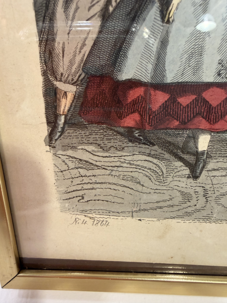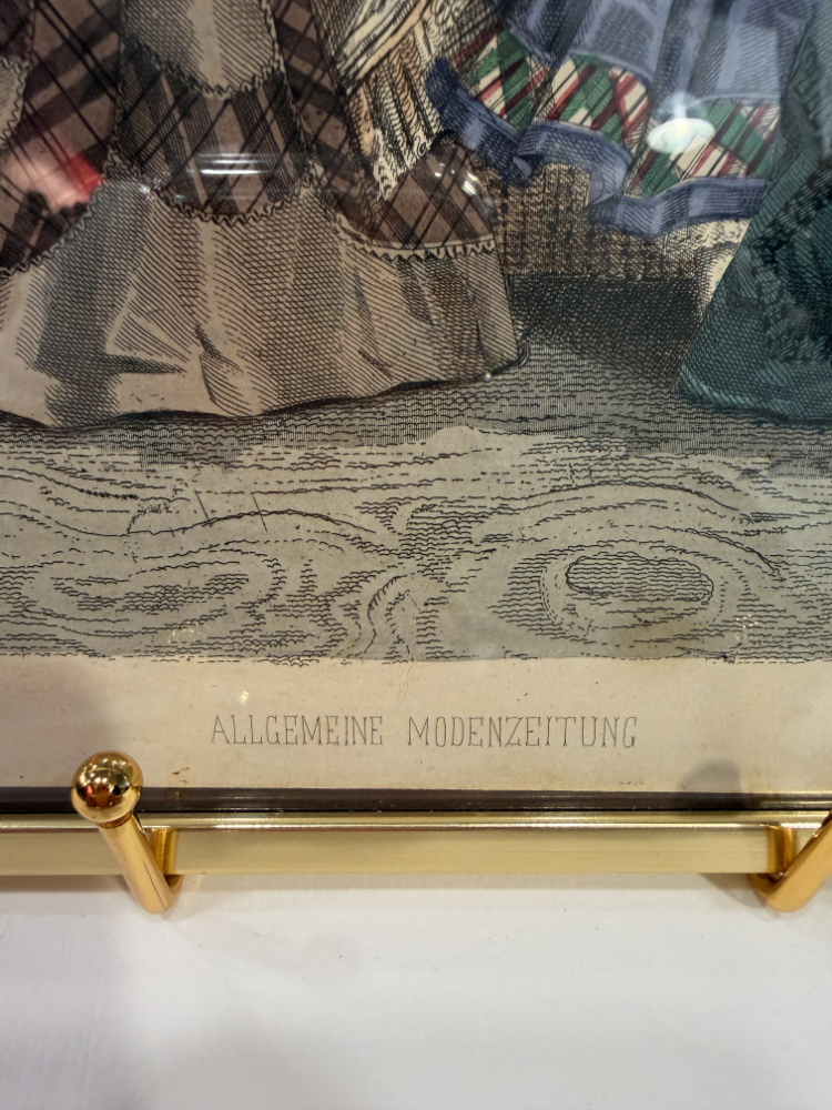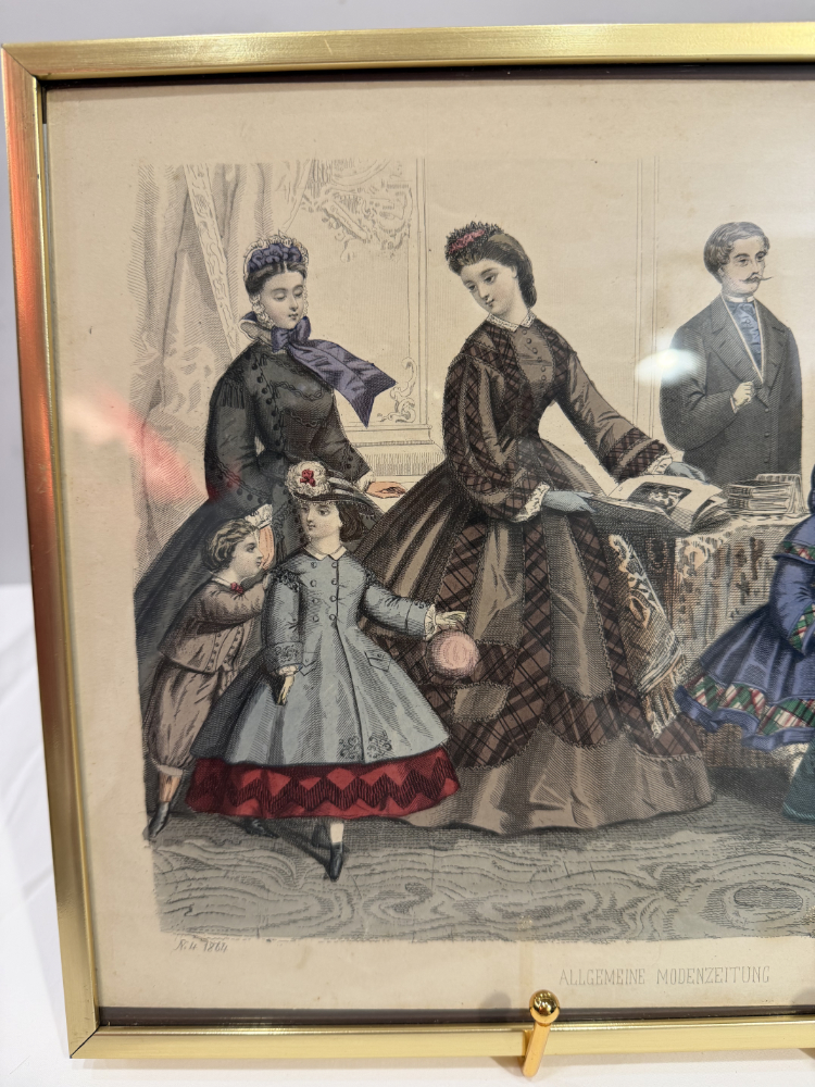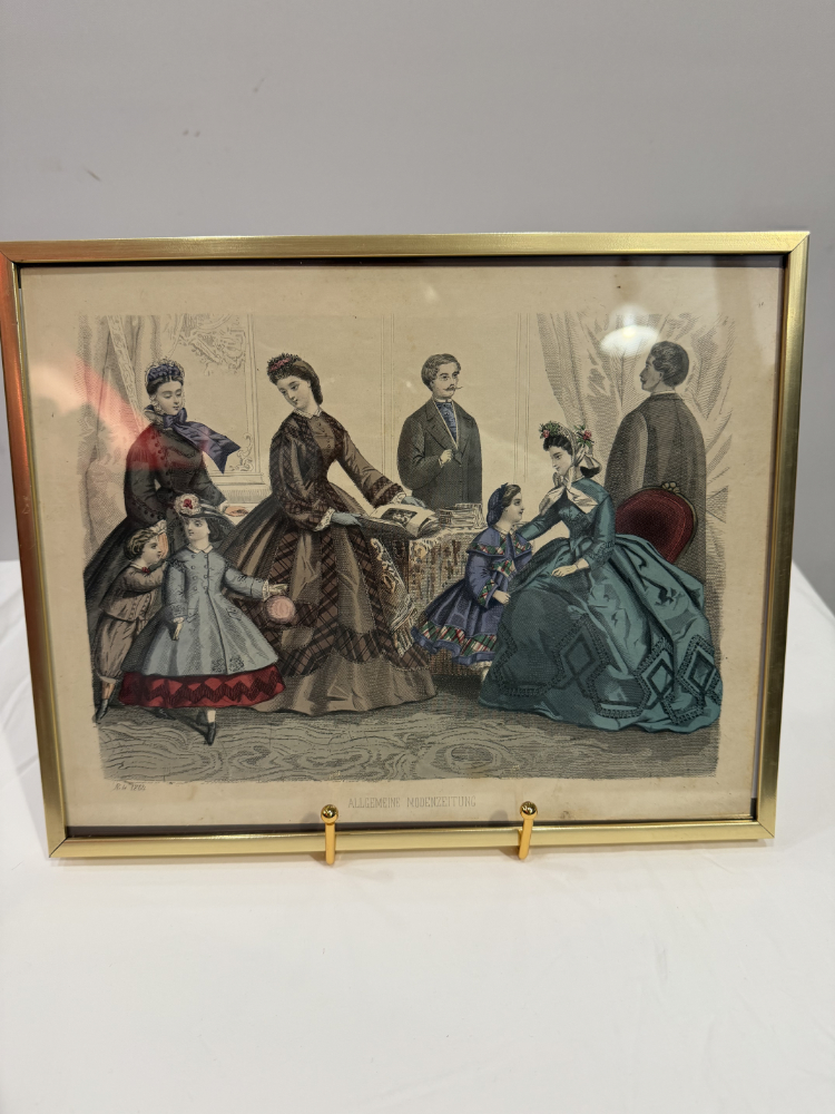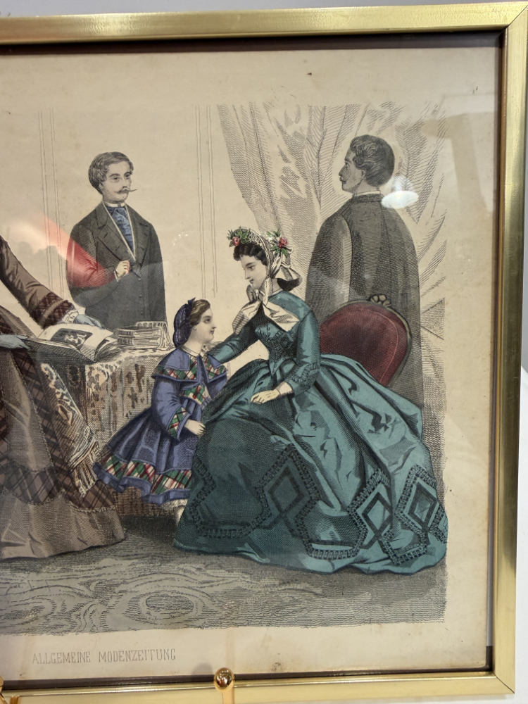 Historische Modegrafik 1864 „Allgemeine Modenzeitung“ – kolorierter Kupferstich im Goldrahmen 30 x 24 cm