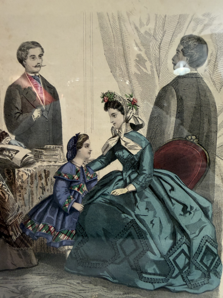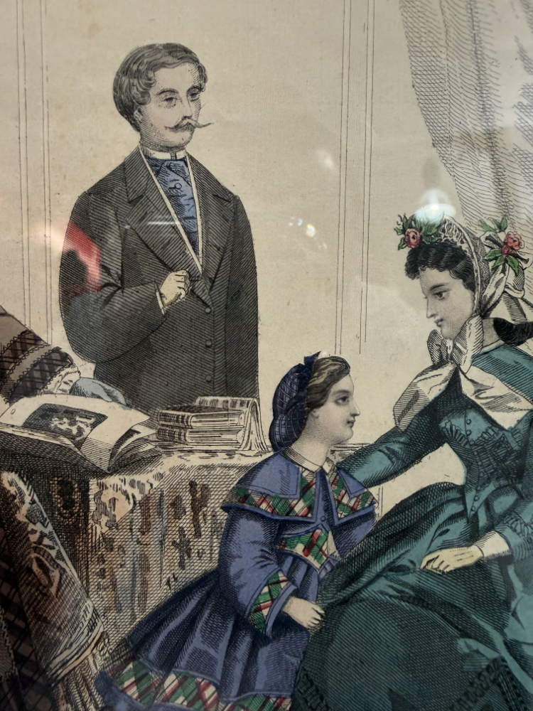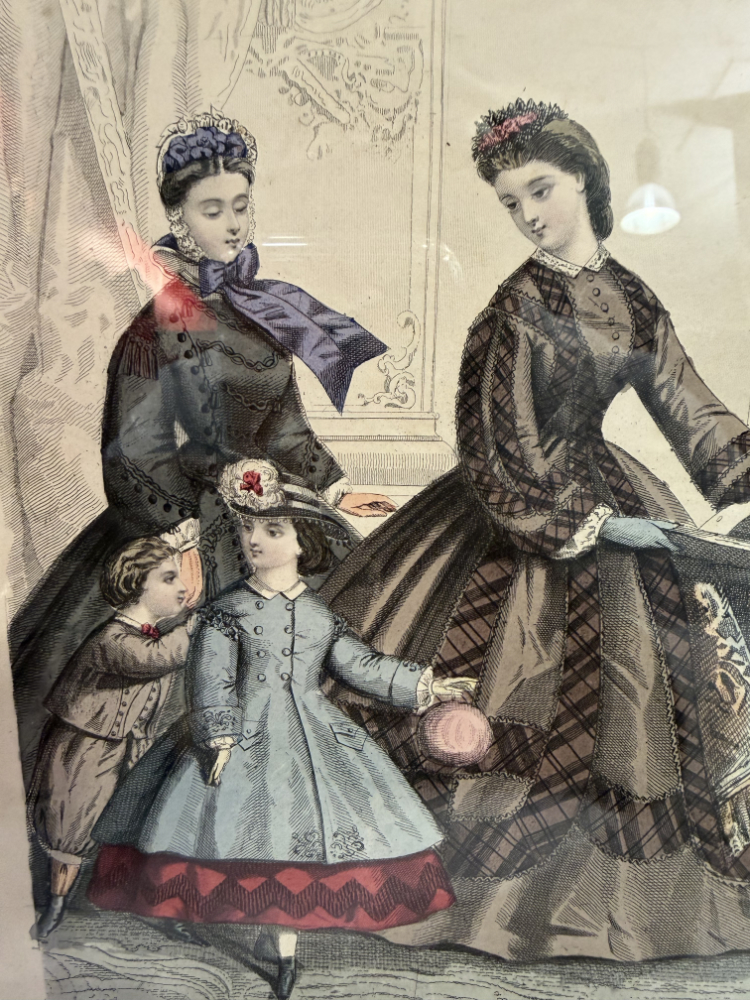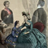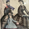 Diese wunderschöne Modegrafik von 1864 stammt aus der Allgemeinen Modenzeitung, einer der bekanntesten Modepublikationen des 19. Jahrhunderts. Dargestellt ist eine elegante Familienszene im Salon: Damen und Kinder in prachtvollen Kleidern, begleitet von zwei Herren im Hintergrund – ein authentisches Bild bürgerlicher Eleganz der 1860er-Jahre.