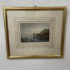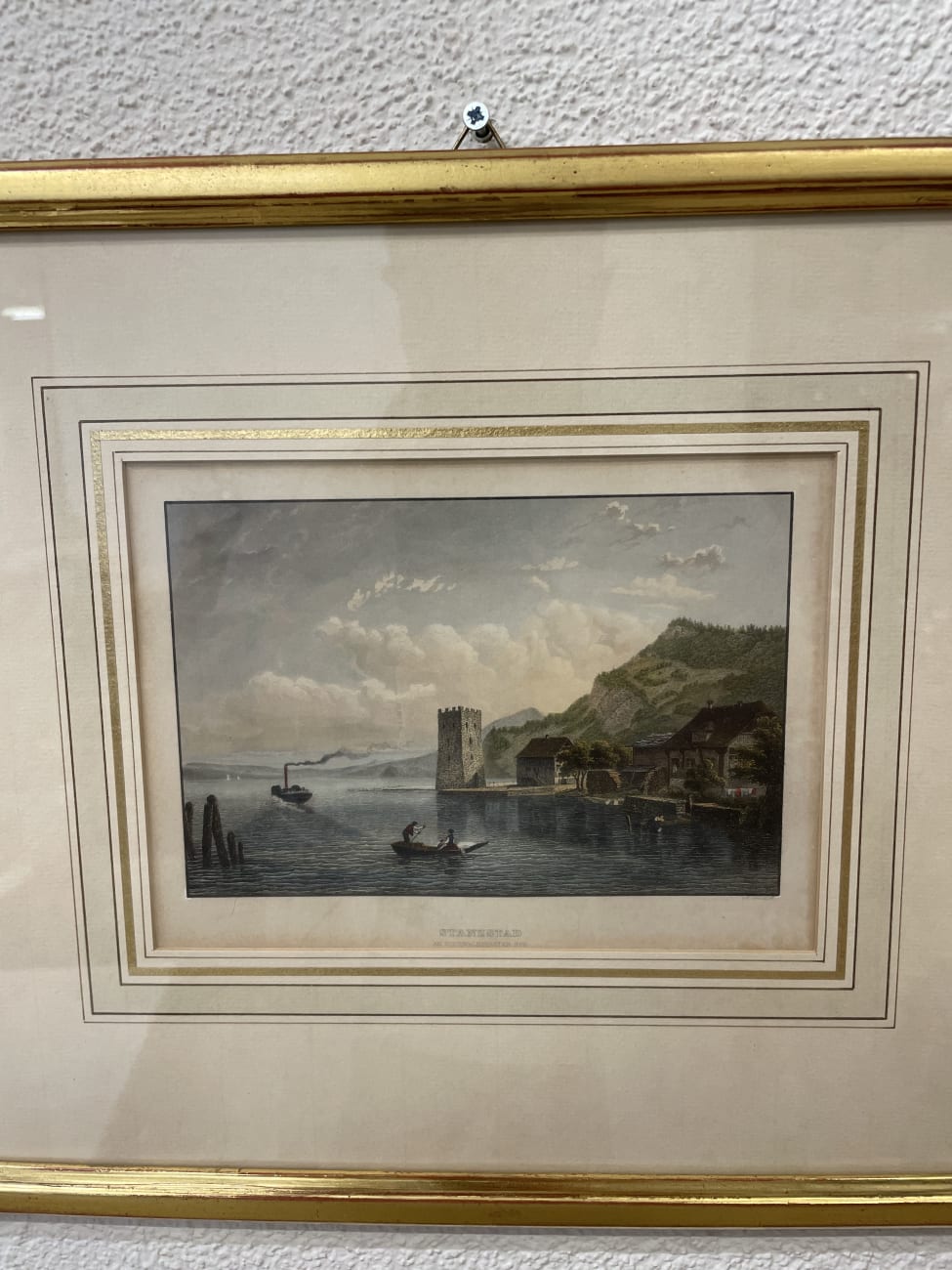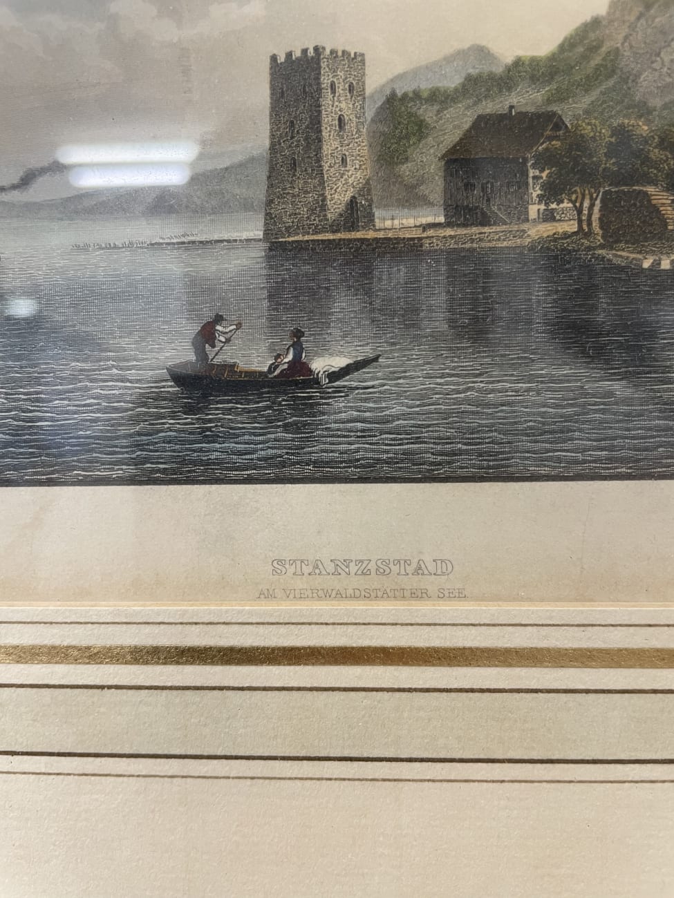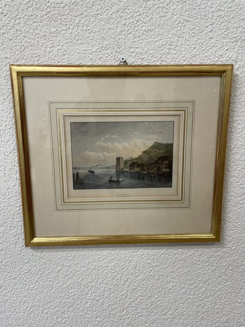 Historische Ansicht von Stanzstad am Vierwaldstättersee mit Turm, Booten und Uferbebauung. Feine Aquarell- oder Drucktechnik mit vielen kleinen Details, vom bewegten Wasser bis zu den Figuren am Ufer. Der helle Holzrahmen mit Glas hat eine dreifarbige Innenbordüre in Gold, Weiss und Beige. Unten ist der Titel „Stansstad am Vierwaldstättersee“ gedruckt.