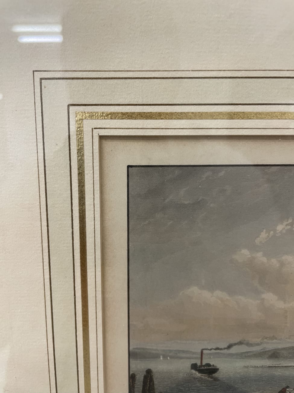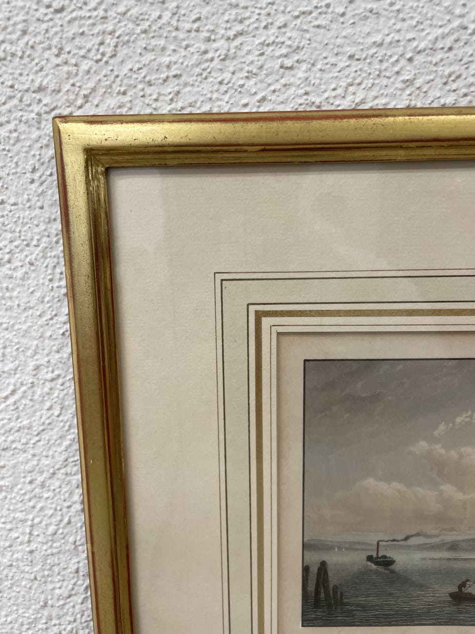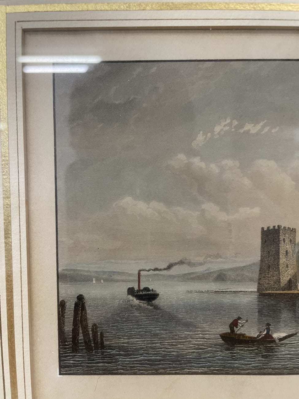 Historische Ansicht von Stanzstad am Vierwaldstättersee mit Turm, Booten und Uferbebauung. Feine Aquarell- oder Drucktechnik mit vielen kleinen Details, vom bewegten Wasser bis zu den Figuren am Ufer. Der helle Holzrahmen mit Glas hat eine dreifarbige Innenbordüre in Gold, Weiss und Beige. Unten ist der Titel „Stansstad am Vierwaldstättersee“ gedruckt.