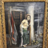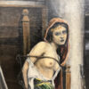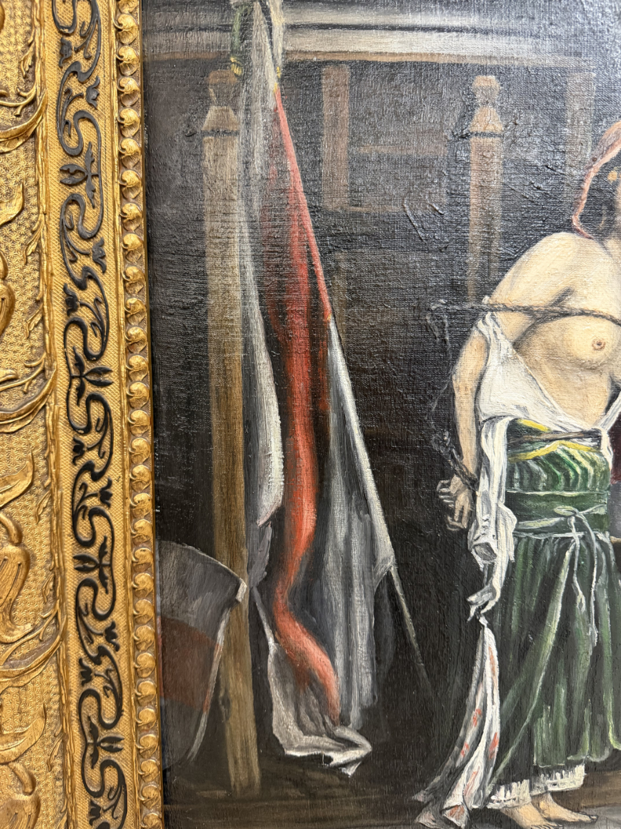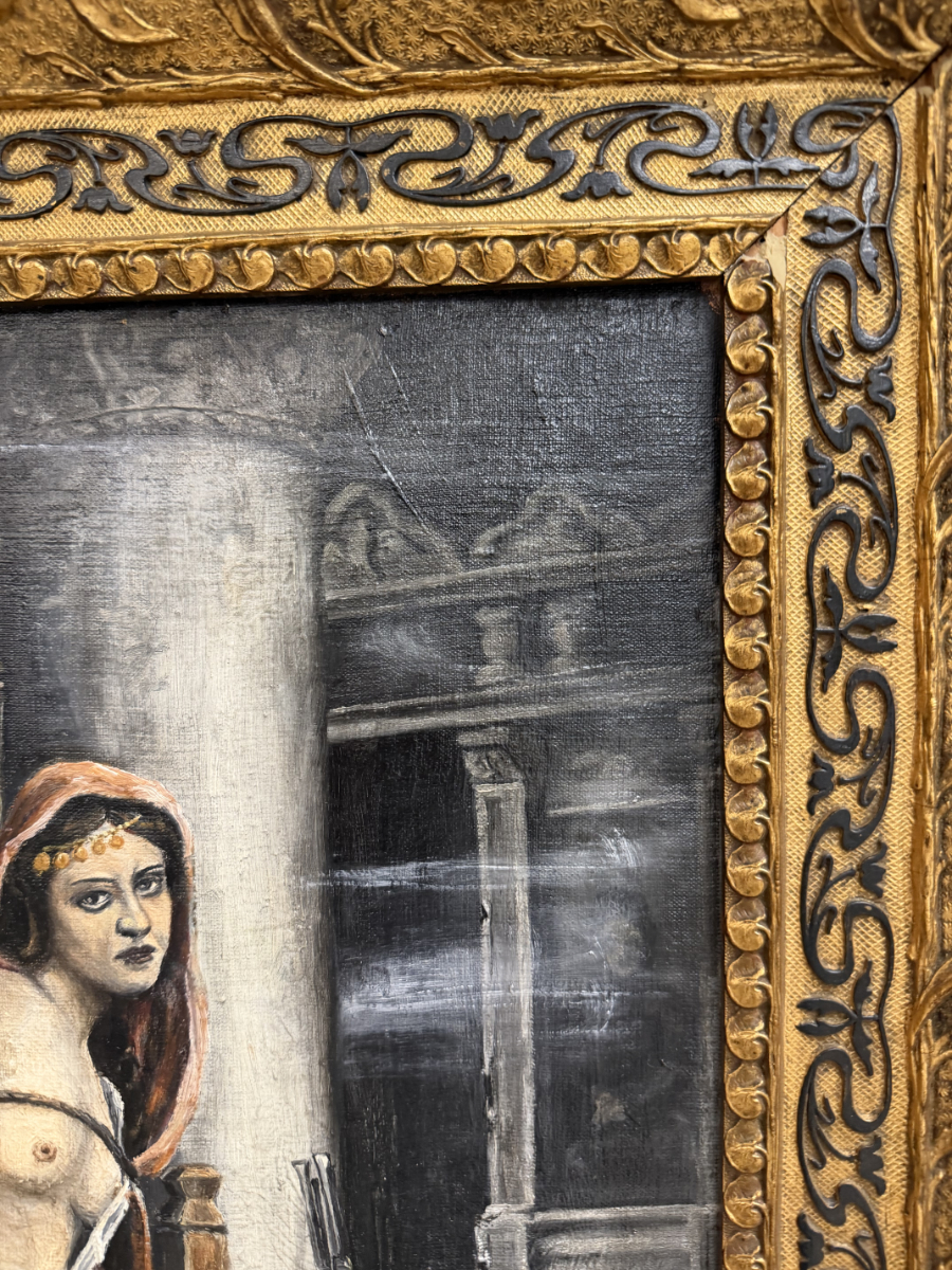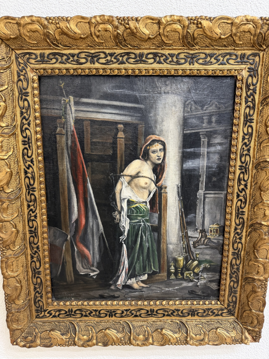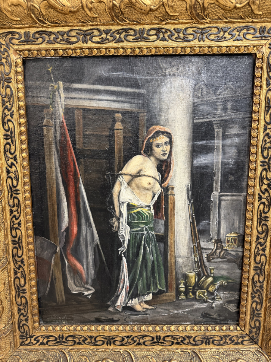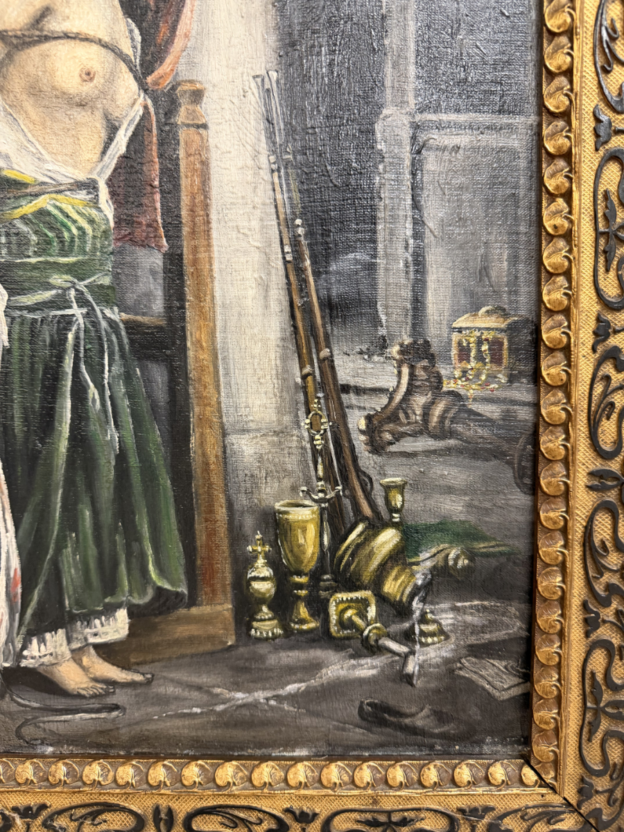 1944 datiert und unten links signiert von A. Künzli zeigt dieses Vintage-Ölbild eine eindrucksvolle, allegorische Figurenszene mit starkem zeitgeschichtlichem Bezug. Im Zentrum steht eine gefesselte junge Frau, halb entkleidet und bewusst in den Fokus gesetzt. Die Darstellung wirkt nicht dekorativ oder erotisch, sondern als Symbol für Unterdrückung, Ohnmacht und moralische Spannungen der Kriegsjahre. Gleichzeitig bleibt die Figur aufrecht und präsent, was dem Werk eine stille, aber klare Aussage von Würde und Widerstand verleiht. Waffen, Fahnen, Architektur und die arrangierten Objekte im Vordergrund verstärken das Gefühl von Macht, Zwang und historischem Umbruch.