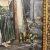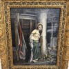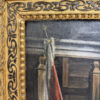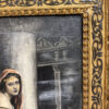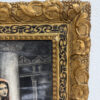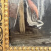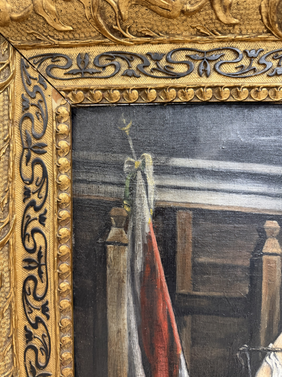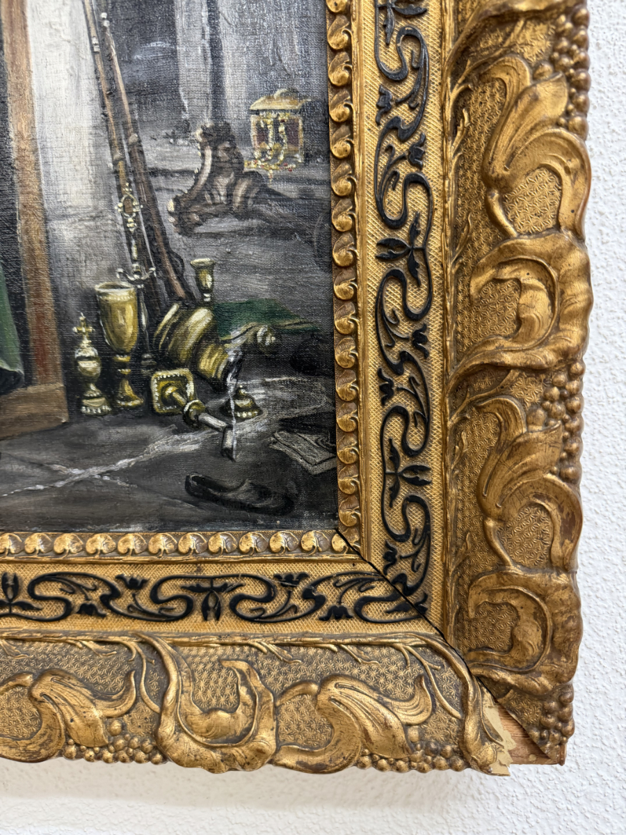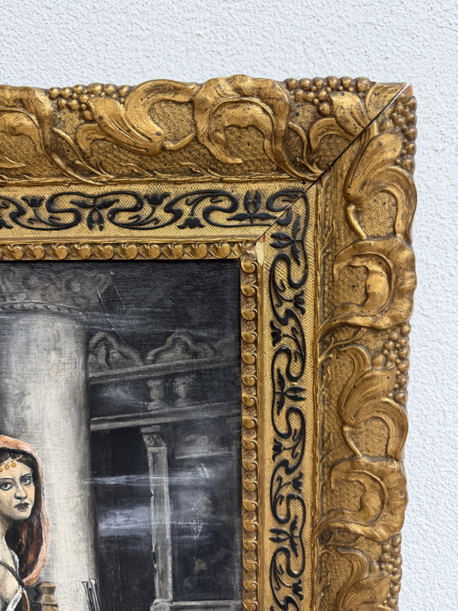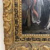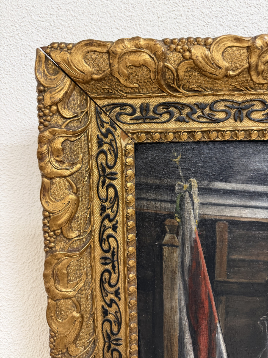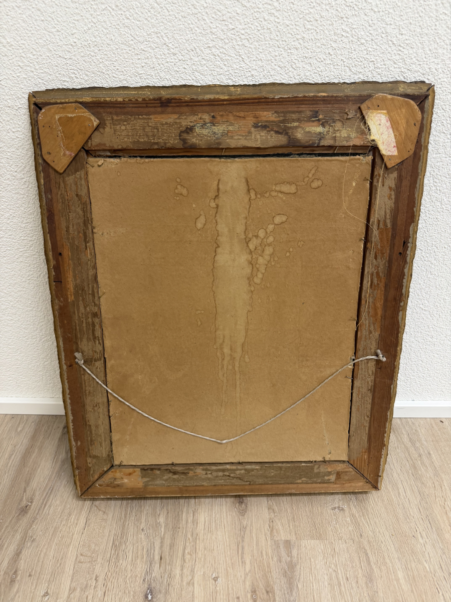 Der Rahmen ist ein Blickfang für sich: reich verziertes Holz mit Vergoldung, floralen Ornamenten, Perlstab und dunklen Akzenten. Die Rückseite zeigt eine klassische Holzrahmenkonstruktion mit alter Rückwand und Drahtaufhängung.