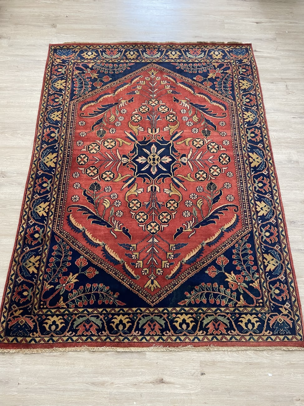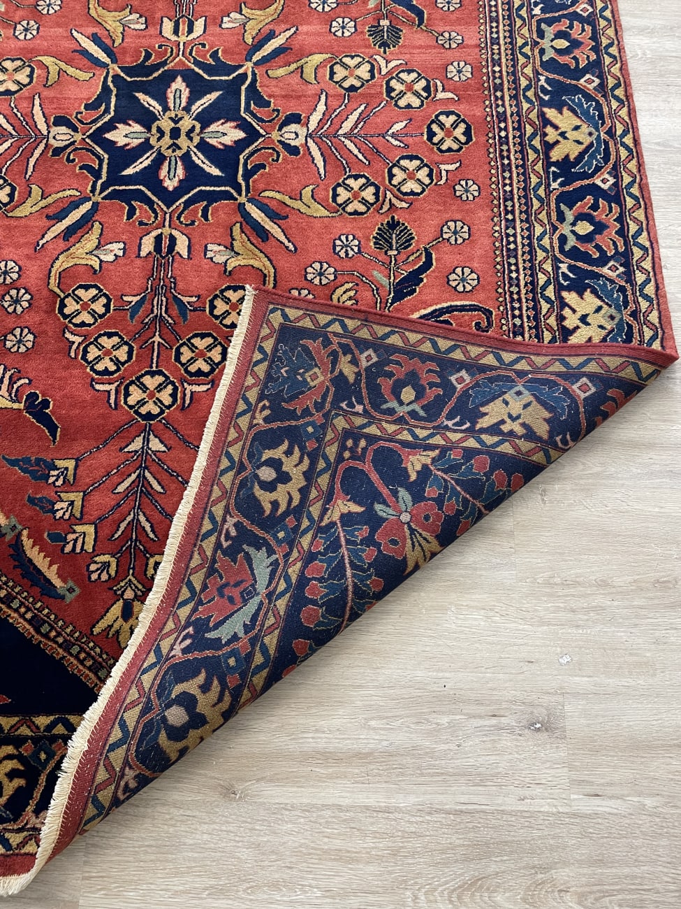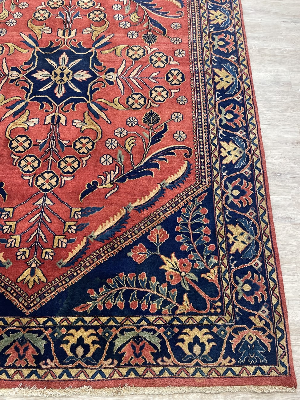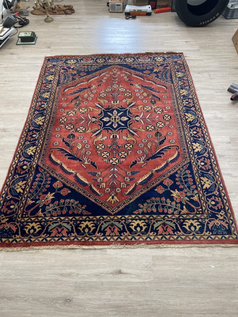 Kräftige Rottöne treffen auf tiefes Dunkelblau und feine florale Ornamente. Dieser Vintage Orientteppich zeigt ein zentrales Medaillon mit symmetrischem Pflanzenmotiv und einer detailreichen Bordüre. Die dichte Musterung wirkt aus jedem Blickwinkel ausgewogen und bringt sofort Wärme in den Raum.