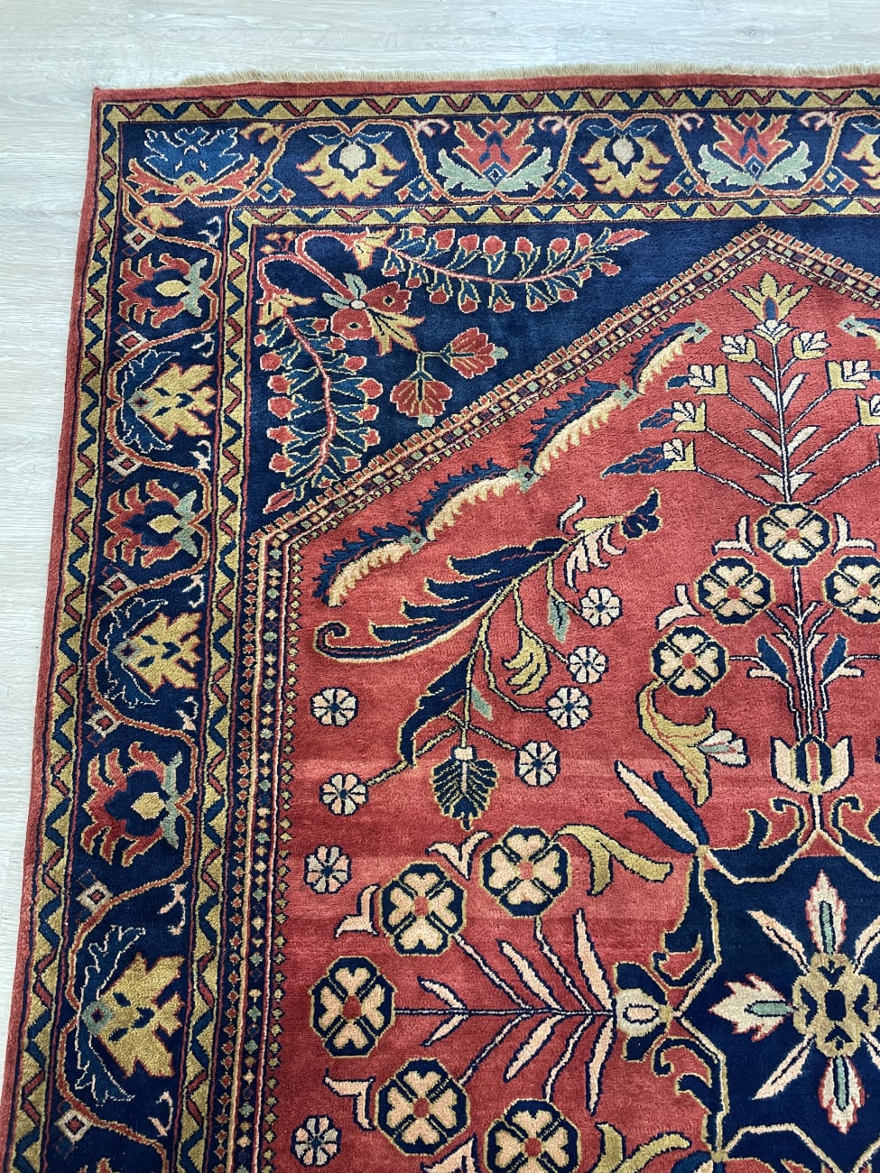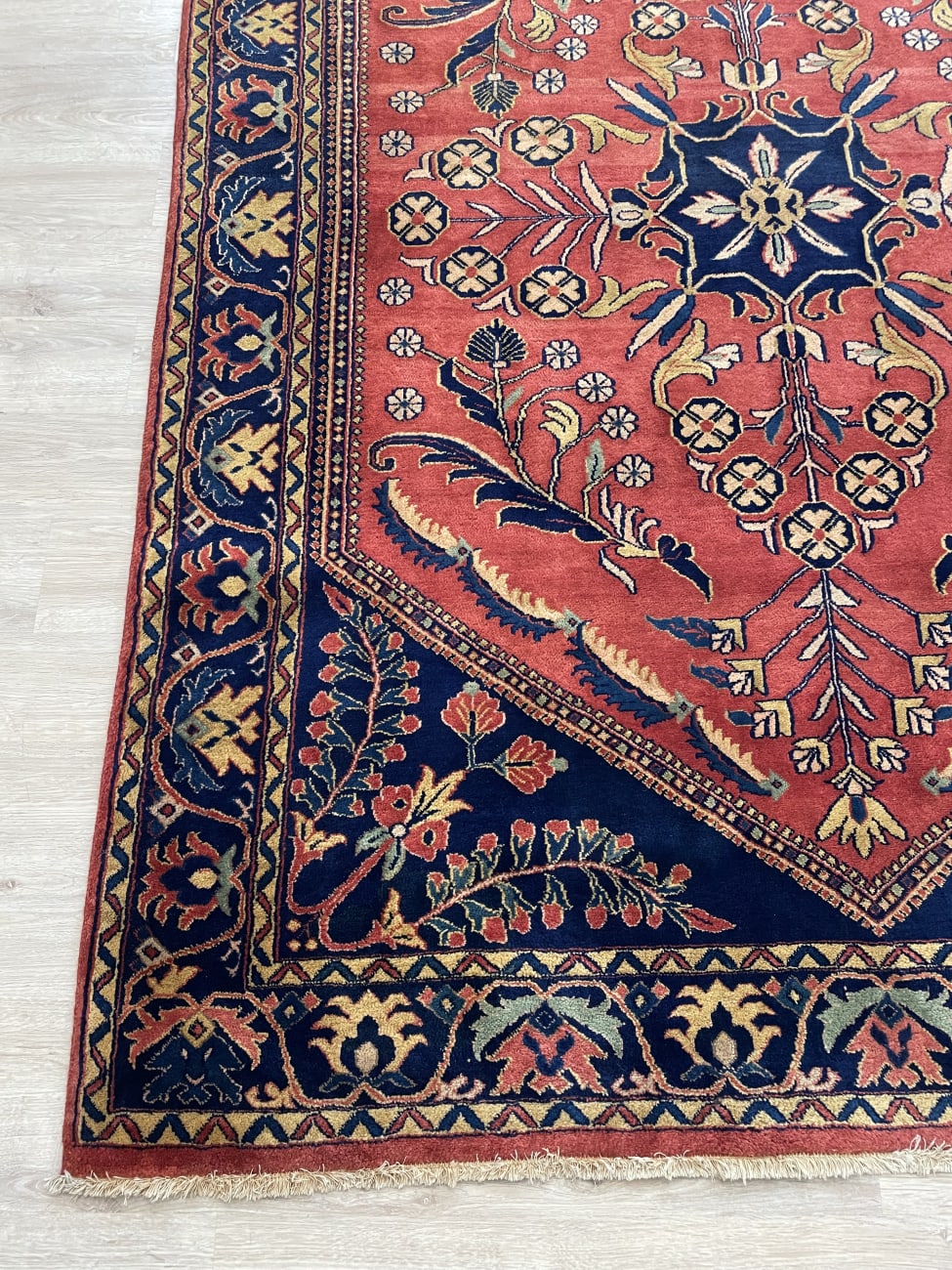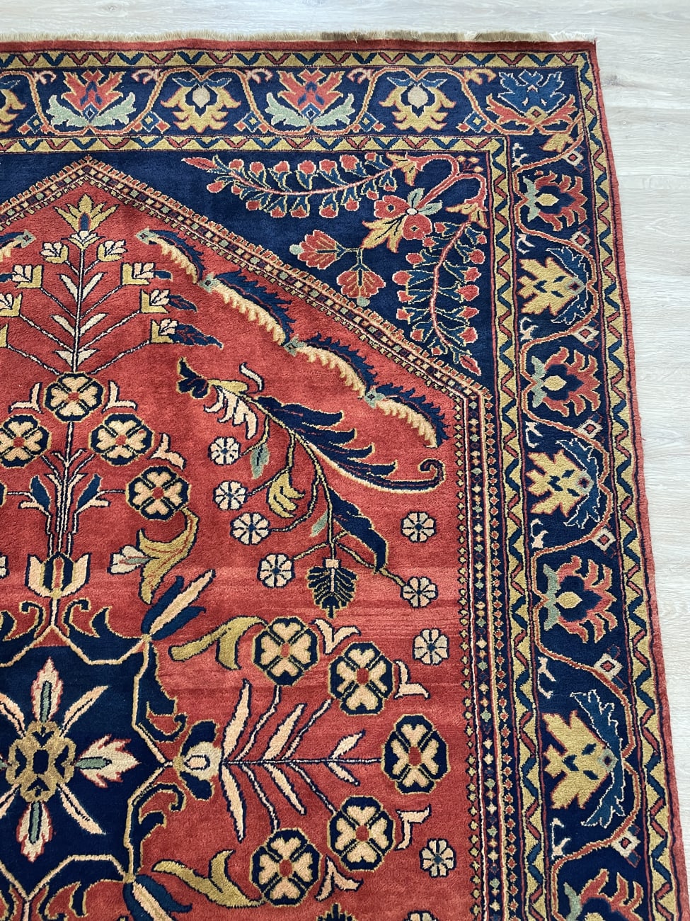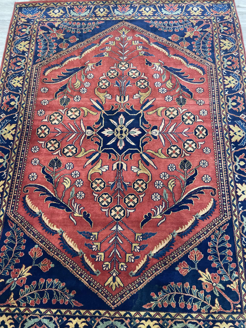 Kräftige Rottöne treffen auf tiefes Dunkelblau und feine florale Ornamente. Dieser Vintage Orientteppich zeigt ein zentrales Medaillon mit symmetrischem Pflanzenmotiv und einer detailreichen Bordüre. Die dichte Musterung wirkt aus jedem Blickwinkel ausgewogen und bringt sofort Wärme in den Raum.