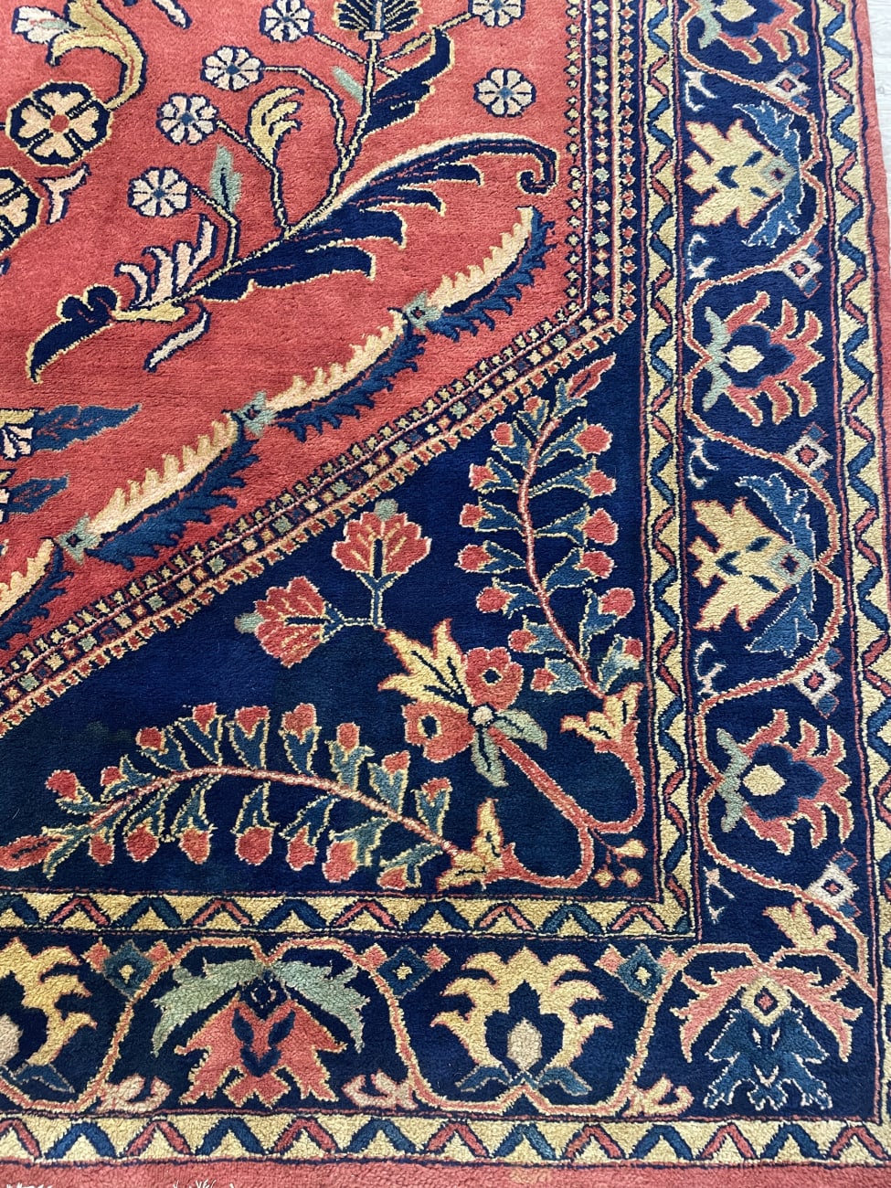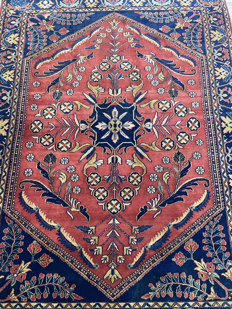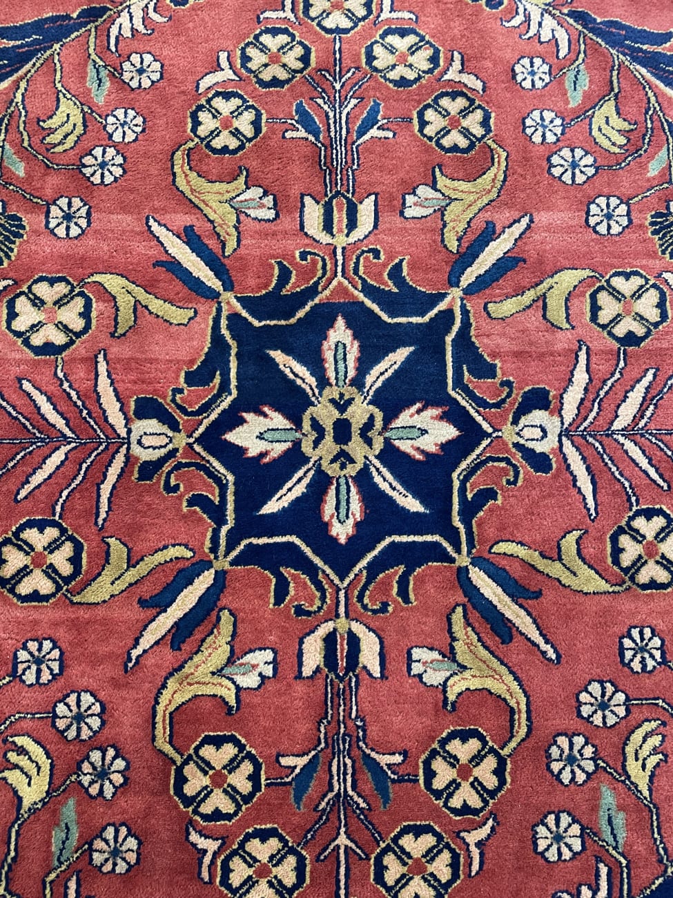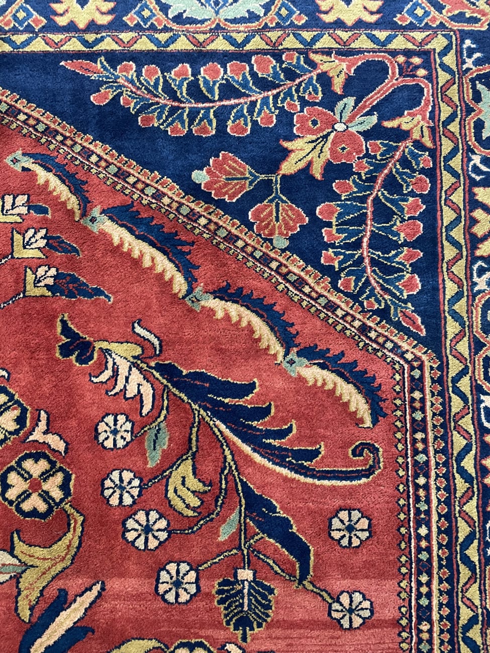 Kräftige Rottöne treffen auf tiefes Dunkelblau und feine florale Ornamente. Dieser Vintage Orientteppich zeigt ein zentrales Medaillon mit symmetrischem Pflanzenmotiv und einer detailreichen Bordüre. Die dichte Musterung wirkt aus jedem Blickwinkel ausgewogen und bringt sofort Wärme in den Raum.