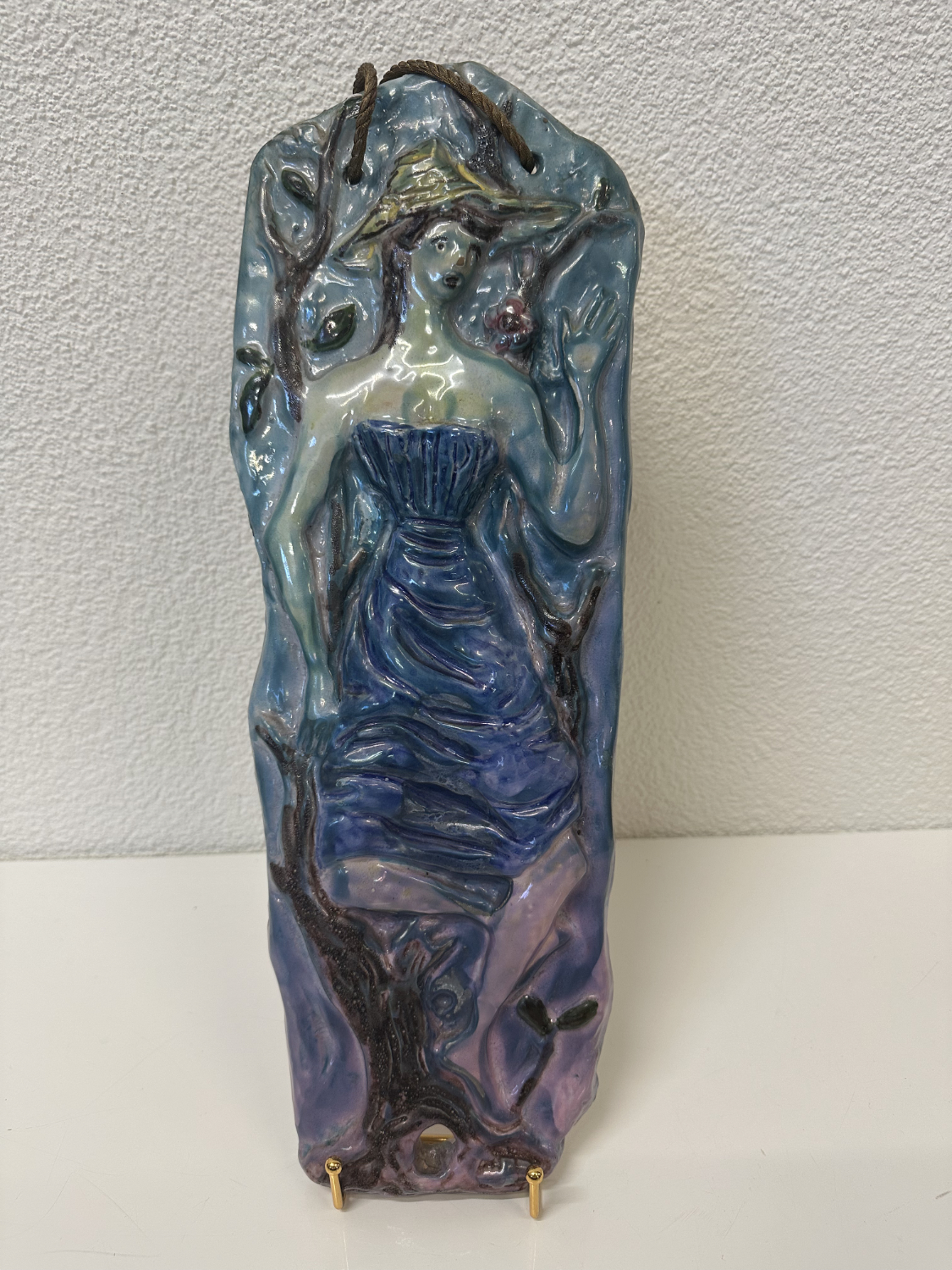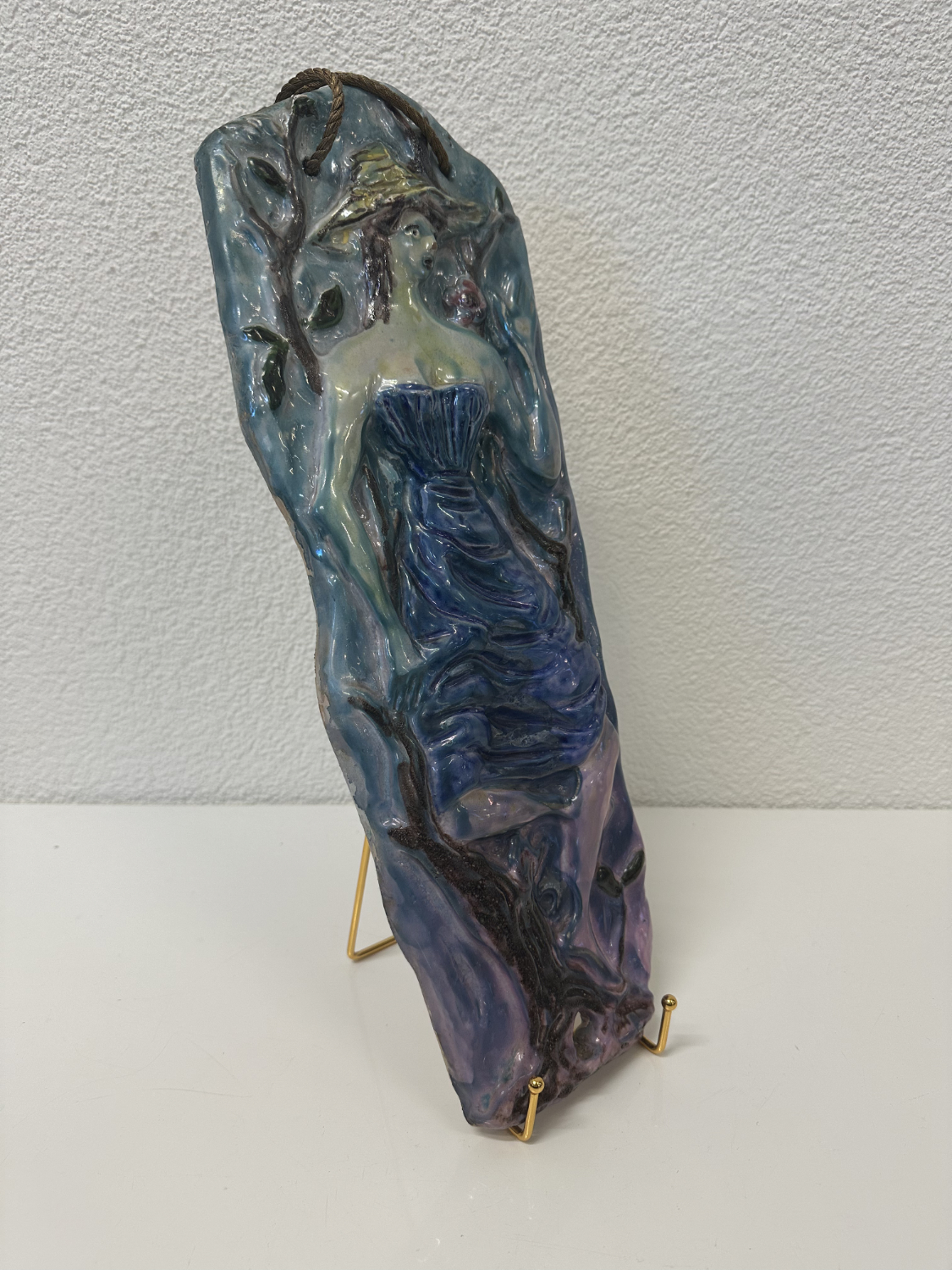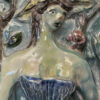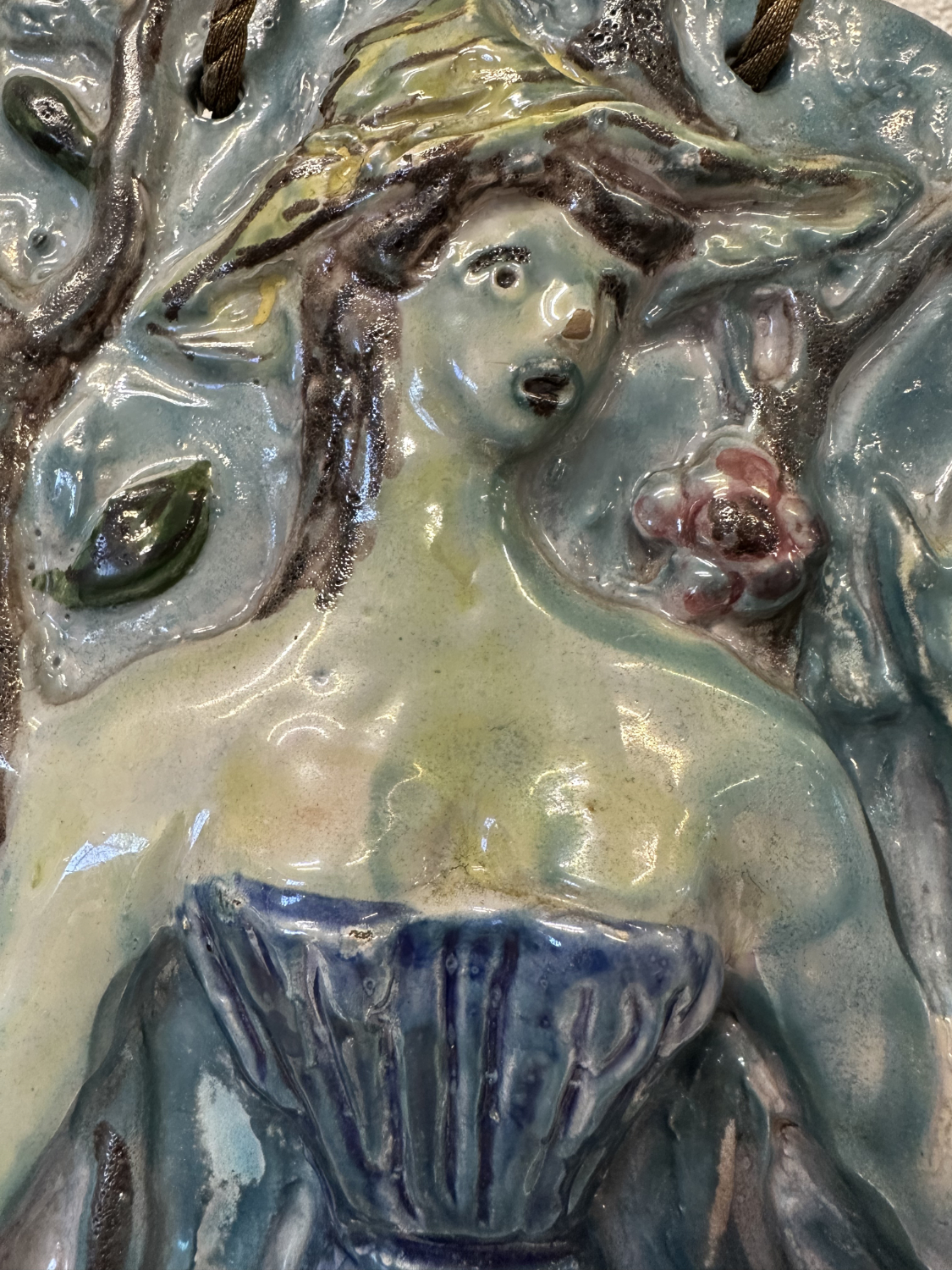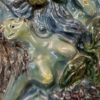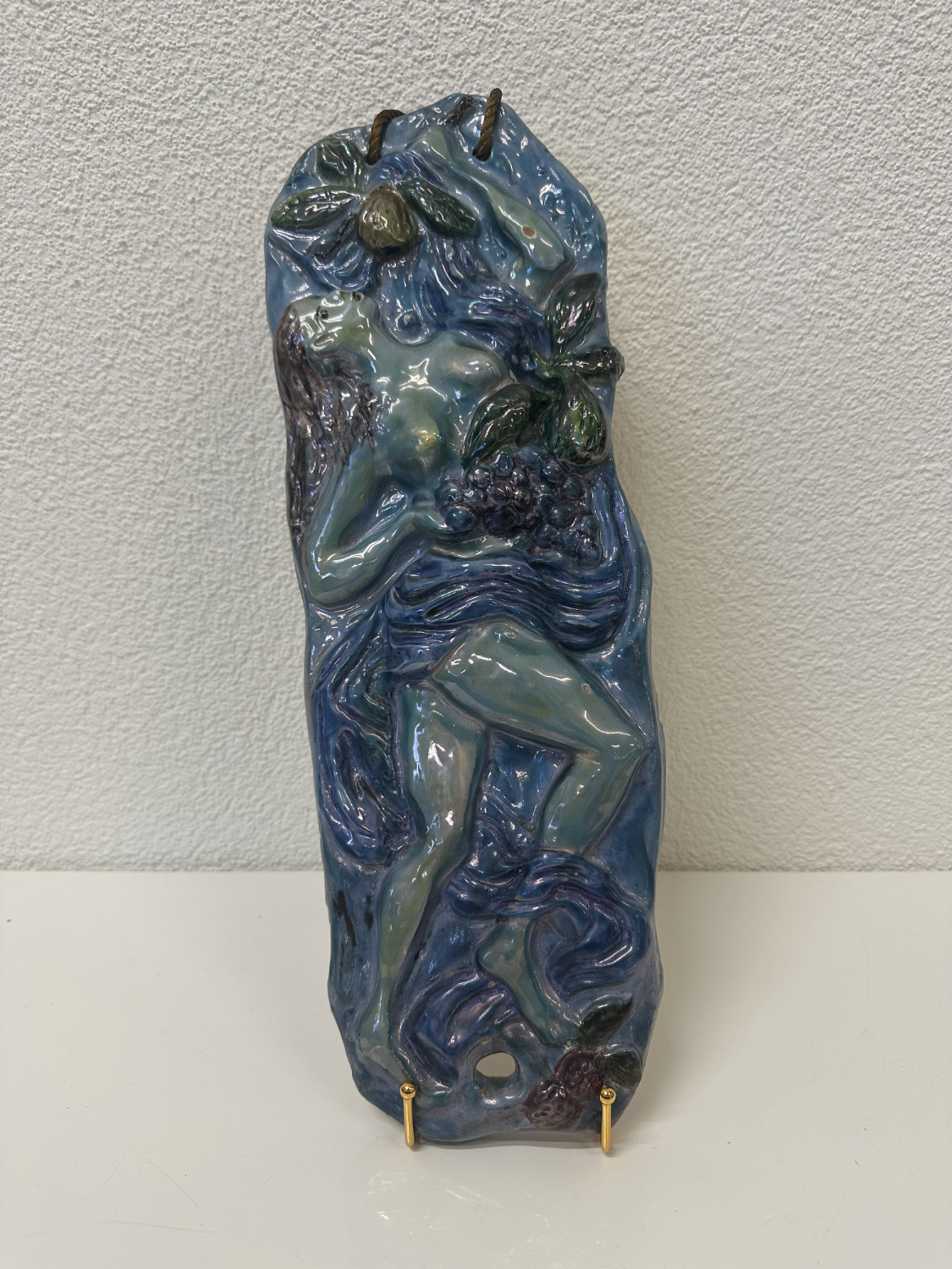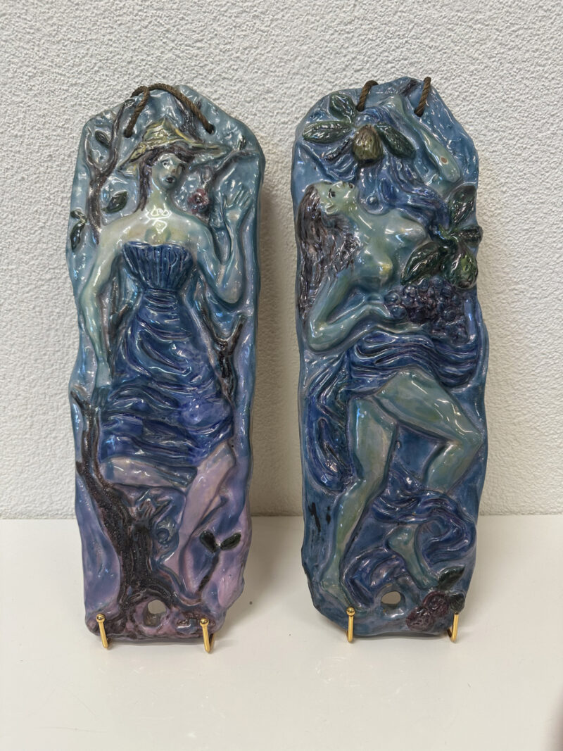 Blau, Türkis, Violett und ein Hauch Grün, dazu eine Relief-Oberfläche, die im Licht richtig lebendig wirkt. Dieses zweiteilige Keramik-Relief-Set stammt von Ceramica Bristotti, Milano und zeigt zwei stilisierte Frauenfiguren in einer naturhaften Szenerie mit Blättern und Früchten. Jede Tafel ist oben mit einer Kordel zum Aufhängen versehen und wirkt an der Wand wie ein kleines Keramik-Kunstwerk.