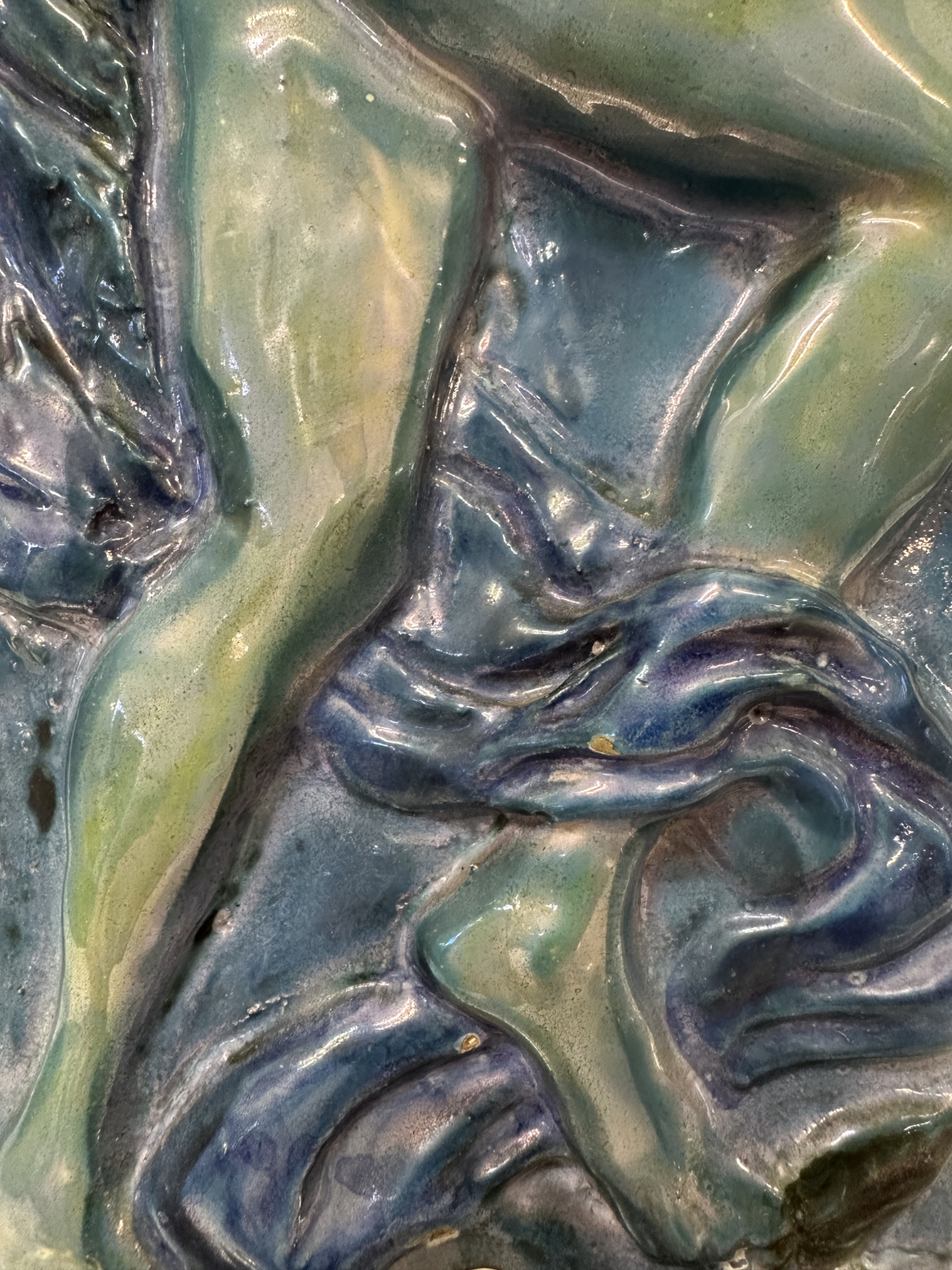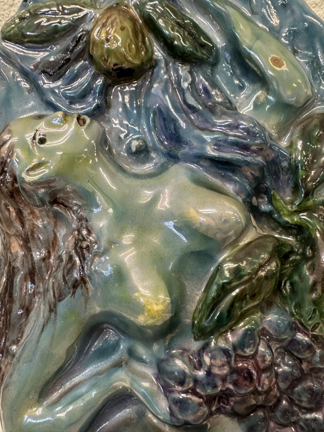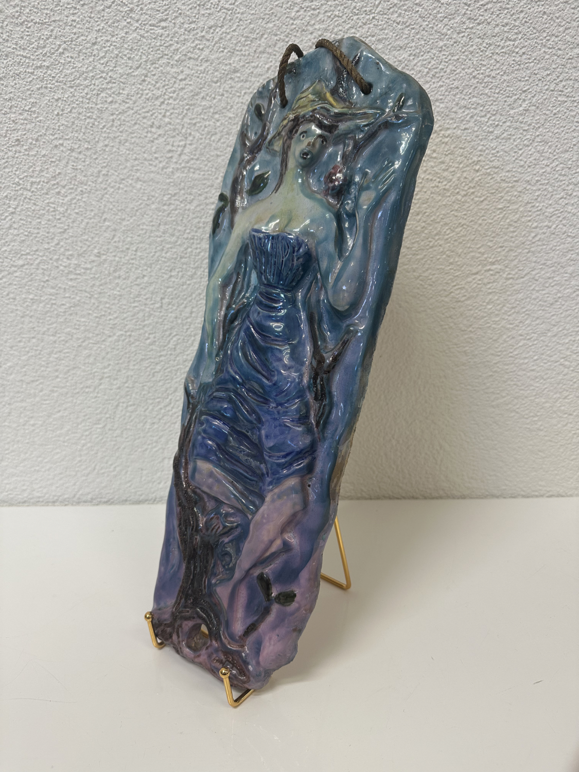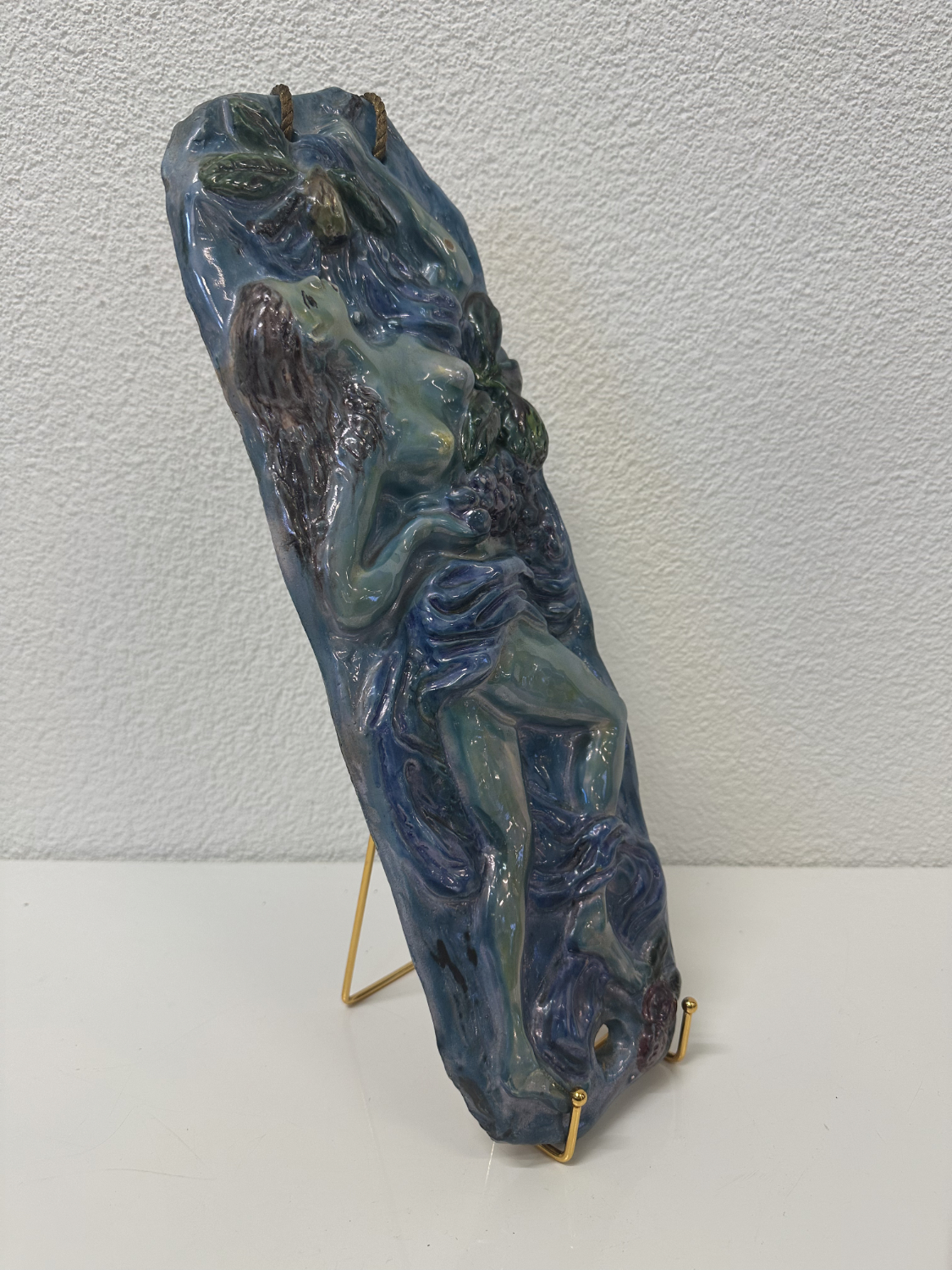 Blau, Türkis, Violett und ein Hauch Grün, dazu eine Relief-Oberfläche, die im Licht richtig lebendig wirkt. Dieses zweiteilige Keramik-Relief-Set stammt von Ceramica Bristotti, Milano und zeigt zwei stilisierte Frauenfiguren in einer naturhaften Szenerie mit Blättern und Früchten. Jede Tafel ist oben mit einer Kordel zum Aufhängen versehen und wirkt an der Wand wie ein kleines Keramik-Kunstwerk.