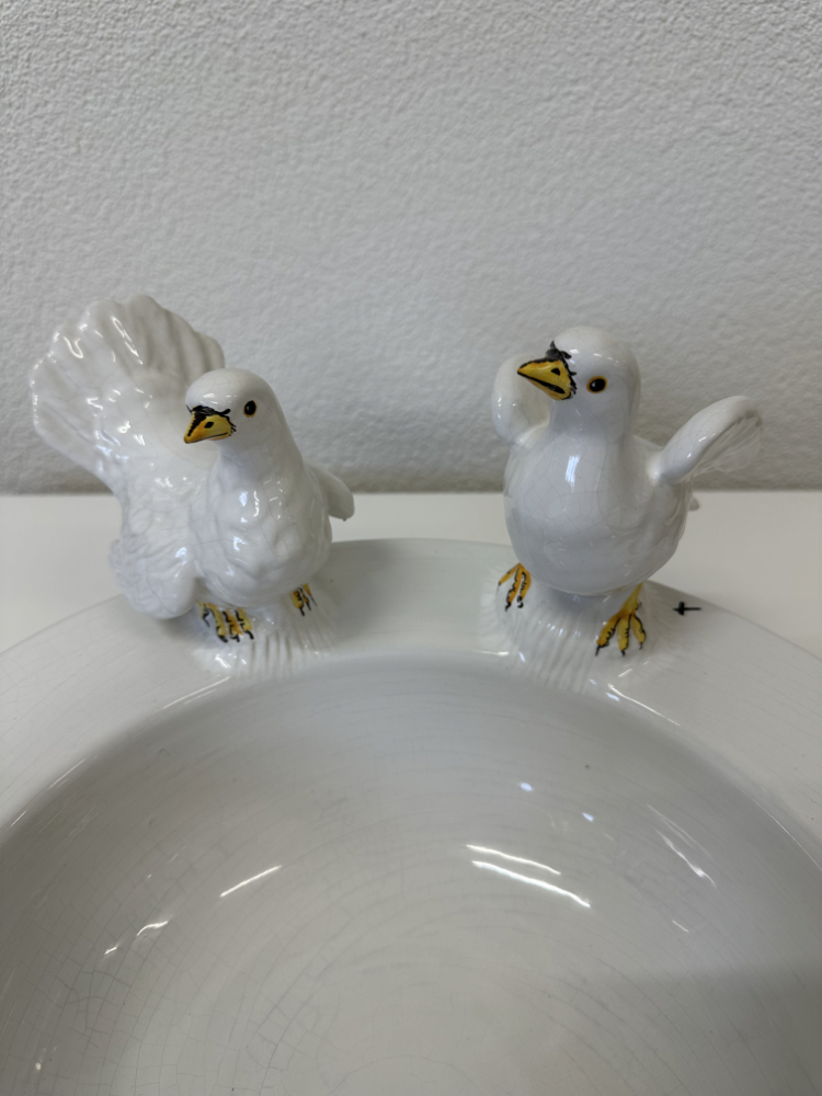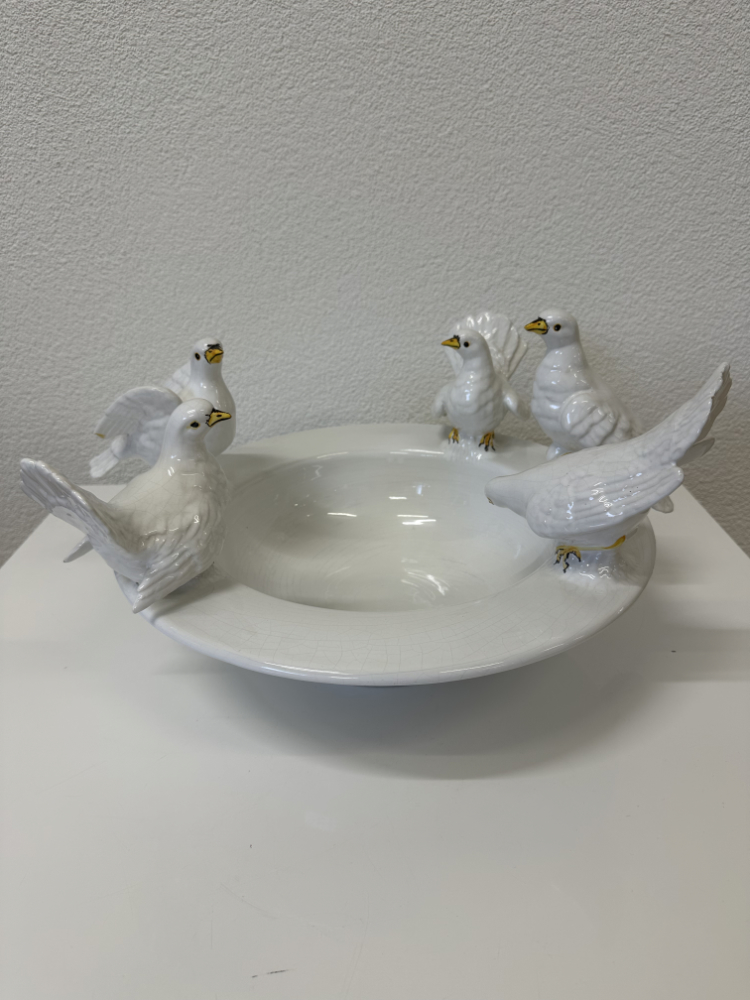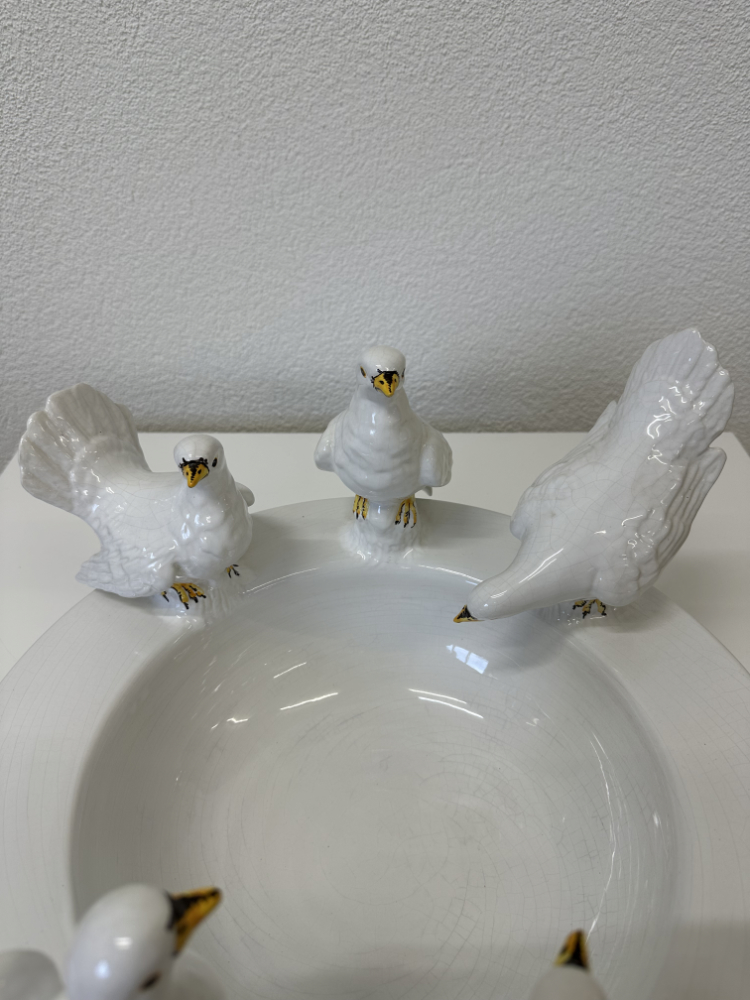 Glänzend weiße Keramik, fein modelliert und verspielt gestaltet. Diese außergewöhnliche Schale zeigt rundum sechs plastisch ausgearbeitete Vögel, die am Rand sitzen und der Form eine lebendige, fast erzählerische Wirkung verleihen. Die Glasur ist gleichmäßig, leicht craqueliert im Inneren und unterstreicht den handwerklichen Charakter. Auf der Unterseite klar gestempelt «Made in Italy», ein klassisches Dekoobjekt aus italienischer Keramiktradition.