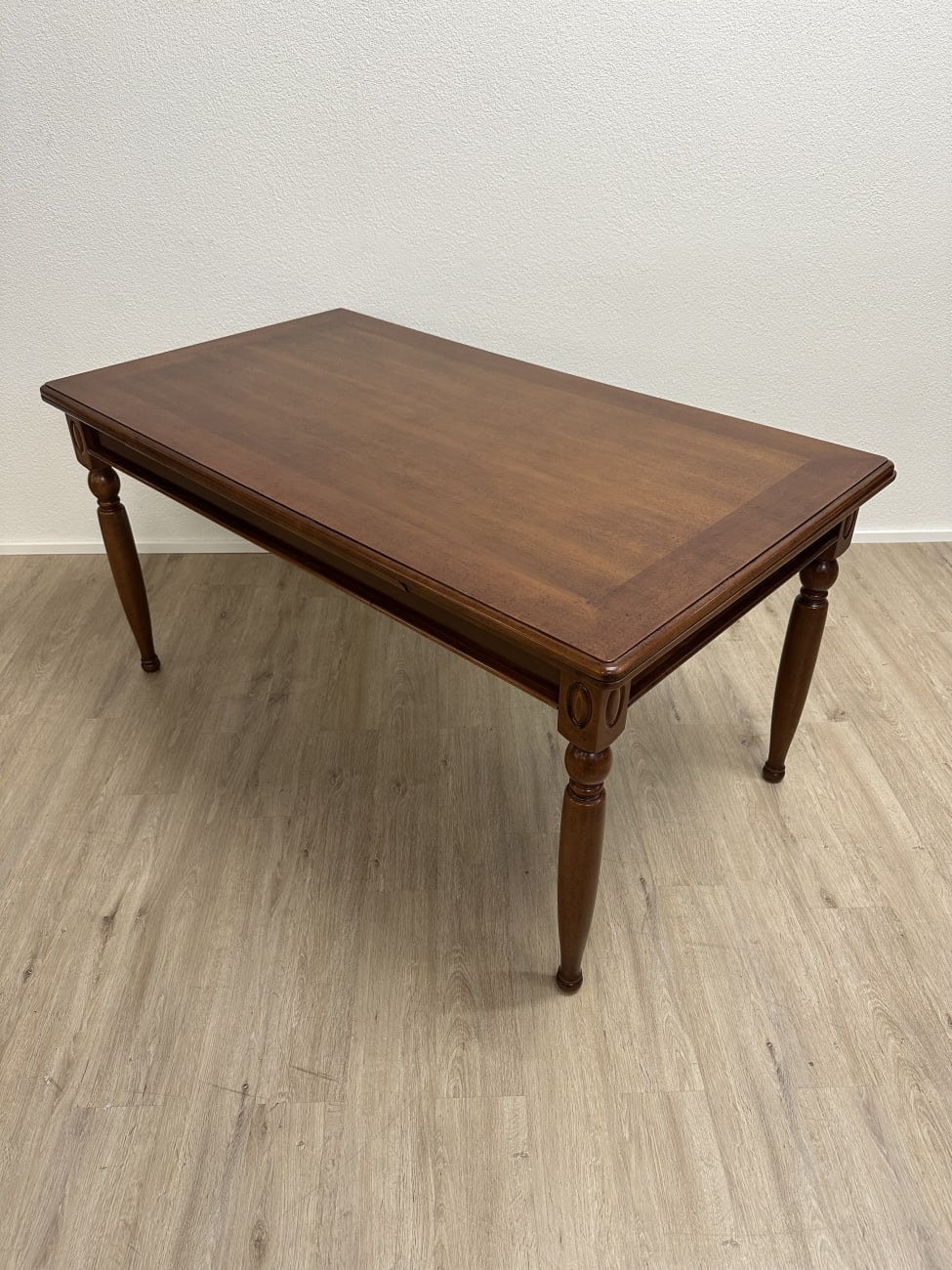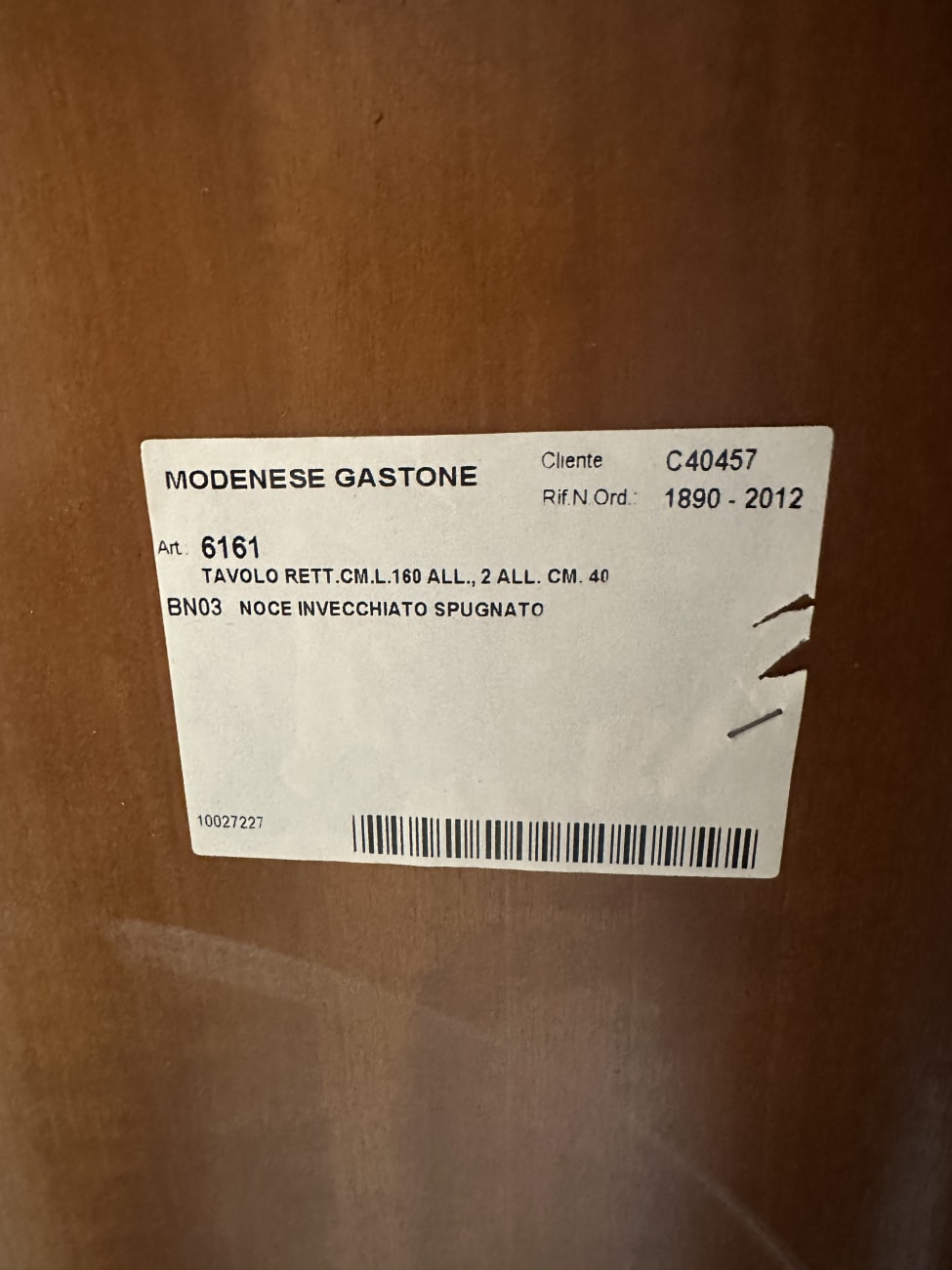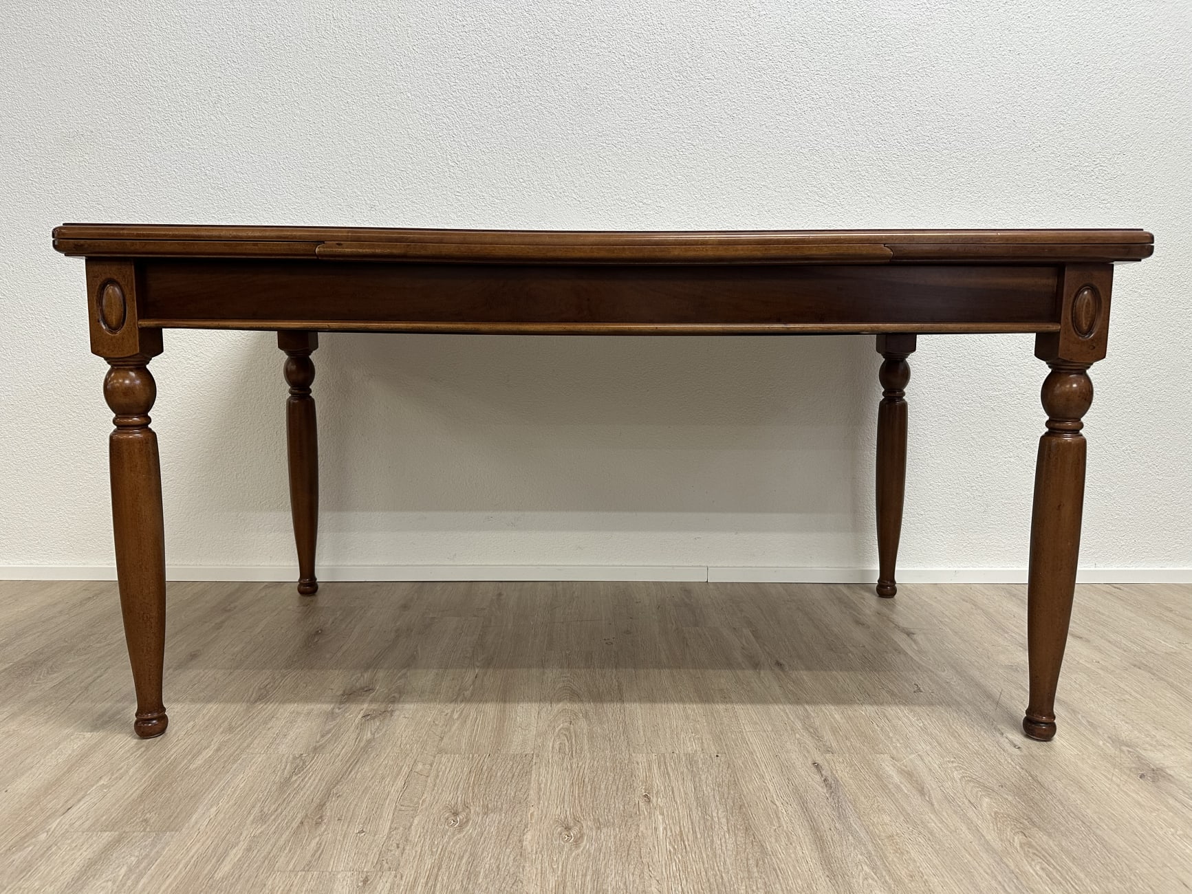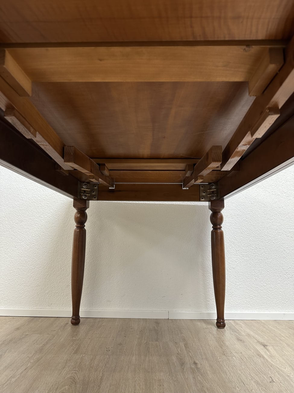 Massives Holz, warme Nussbaumfarbe und sauber gedrechselte Beine geben diesem Tisch eine ruhige, hochwertige Ausstrahlung. Gefertigt von Modenese Gastone in Italien, einem Hersteller für traditionelle Möbel mit handwerklichem Anspruch. Die zwei seitlichen Einlegeplatten lassen sich einfach ausziehen und erweitern die Fläche deutlich. Im geschlossenen Zustand kompakt, ausgezogen ideal für Gäste oder grosse Runden.