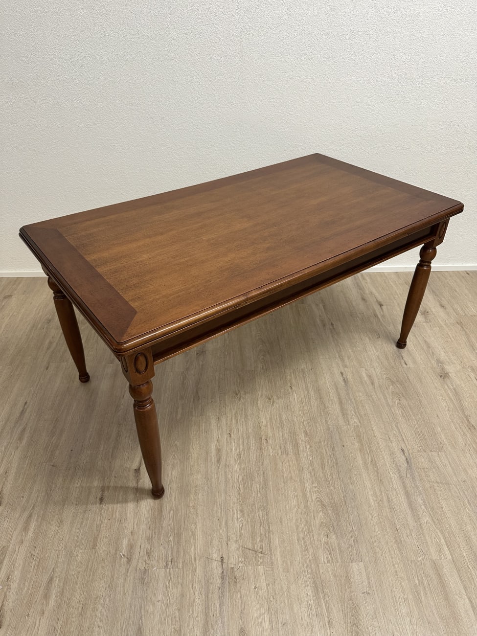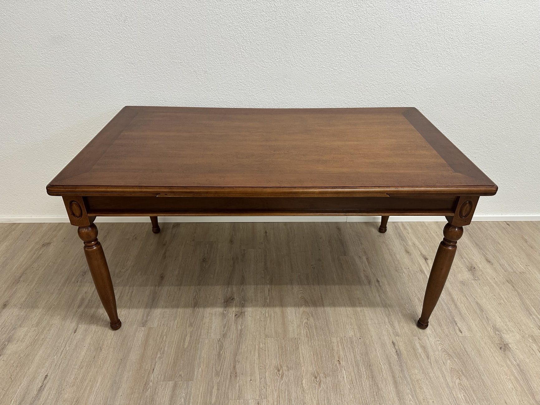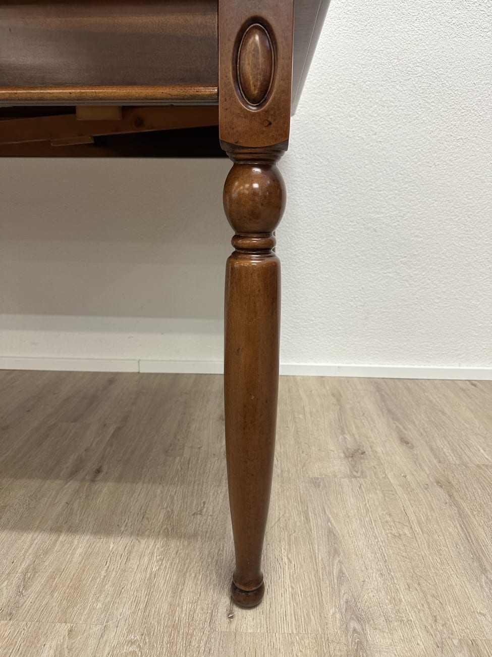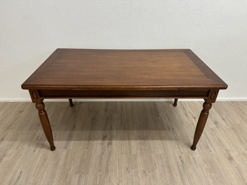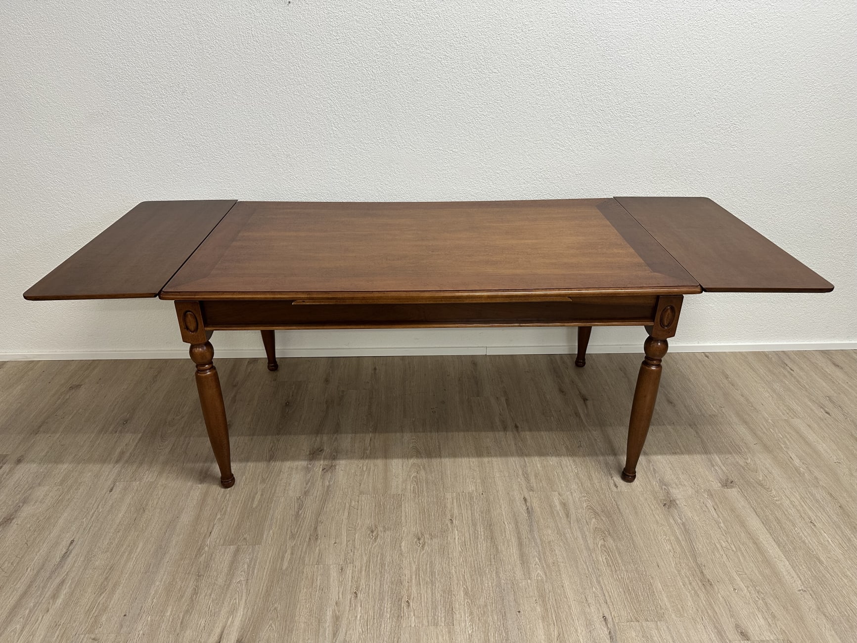 Massives Holz, warme Nussbaumfarbe und sauber gedrechselte Beine geben diesem Tisch eine ruhige, hochwertige Ausstrahlung. Gefertigt von Modenese Gastone in Italien, einem Hersteller für traditionelle Möbel mit handwerklichem Anspruch. Die zwei seitlichen Einlegeplatten lassen sich einfach ausziehen und erweitern die Fläche deutlich. Im geschlossenen Zustand kompakt, ausgezogen ideal für Gäste oder grosse Runden.