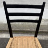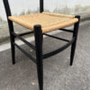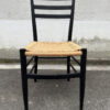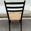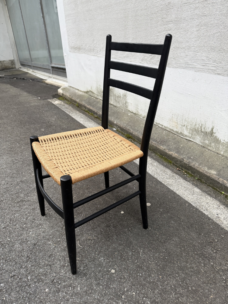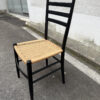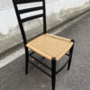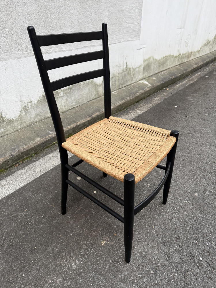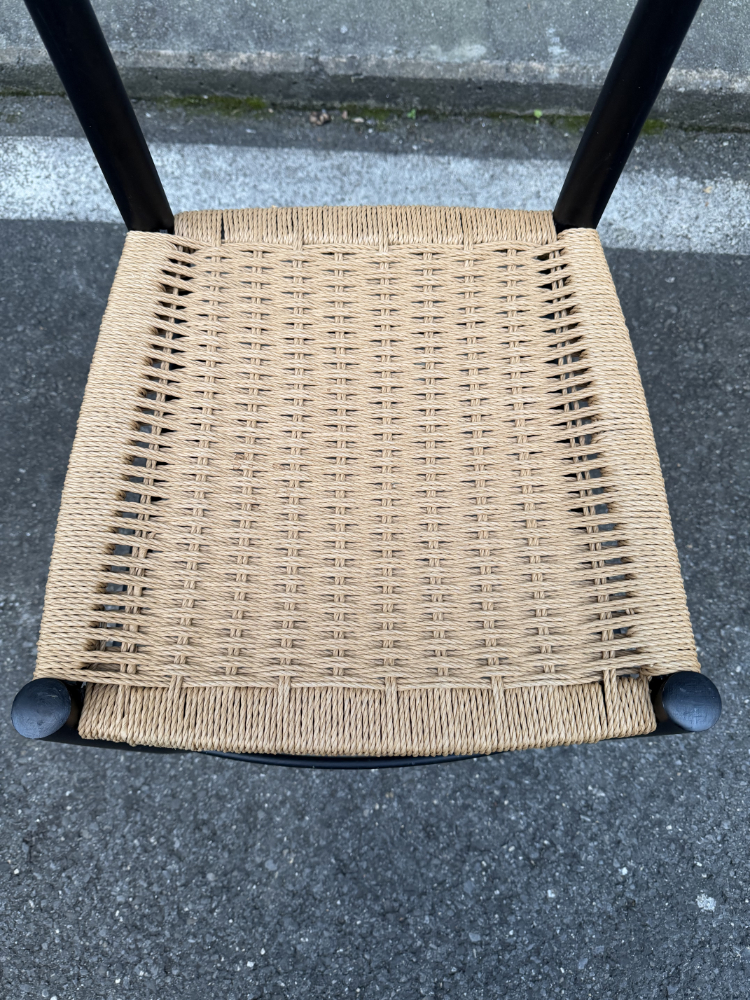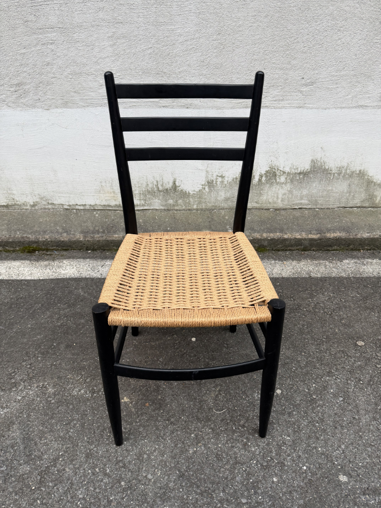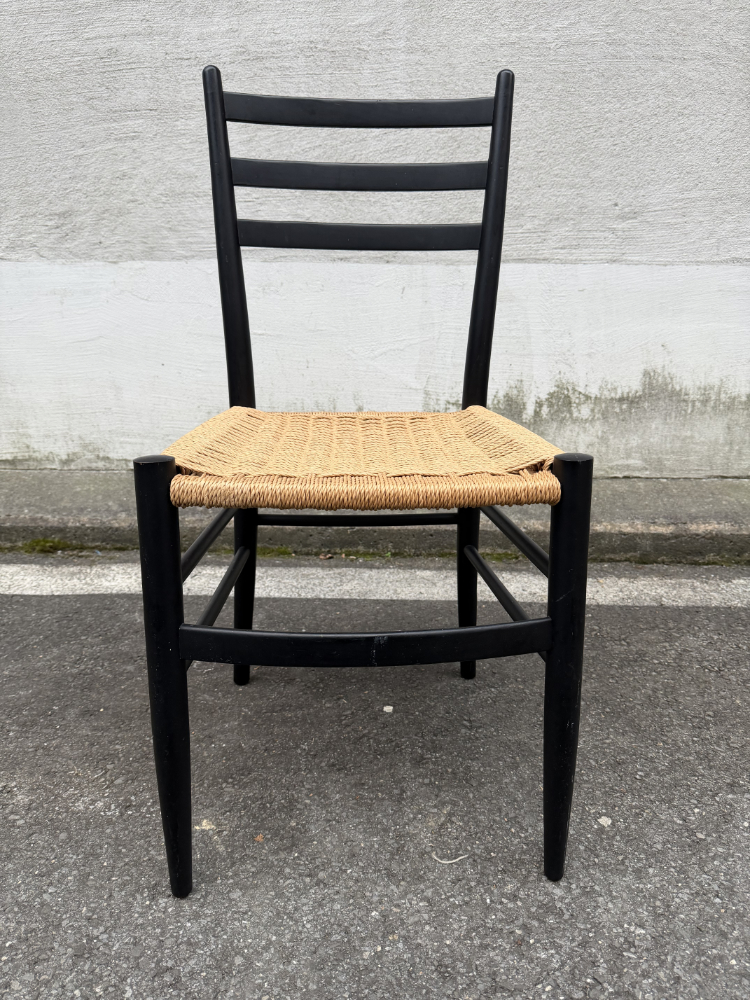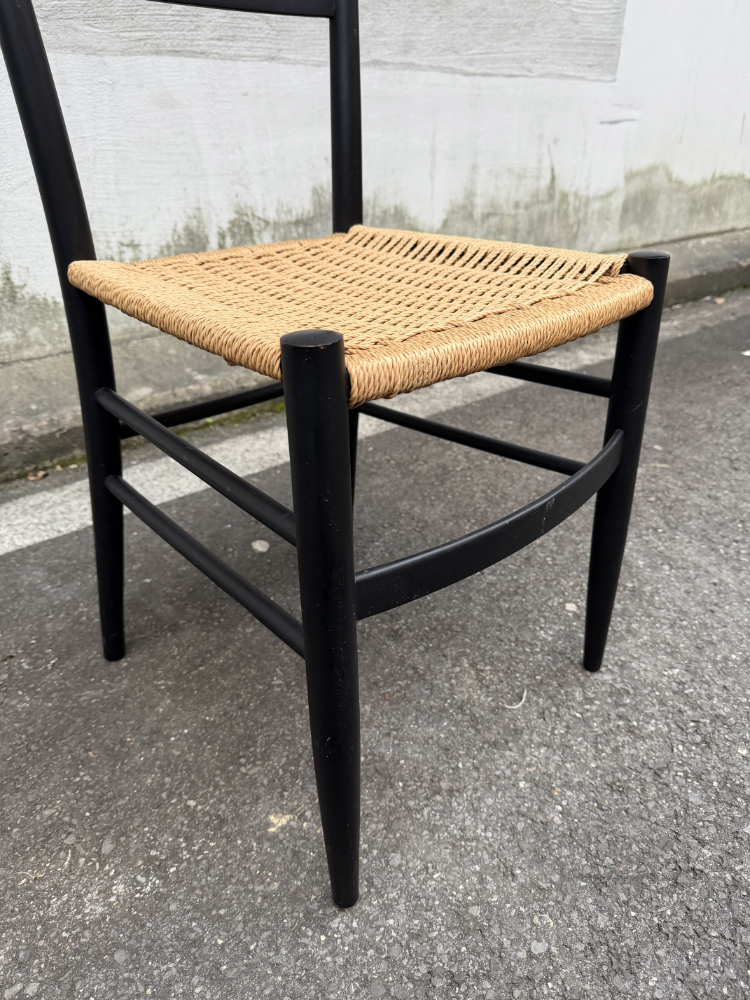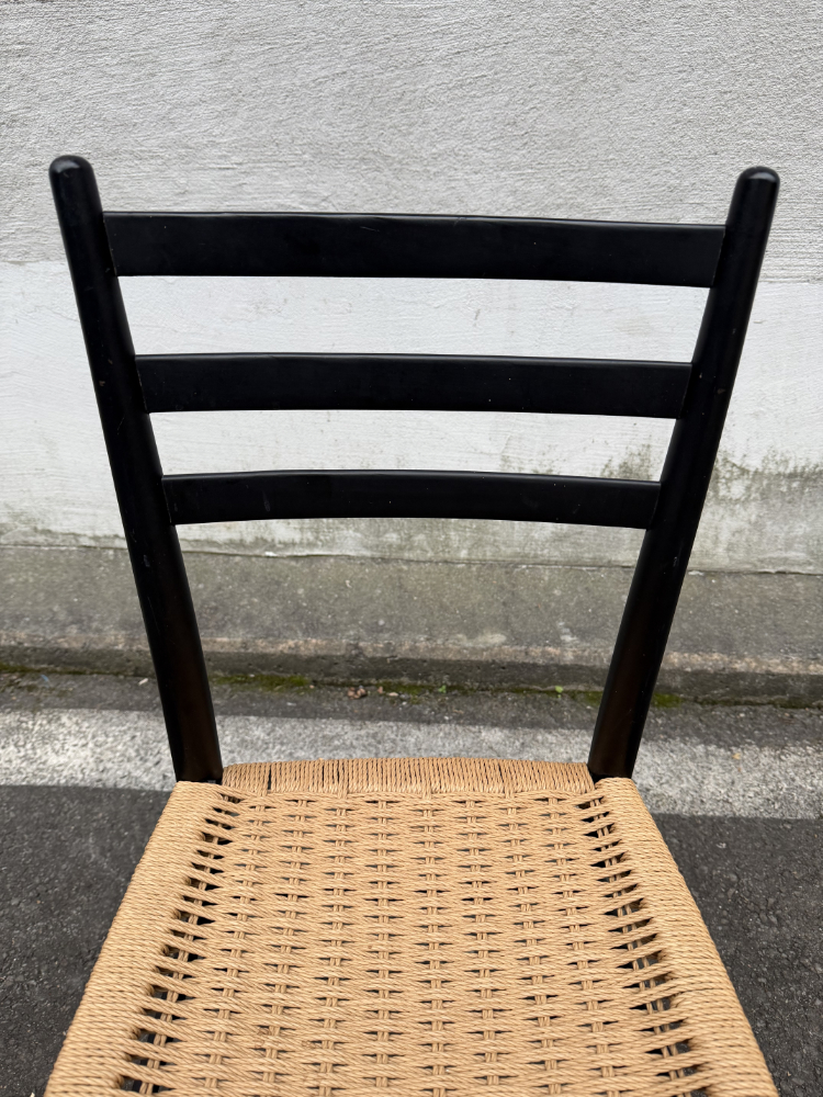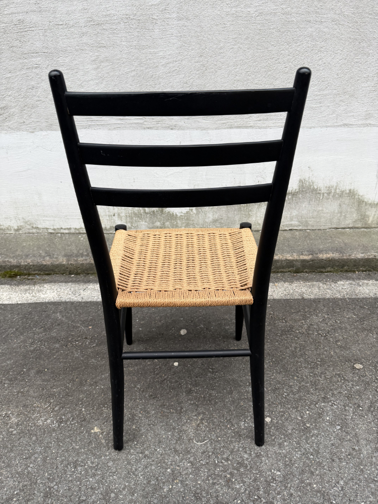 Dieser elegante Stuhl aus Italien vereint Leichtigkeit und klare Formensprache. Das schwarze Holzgestell mit seinen fein gearbeiteten Rundbeinen und der leicht geschwungenen Rückenlehne zeigt die typische Ästhetik des Mid Century Designs. Die Sitzfläche aus handgeflochtener Papierkordel bildet dazu einen warmen, natürlichen Kontrast und sorgt für angenehmen Sitzkomfort.