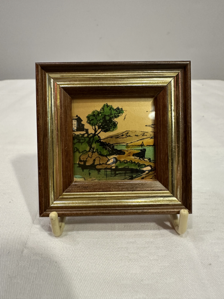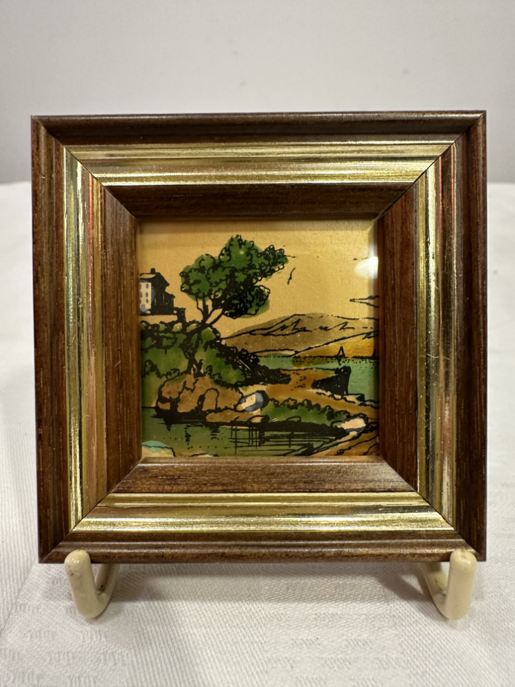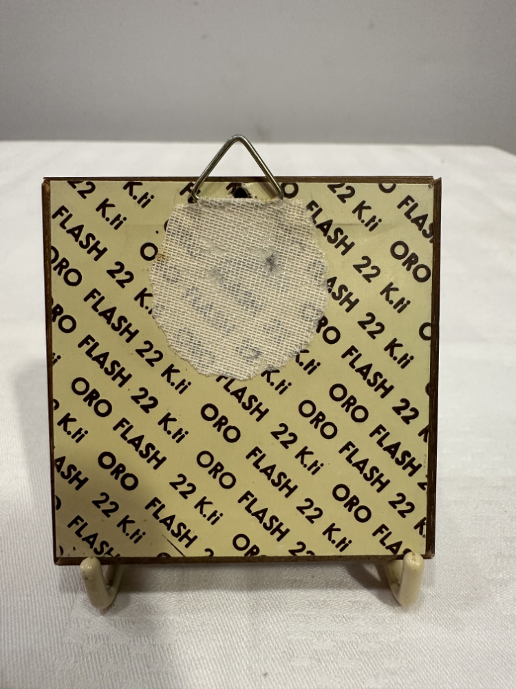 Diese kleine italienische Wandminiatur zeigt eine idyllische Landschaft mit Haus, Bäumen und Seeufer, fein von Hand auf 22-Karat-Blattgold gemalt. Die glänzende Goldfläche verleiht der Szene eine besondere Tiefe und changiert je nach Lichteinfall. Umrahmt ist das Bild von einem klassischen Holzrahmen mit goldener Innenleiste und Glasabdeckung. Auf der Rückseite befindet sich das originale Etikett „ORO FLASH 22 Kt“, das die Echtheit der Blattgoldverarbeitung bestätigt.