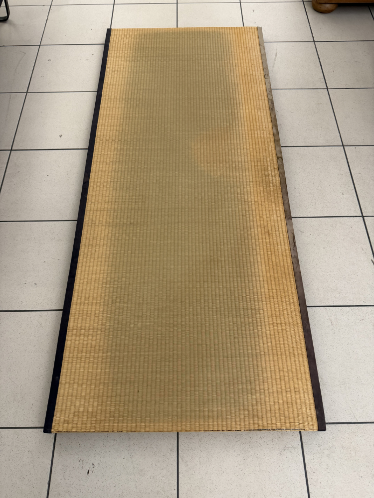 Schlicht, funktional und traditionell gefertigt. Diese originale Tatami-Matte stammt aus japanischer Herstellung und besteht aus dicht gebundenem Reisstroh mit klassischer Webstruktur. Die Oberfläche zeigt das typische, fein gerippte Tatami-Muster in warmem Naturton, eingefasst mit dunklem Textilrand.