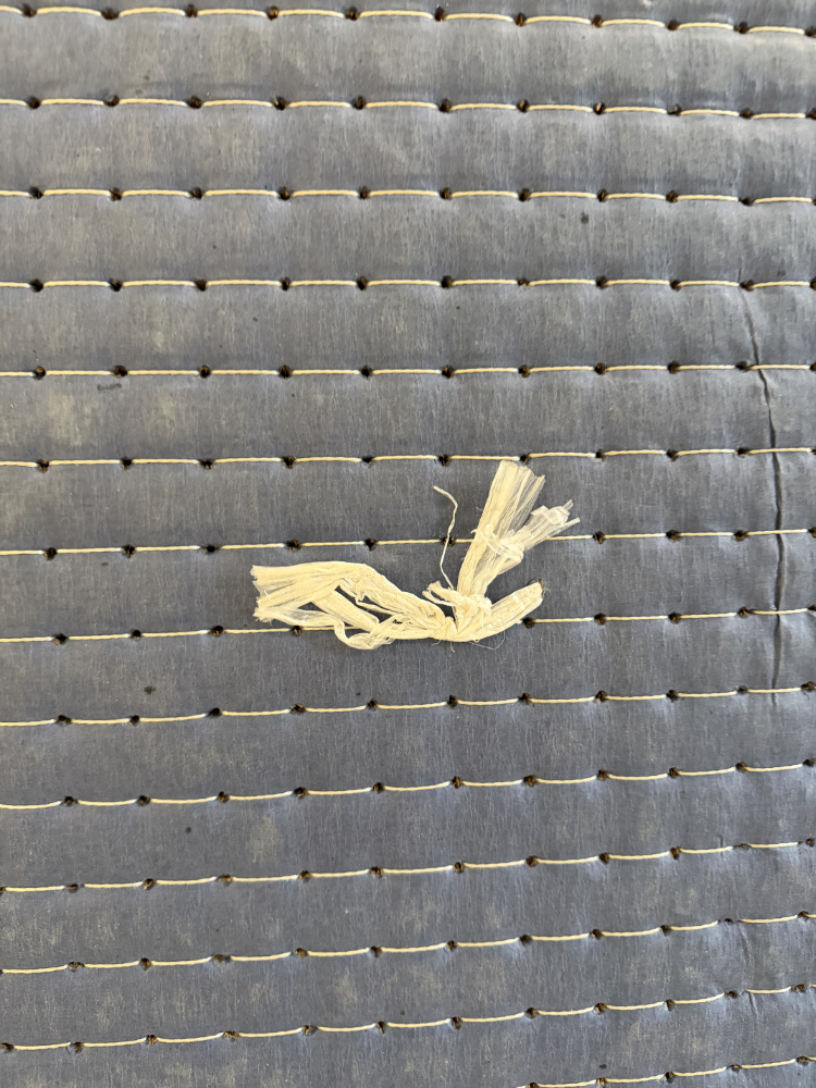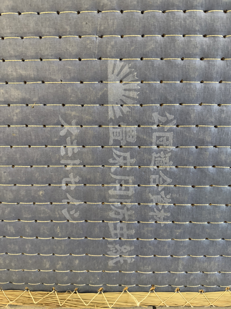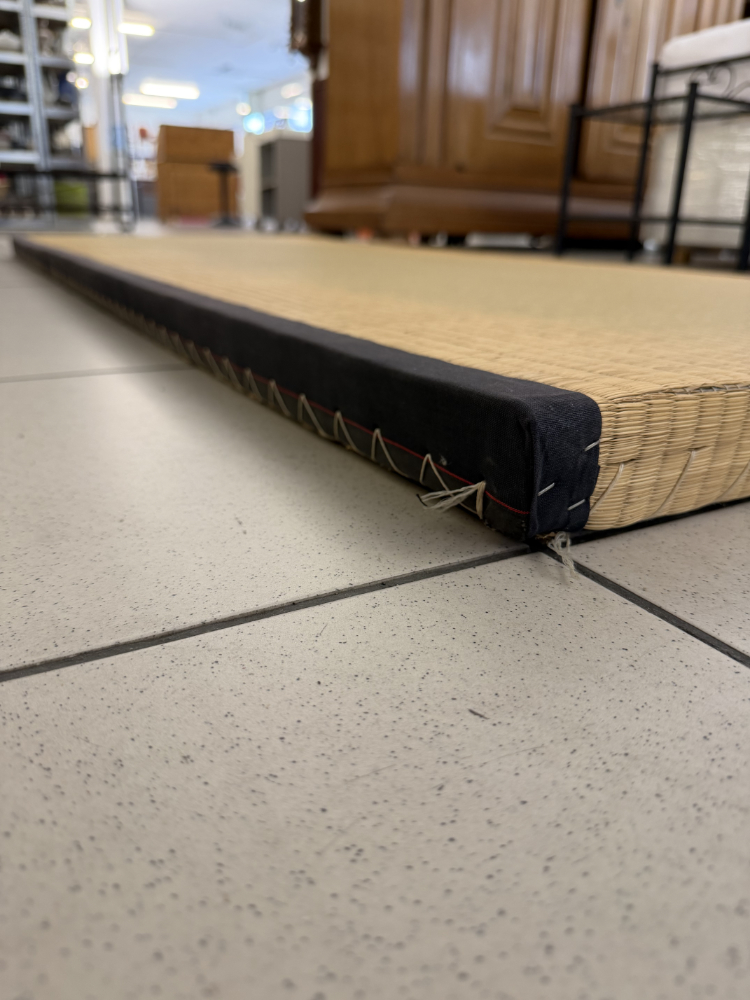 Die Rückseite ist mit Stoff bespannt und vernäht, inklusive originalem Etikett „Tatami Mat“ mit Materialangabe. Die Matte eignet sich sowohl als Schlafunterlage, Meditationsfläche oder als authentisches Gestaltungselement für asiatisch inspirierte Wohnräume. Durch ihre feste Struktur bietet sie eine stabile, bodennahe Liegefläche.