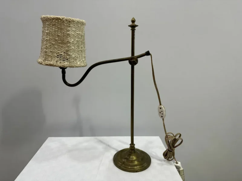 Jugendstil Messing Tischlampe / Tischleuchte befindet sich in einem guten bis sehr guten Zustand. Diese hübsche Tischleuchte funktioniert in einem einwandfreien Zustand. Sie ist besonders durch ihre Optisches Erscheinen ein echter Hingucker. Das Gestell der Lampe ist aus Messing und der Lampenschirm oben ist aus einem weissen, gehäkelten Wollen Stück versehen. Es ist eine zierliche Lampe und schaut auf einem Tisch, wie auch also Nachtischleuchte oder auch als Arbeitsleuchte super aus.