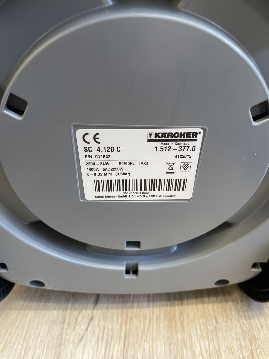 1800 Watt Power, bis 3,5 bar Dampfdruck und damit perfekt für hygienische Reinigung ohne Chemie. Der Kärcher SC 4.120 C ist ein kompakter Dampfreiniger für Böden, Fugen, Bad, Küche und viele Hartflächen. Auf dem Typenschild steht Made in Germany, 220 bis 240 V, IPX4, Leistungsaufnahme 1800 W (total bis 2250 W) und 0,35 MPa bzw. 3,5 bar.