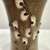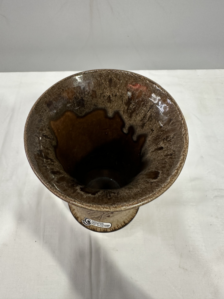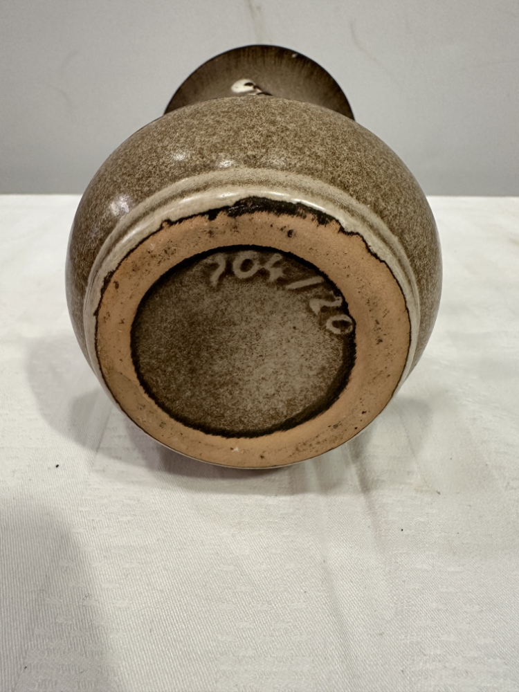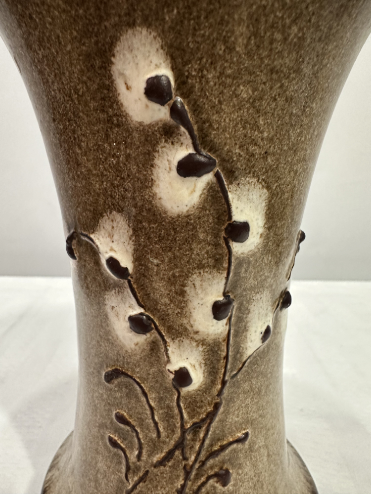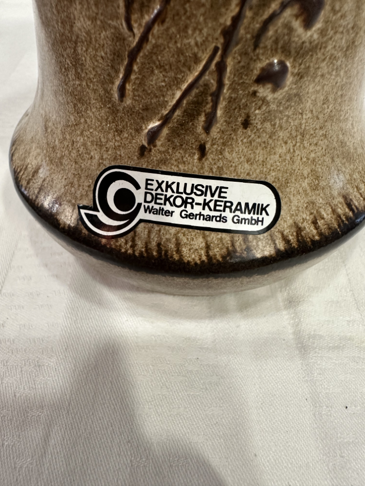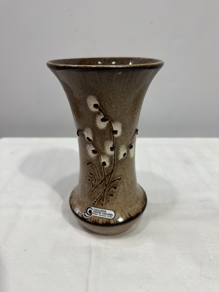 Diese formschöne Keramikvase stammt aus der Manufaktur Walter Gerhards GmbH, bekannt für exklusive Dekorkeramik aus deutscher Produktion. Das Modell überzeugt durch seine harmonische, leicht taillierte Form und die warme Glasur in erdigen Braun- und Beigetönen. Auf der Vorderseite zeigt sich ein fein gearbeitetes Reliefmotiv von Weidenkätzchen, das sich plastisch vom glasierten Untergrund abhebt, ein klassisches Motiv aus den 1970er Jahren.