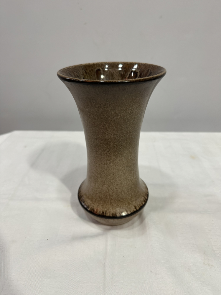 Die Glasur verläuft dezent in Schattierungen von Hellbeige bis Dunkelbraun, wodurch ein weicher Farbverlauf entsteht. Dank der stabilen Ausführung eignet sich die Vase sowohl für einzelne Blumenstiele als auch als eigenständiges Dekoobjekt im Retro- oder Landhausstil.