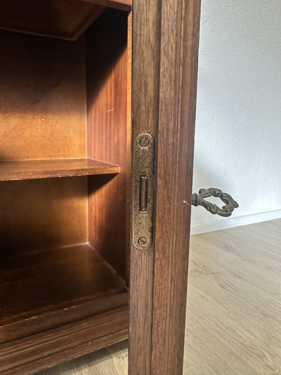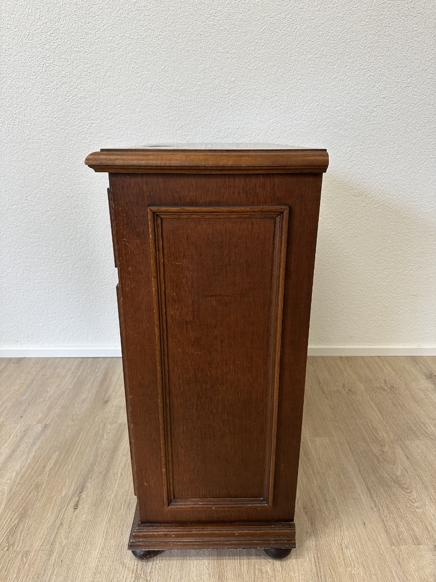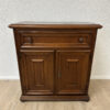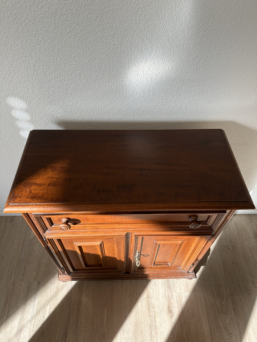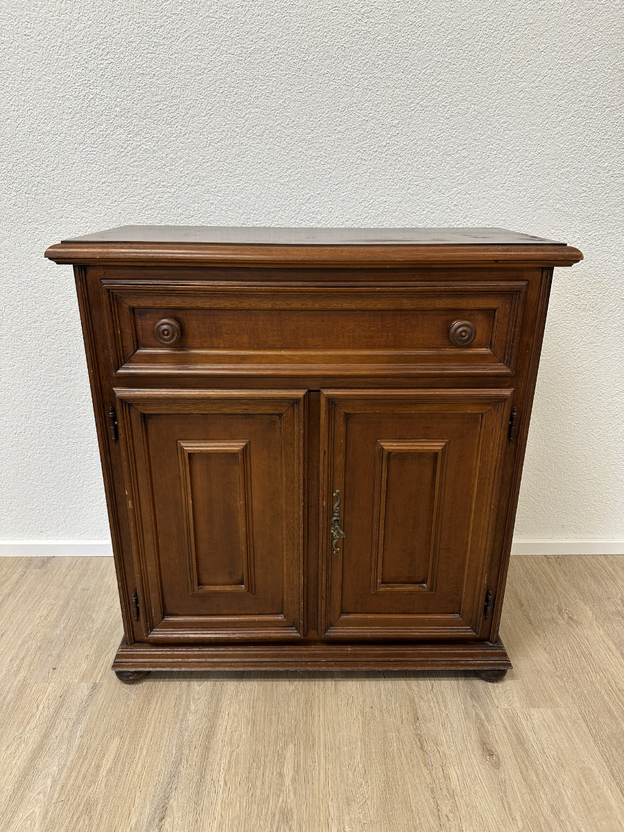 Kompakt, praktisch und schön verarbeitet: Dieser kleine Holzschrank passt genau dorthin, wo man schnell Stauraum braucht, aber nicht viel Platz hat. Ob als Beistellschrank im Flur, als Wäscheschrank im Schlafzimmer oder als Aufbewahrung im Büro: Hinter den zwei Türen verschwindet alles ordentlich, und die grosse obere Schublade ist ideal für Kleinteile, Dokumente oder Tischwäsche. Die warmbraune Holzoptik mit Rahmenfronten und gedrechselten Knäufen wirkt zeitlos und lässt sich gut kombinieren.