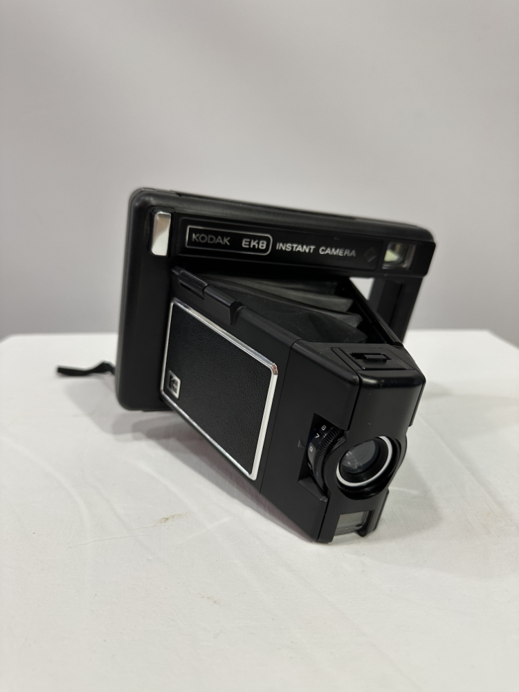 Ein Stück Fotogeschichte aus der analogen Ära: Die Kodak EK8 Instant Camera stammt aus den späten 1970er Jahren und wurde in Deutschland gefertigt. Das Modell gehörte zur bekannten EK-Serie, mit der Kodak den Sofortbildmarkt revolutionieren wollte. Charakteristisch sind das klappbare Balgen Design, der robuste Kunststoffkorpus in Schwarz und die Kombination aus klarer Linienführung und funktionaler Eleganz.