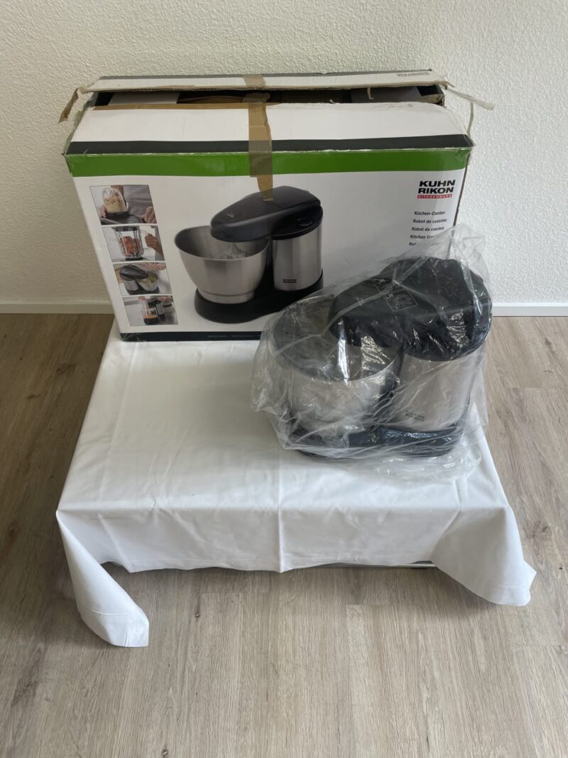 Vielseitige Küchenmaschine von Kuhn Rikon mit umfangreichem Zubehör und originaler Verpackung. Das Modell Kitchen Center FP2501 kombiniert mehrere Küchengeräte in einem System und eignet sich zum Mixen, Kneten, Hacken, Schneiden und Raspeln. Die grosse Edelstahl-Mixschüssel mit automatischer Drehfunktion sorgt für gleichmässiges Arbeiten, während der Glas-Mixbehälter und der Mini-Zerkleinerer zusätzliche Funktionen bieten. Mit verschiedenen Aufsätzen lassen sich zahlreiche Küchenarbeiten erledigen, vom Teig kneten bis zum Gemüse schneiden. Alle Teile sind noch original verpackt und unbenutzt.
