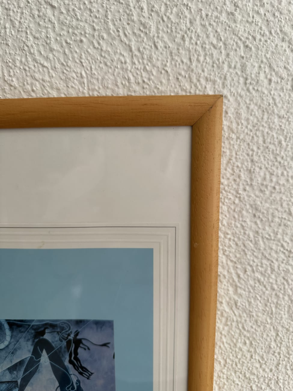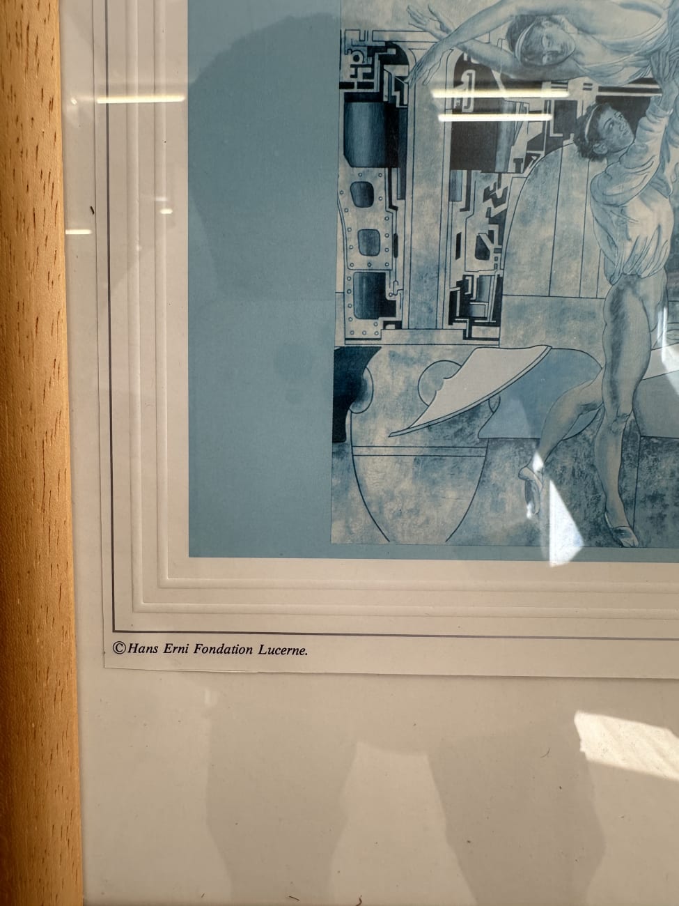Feine Linien, zahlreiche Figuren und eine komplexe Bildsprache prägen diese Grafik des bekannten Schweizer Künstlers Hans Erni. Das Motiv zeigt die Entwicklung der Menschheit mit Szenen aus Mythologie, Wissenschaft, Technik und Gesellschaft. Grundlage ist das berühmte Fresko „The Development of Mankind“ aus dem Jahr 1954, das Hans Erni für das Ethnographische Museum in Neuchâtel entworfen hat. Die Darstellung verbindet klassische Körperstudien mit modernen Themen wie Forschung und Fortschritt. Gedruckt in kühlen Blauabstufungen wirkt das Bild ruhig und gleichzeitig sehr detailreich. Präsentiert wird die Grafik hinter Glas mit Passepartout in einem schlichten Holzrahmen.