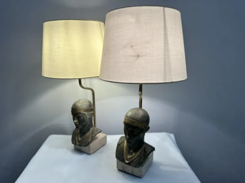 Le Dauphine France Tischleuchten / Tischlampen mit Griechischen Köpfe im 2er Set befindet sich in einem guten bis sehr guten Zustand. Diese beiden Tischleuchten kann man in einem passenden 2er Set erhalten. Sie sind wunderschön mit jeweils einem Griechischen Kopf versehen. Die beiden Tischleuchten kommen von Frankreich. Die Beiden Leuchten geben ein angenehmes Licht ab. Man kann sie zu zweit ausstellen, wie auch separat wie man es möchte.