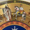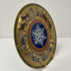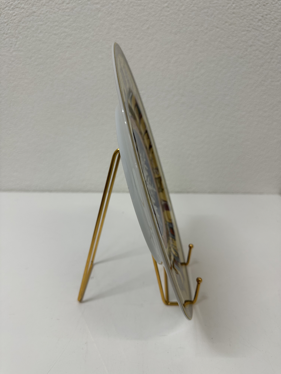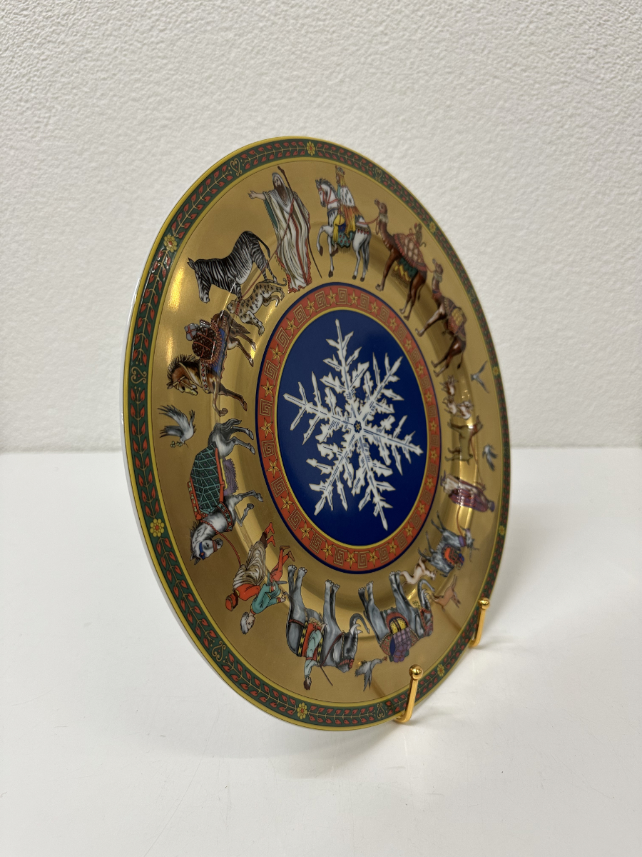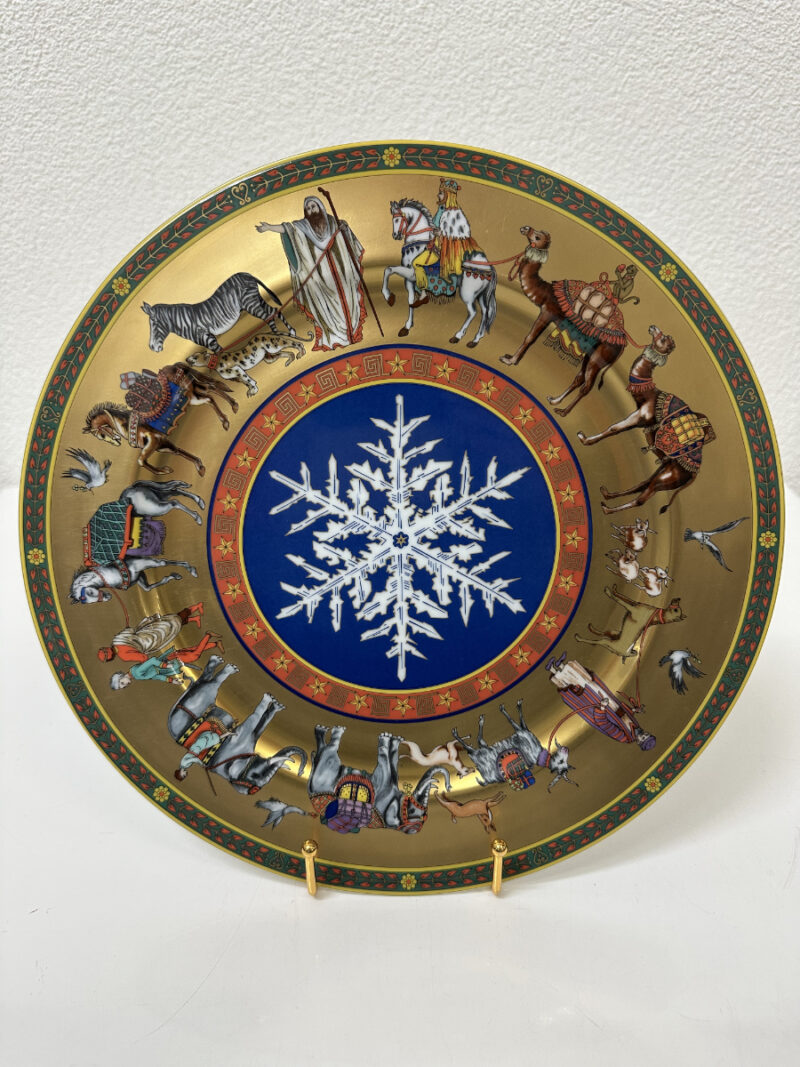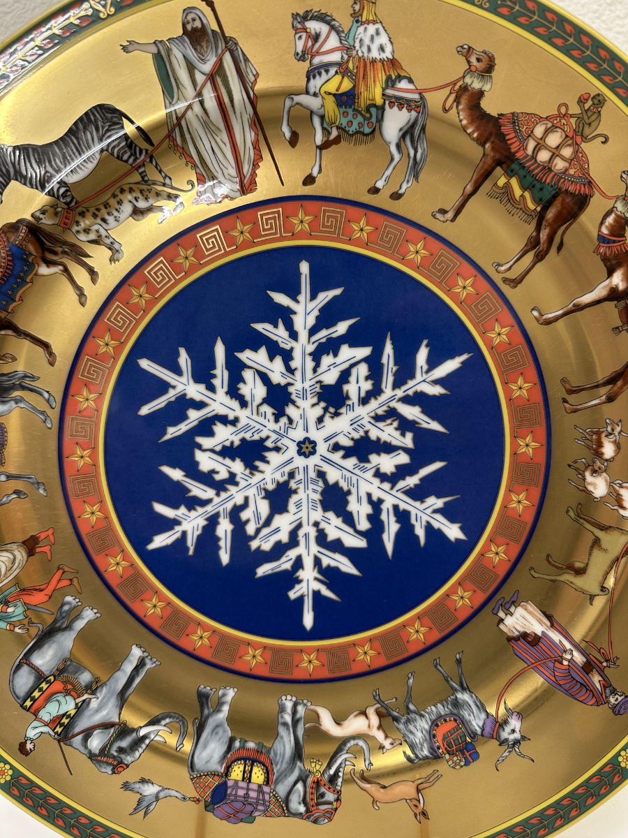 Goldgrund, kräftige Farben und eine ikonische Bildsprache prägen diesen aussergewöhnlichen Sammlerteller aus der Zusammenarbeit von Rosenthal und Versace. Die Edition «Cortège de Noël» aus dem Jahr 1998 zeigt einen festlichen Zug mit Tieren, Figuren und orientalisch anmutenden Details, arrangiert um eine zentrale, tiefblaue Schneeflocke. Die Darstellung wirkt erzählerisch, reich dekoriert und typisch für den opulenten Versace-Stil der späten 1990er Jahre.