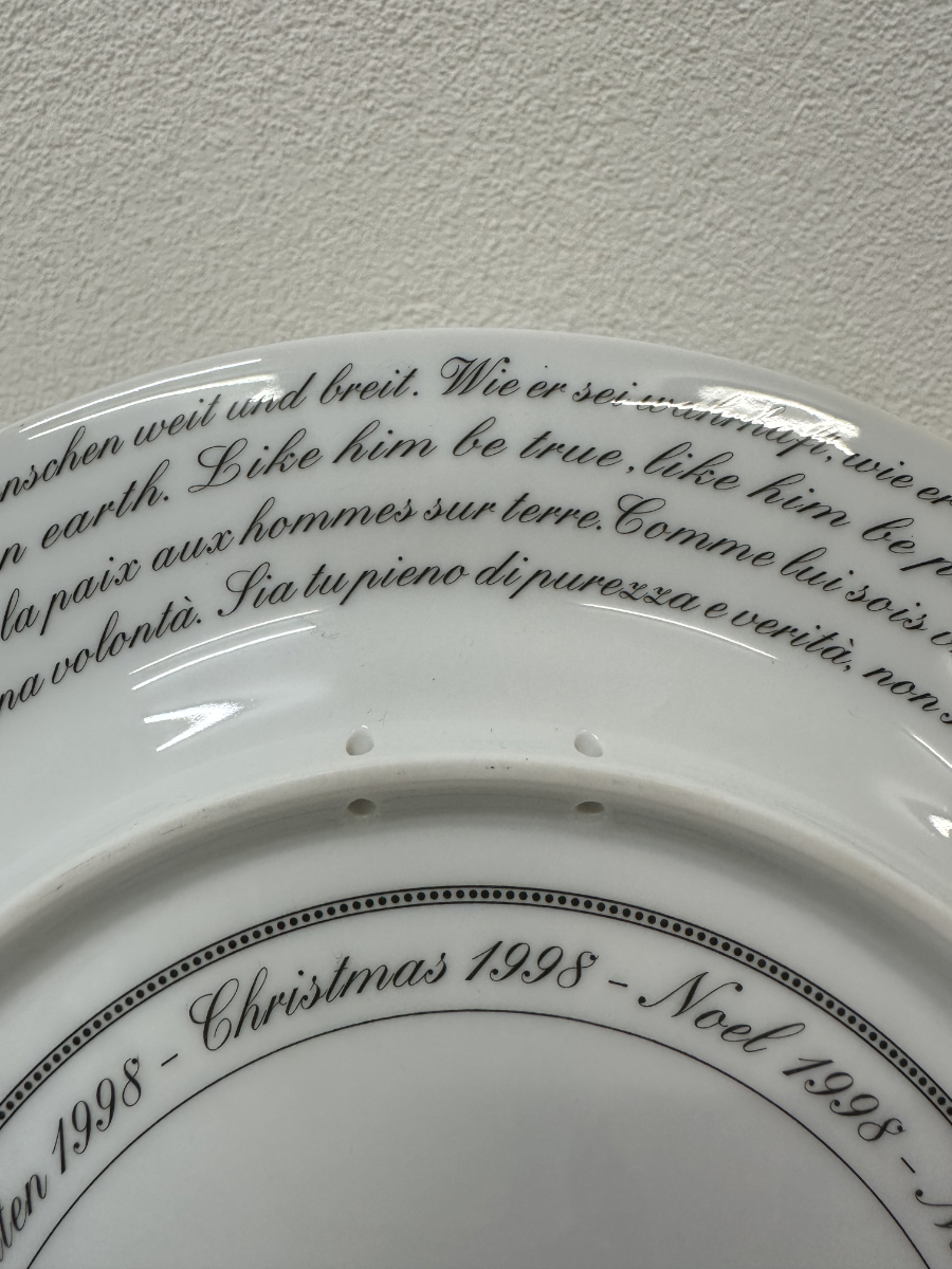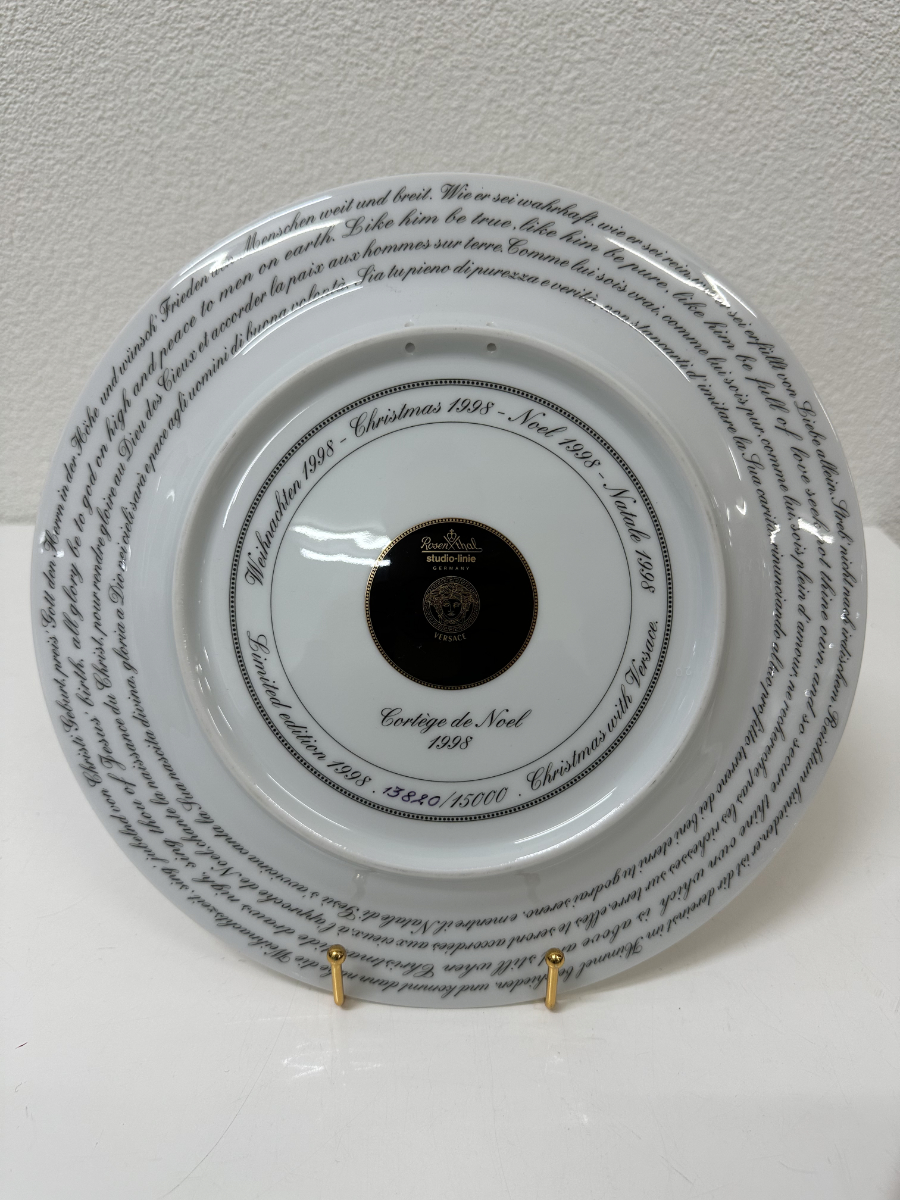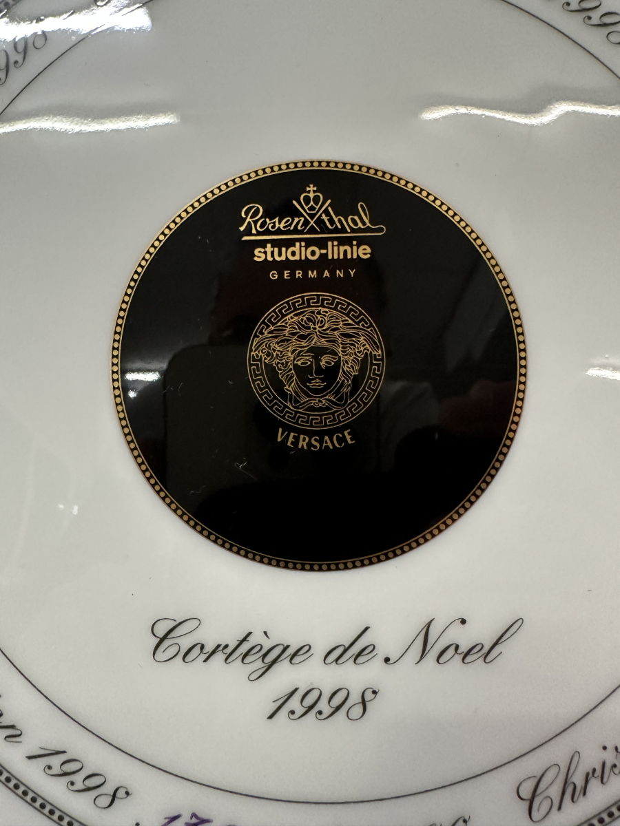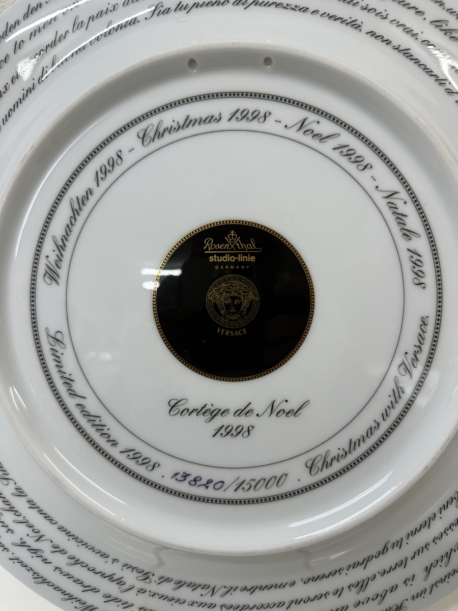 Der Teller gehört zur Rosenthal studio-line und wurde in Deutschland gefertigt. Auf der Rückseite ist er klar bezeichnet mit Rosenthal studio-line Germany, Versace sowie dem Titel «Cortège de Noël 1998». Zusätzlich ist die Limitierung angegeben, wodurch dieses Stück eindeutig als Sammlerobjekt ausgewiesen ist. Die rückseitige Beschriftung in mehreren Sprachen unterstreicht den internationalen Charakter dieser Edition.