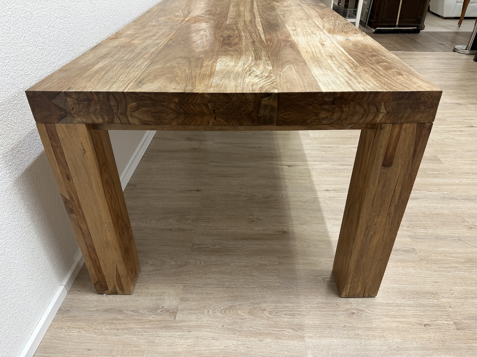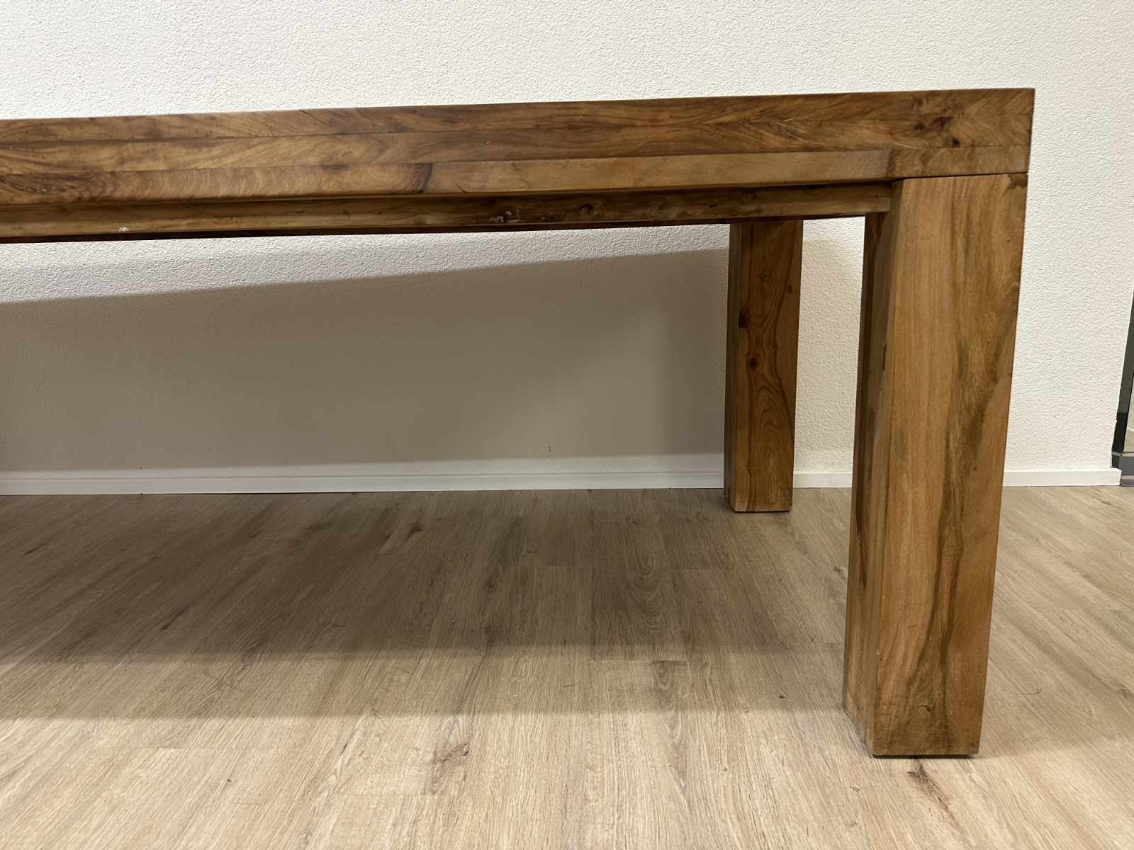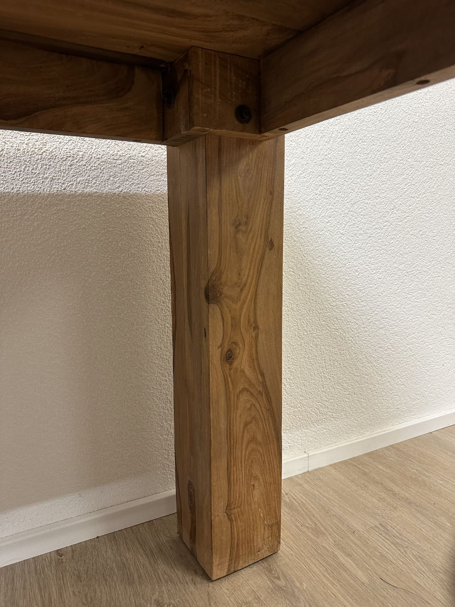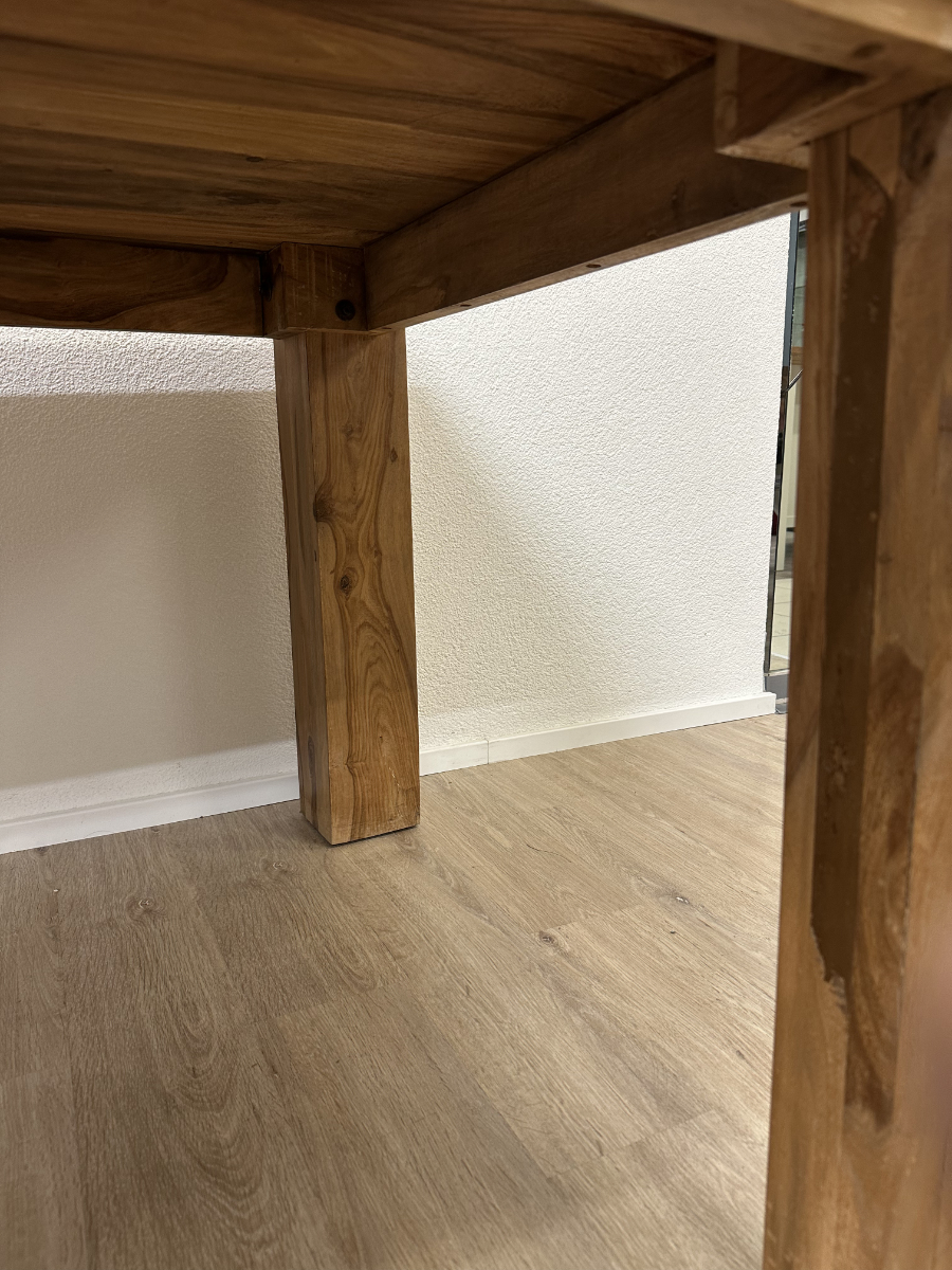 230 cm Länge bringen sofort Präsenz in den Raum. Die massive Nussbaumplatte zeigt eine lebendige Maserung mit natürlichen Farbverläufen von warmem Honig bis tiefem Braun. Dazu kommen kräftige, kantige Tischbeine, die den Tisch ruhig und stabil wirken lassen. Ein richtig guter Tisch für lange Abende, viele Gäste und alles, was auf einem Esstisch Platz haben soll.
