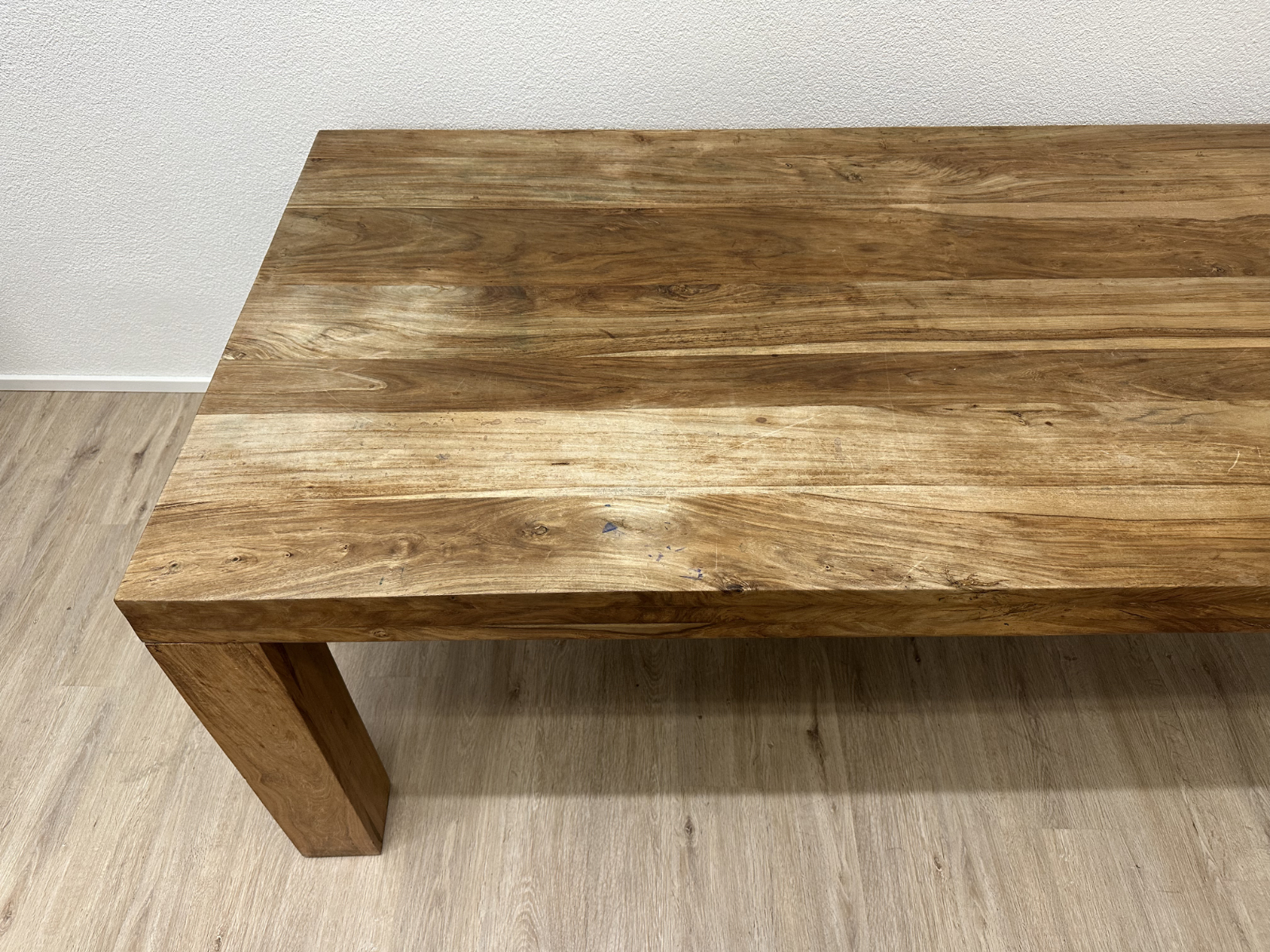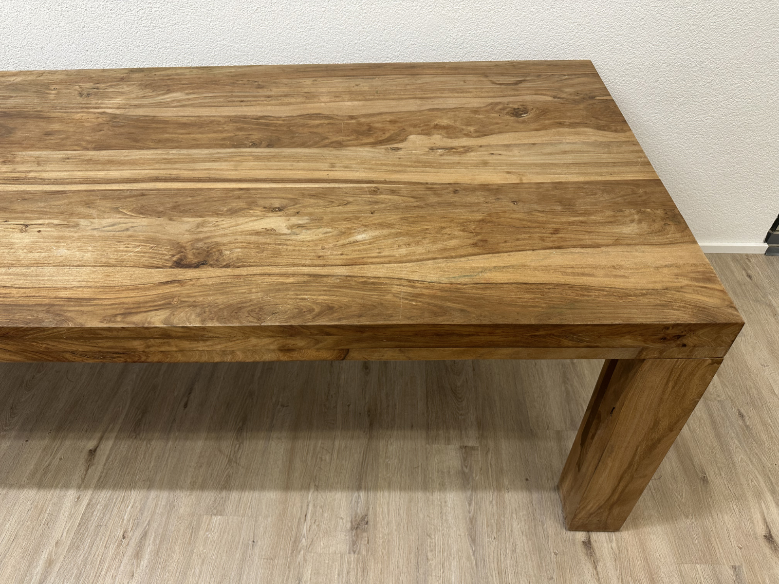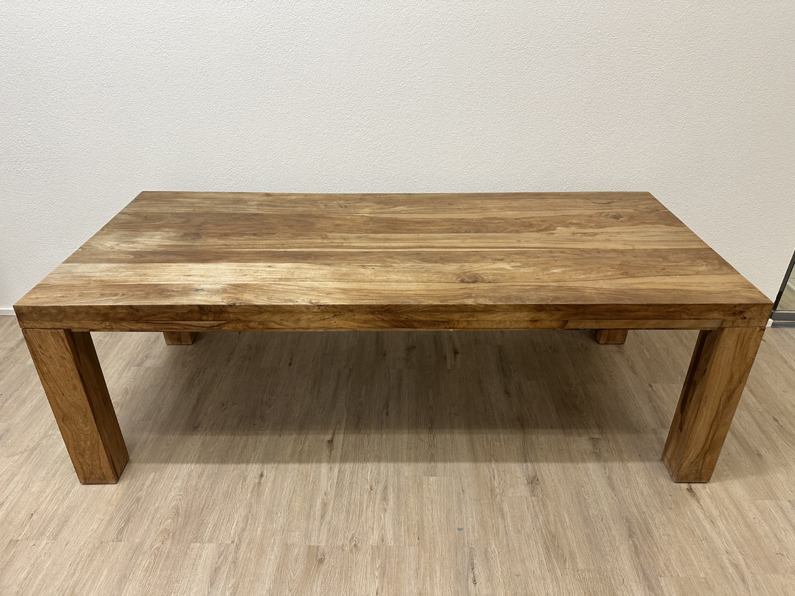 230 cm Länge bringen sofort Präsenz in den Raum. Die massive Nussbaumplatte zeigt eine lebendige Maserung mit natürlichen Farbverläufen von warmem Honig bis tiefem Braun. Dazu kommen kräftige, kantige Tischbeine, die den Tisch ruhig und stabil wirken lassen. Ein richtig guter Tisch für lange Abende, viele Gäste und alles, was auf einem Esstisch Platz haben soll.