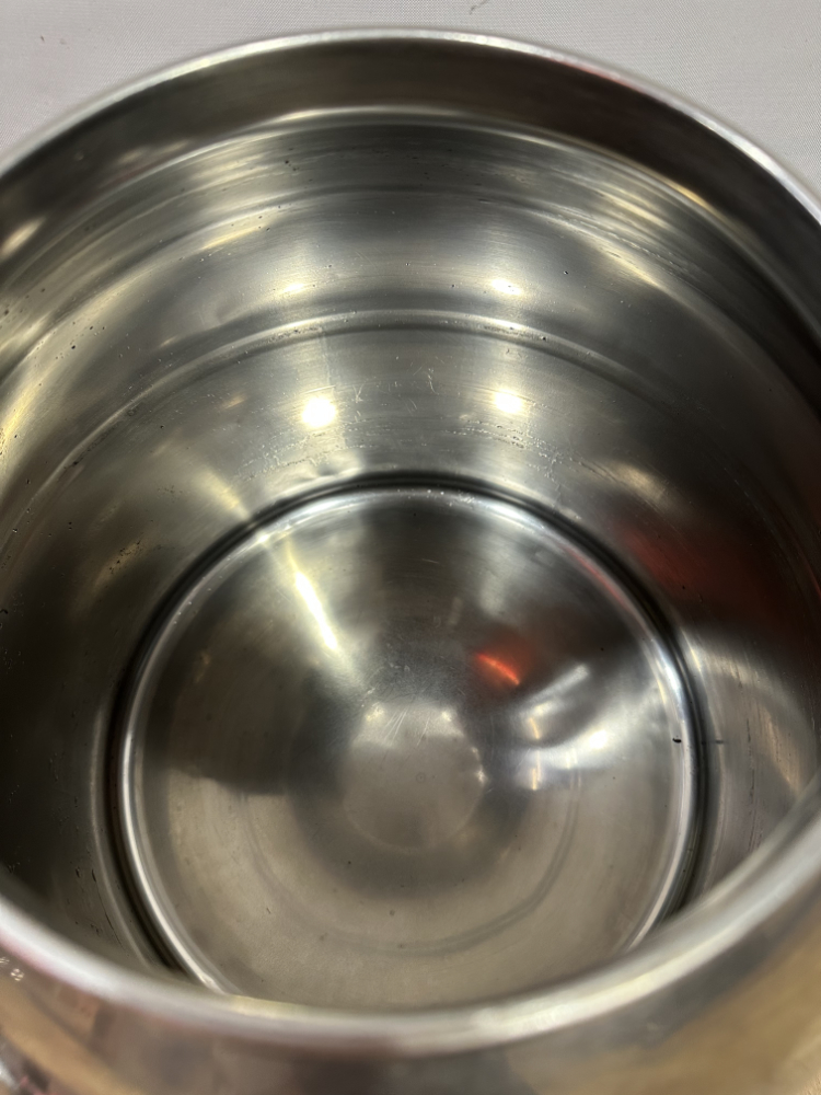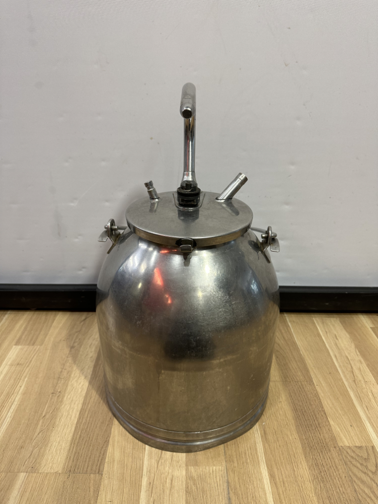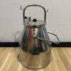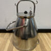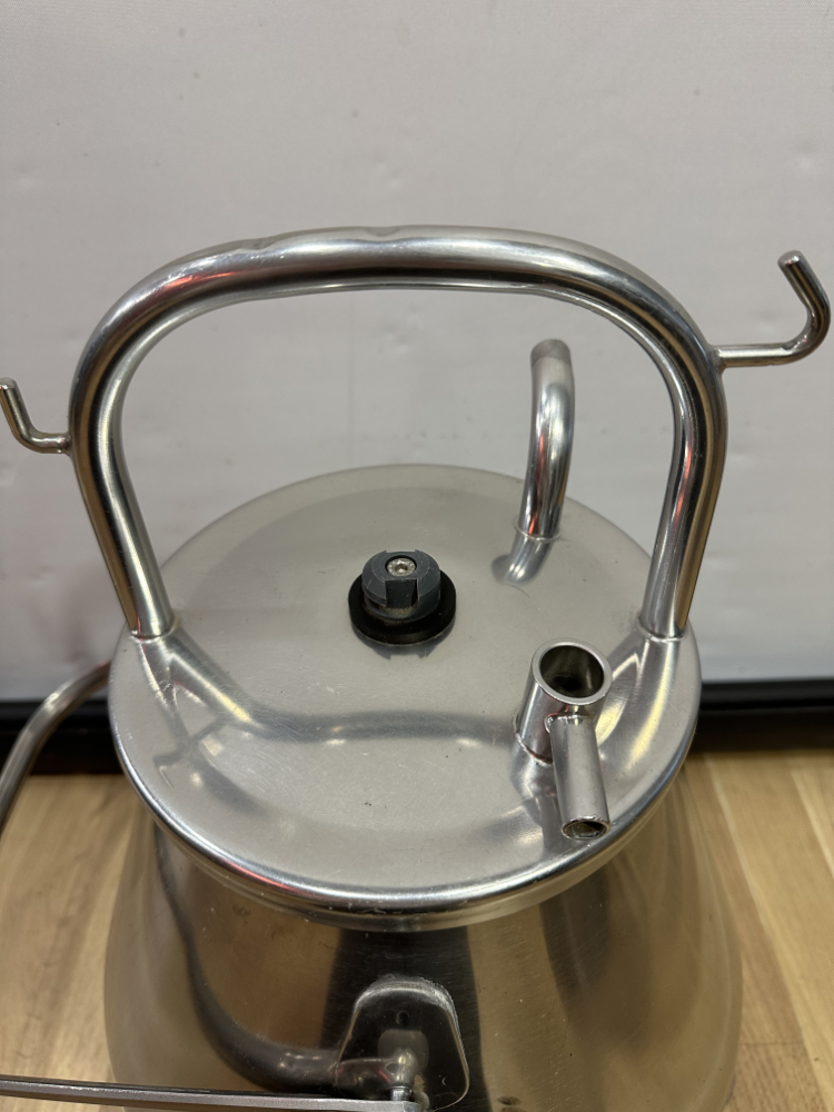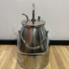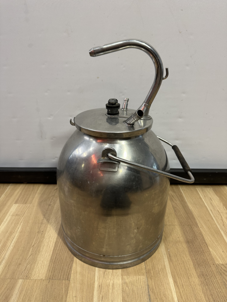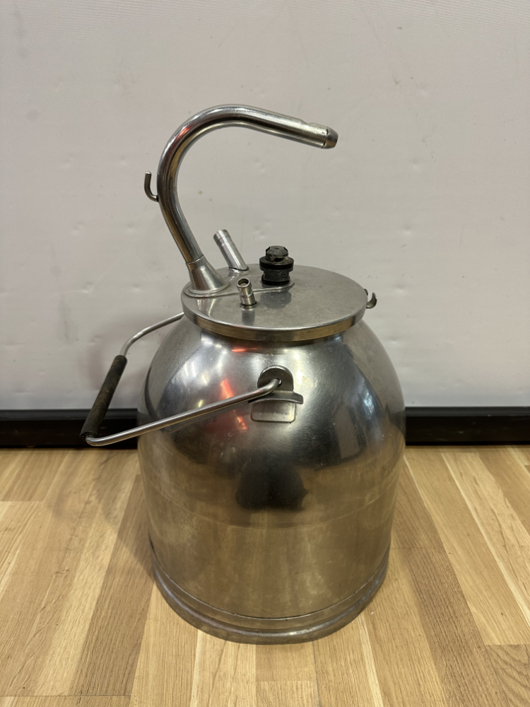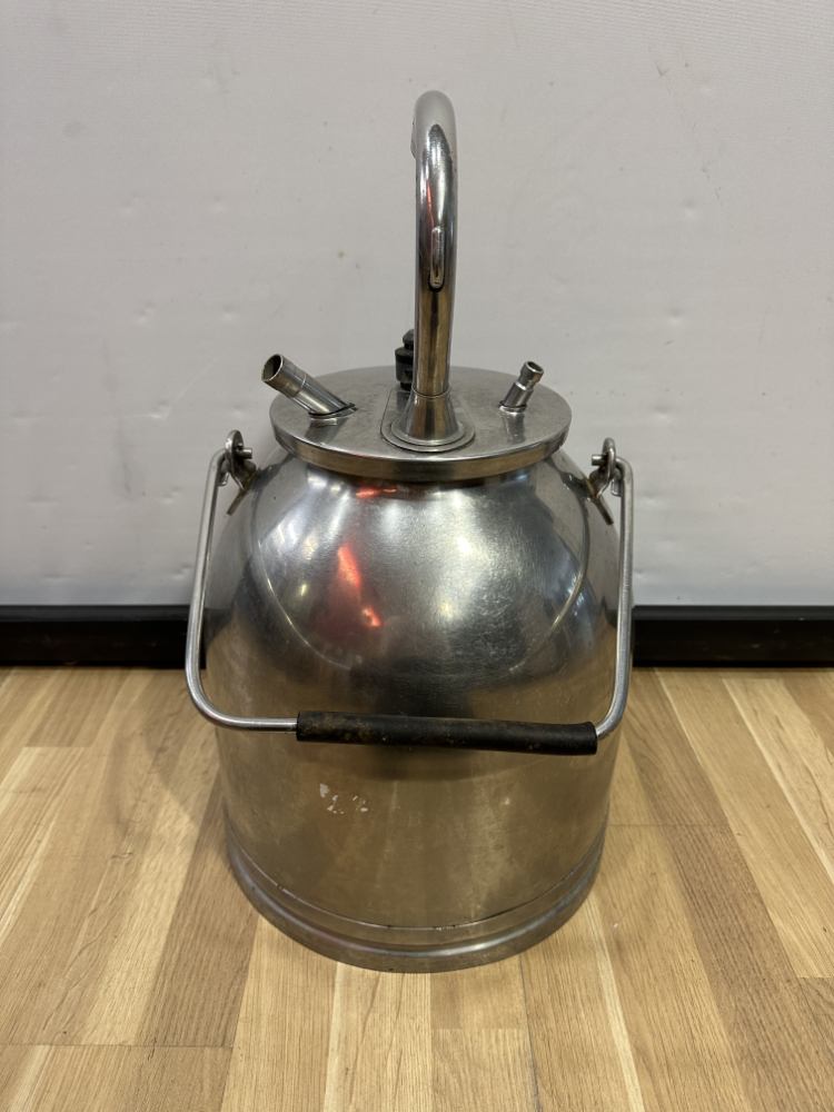 Dieses funktionale Set besteht aus zwei klassischen Milchkannen aus Aluminium inklusive originalem Melkzubehör. Beide Kannen verfügen über Deckel mit Anschlüssen und stabilen Tragegriffen. Die robuste Aluminiumkonstruktion sorgt für Langlebigkeit und einfaches Reinigen. Das dazugehörige Zubehör umfasst vier Melkbecher mit Gummidichtungen und Schläuchen – ein vollständiges Set, das auch heute noch für landwirtschaftliche Zwecke oder als nostalgisches Deko-Objekt geschätzt wird.
