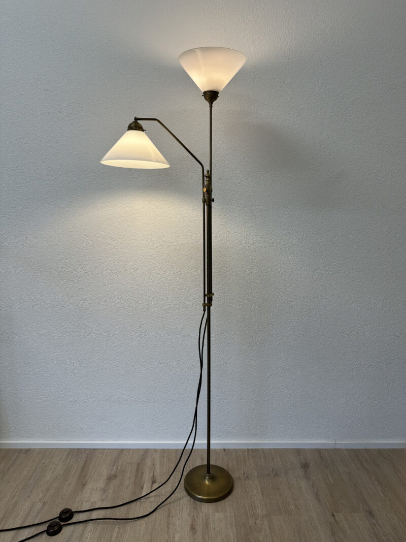 Schlanke Stehleuchte, die zwei Lichtquellen in einem Gestell vereint: oben ein Deckenfluter mit grossem Opalglasschirm für weiches Raumlicht und seitlich eine Leseleuchte, die sich gezielt ausrichten lässt. Messingfarbener Metallkörper mit schwerem Standfuss, dadurch steht sie stabil und wirkt elegant, ohne viel Platz zu brauchen. Praktisch im Alltag: beide Leuchten lassen sich getrennt schalten, dank zwei Fuss-Schaltern am Kabel.