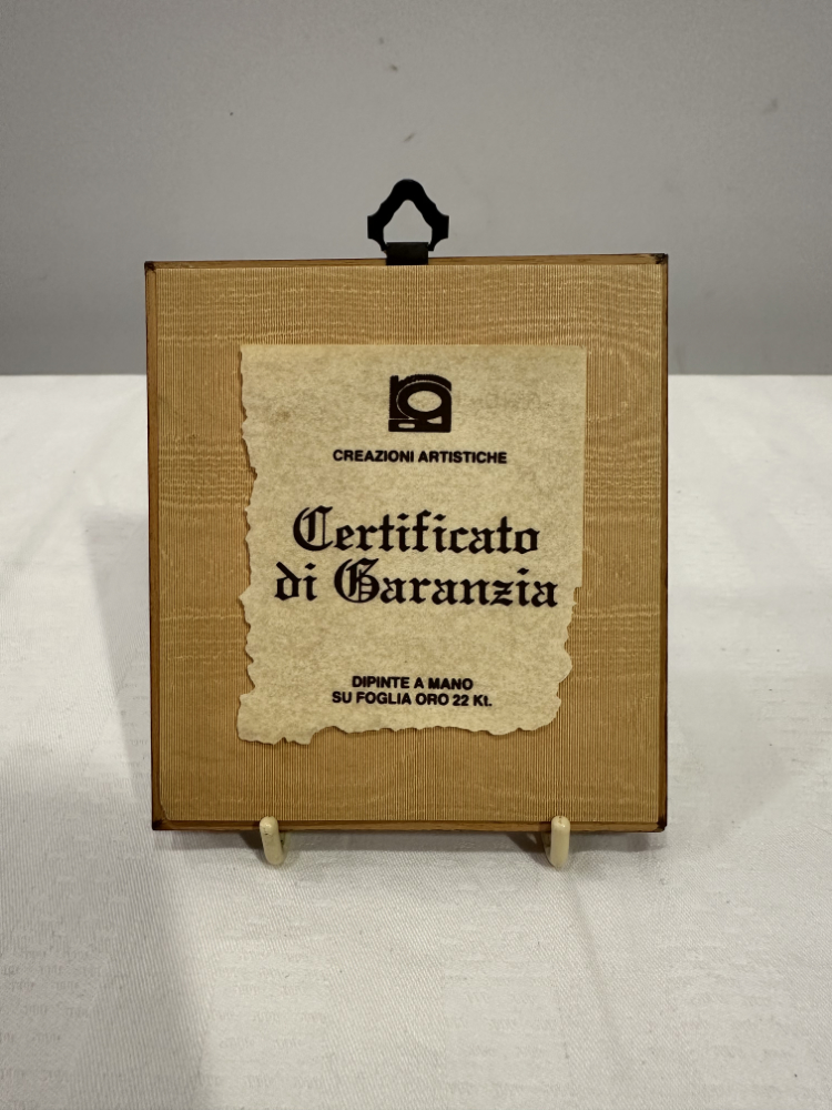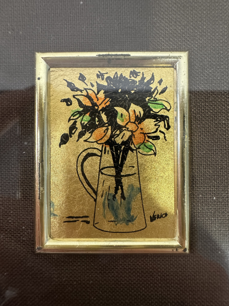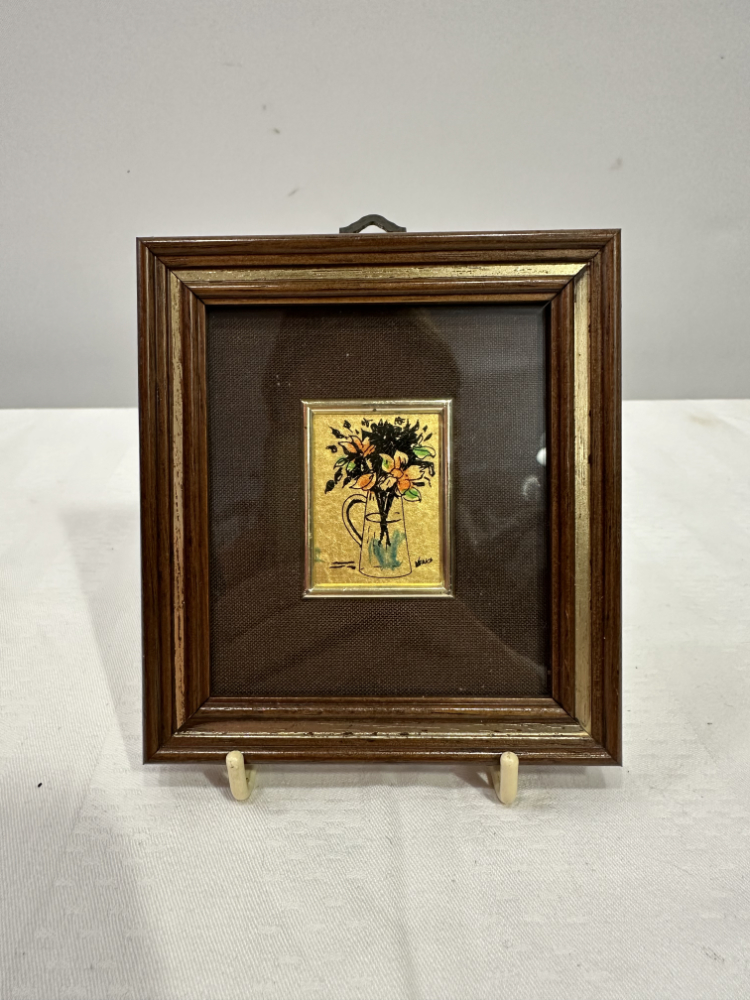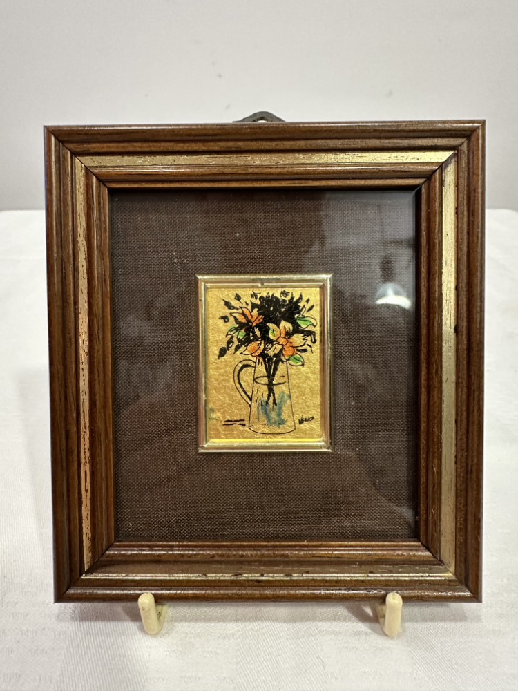 Dieses kleine, handgemalte Kunstwerk aus Italien zeigt ein Blumenstillleben in einer schlichten Vase – ausgeführt auf echtem 22-Karat-Blattgold. Die glänzende Goldfläche verleiht dem Motiv Tiefe und einen edlen Schimmer, der je nach Lichteinfall unterschiedlich wirkt. Der dunkle Hintergrund und der profilierte Holzrahmen mit Goldleiste fassen das Miniaturbild elegant ein und lassen es zu einem hochwertigen Dekorobjekt werden.