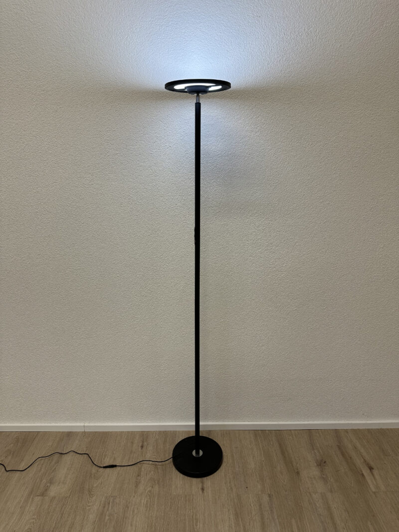 Sanftes Deckenlicht für gemütliche Abende oder als klare Zusatzbeleuchtung im Wohnzimmer. Der flache Uplight-Kopf wirft das Licht nach oben und verteilt es angenehm im Raum. Praktisch im Alltag: Touch-Bedienung direkt am Rohr und ein USB-Anschluss zum Laden von Handy oder Zubehör.