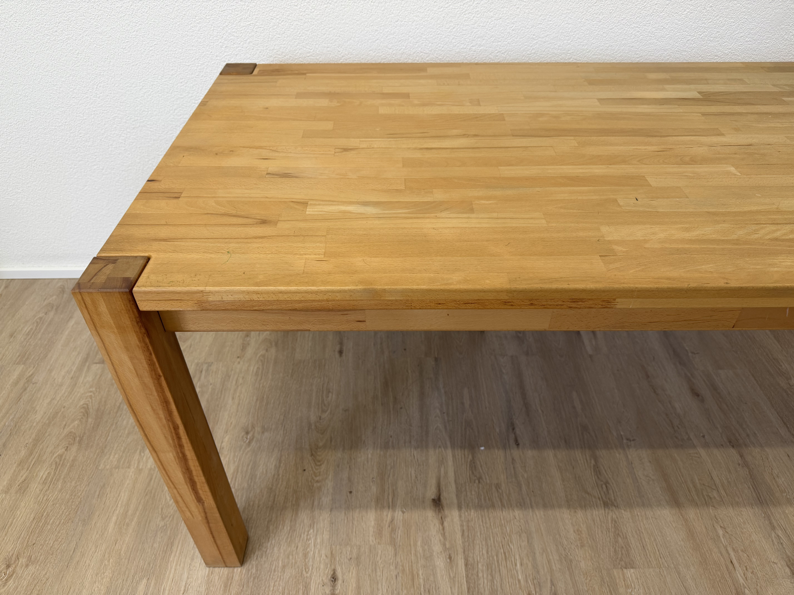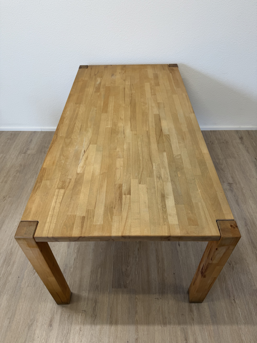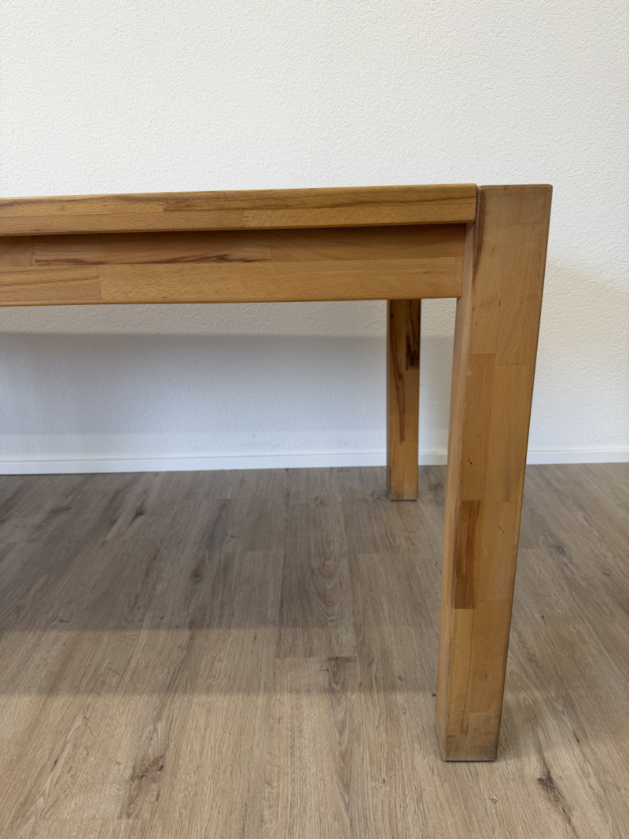 Buchenholz in warmer Naturfarbe und kräftige, eckige Beine prägen diesen Tisch. Die Tischplatte besteht aus verleimten Massivholzlamellen mit ruhigem, gleichmässigem Verlauf. Die Konstruktion wirkt bewusst schlicht und funktional. Sichtbare Holzstruktur und leichte Farbnuancen unterstreichen den natürlichen Charakter.