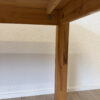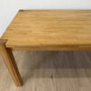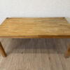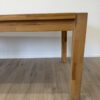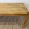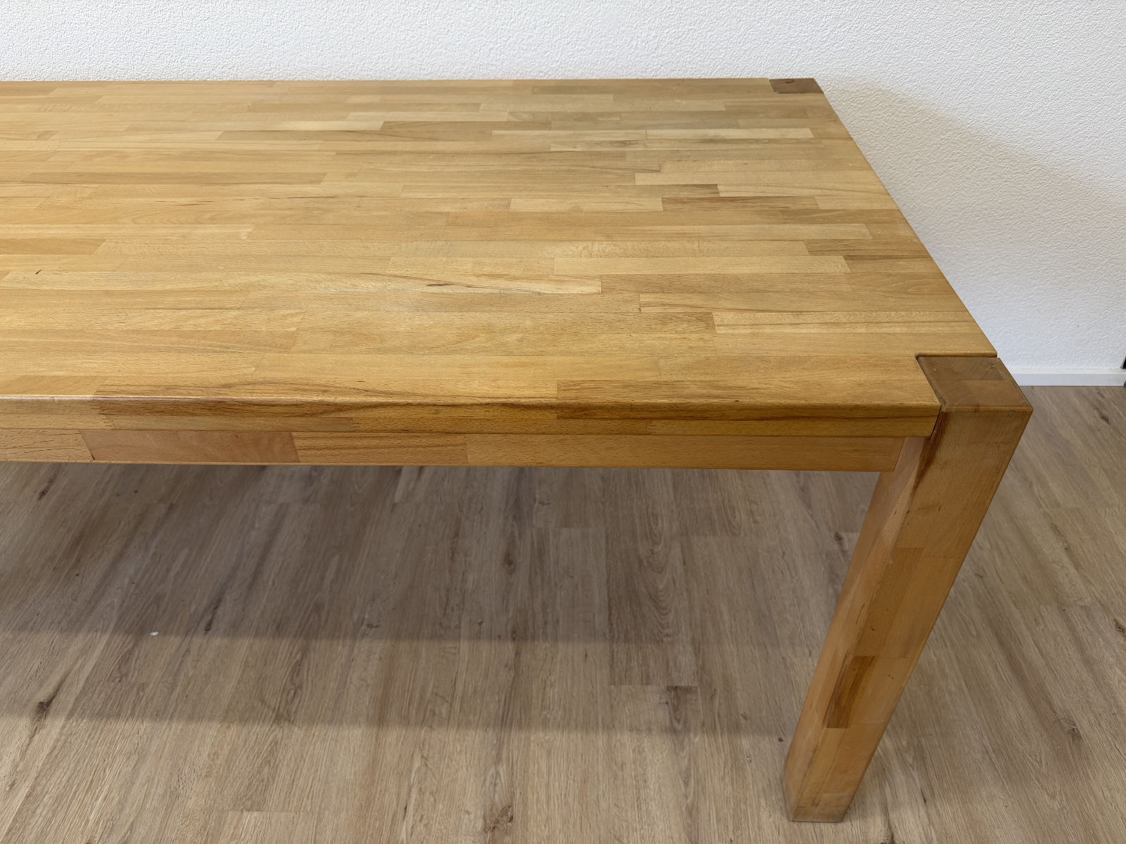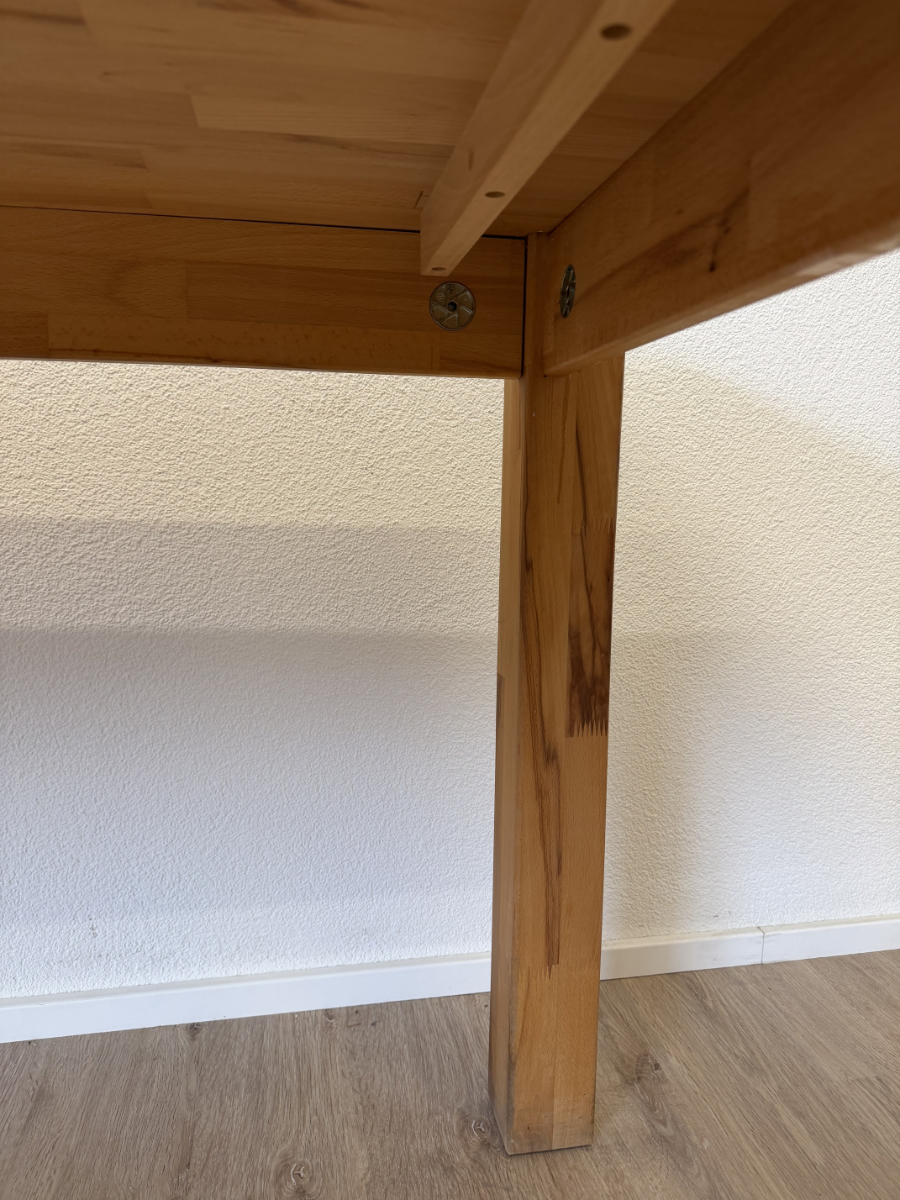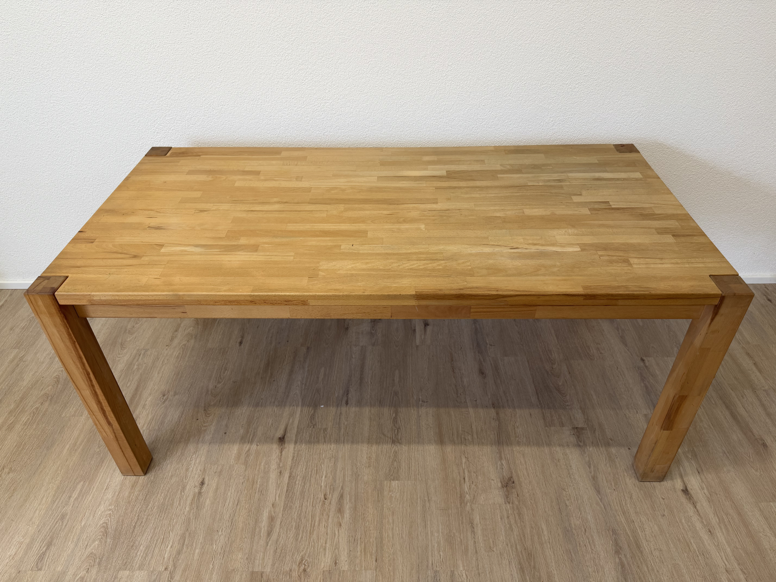 Buchenholz in warmer Naturfarbe und kräftige, eckige Beine prägen diesen Tisch. Die Tischplatte besteht aus verleimten Massivholzlamellen mit ruhigem, gleichmässigem Verlauf. Die Konstruktion wirkt bewusst schlicht und funktional. Sichtbare Holzstruktur und leichte Farbnuancen unterstreichen den natürlichen Charakter.