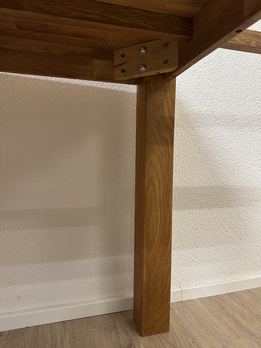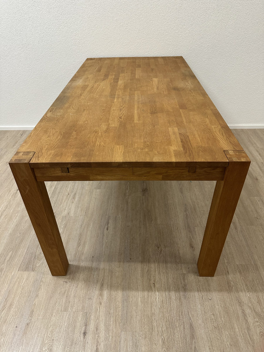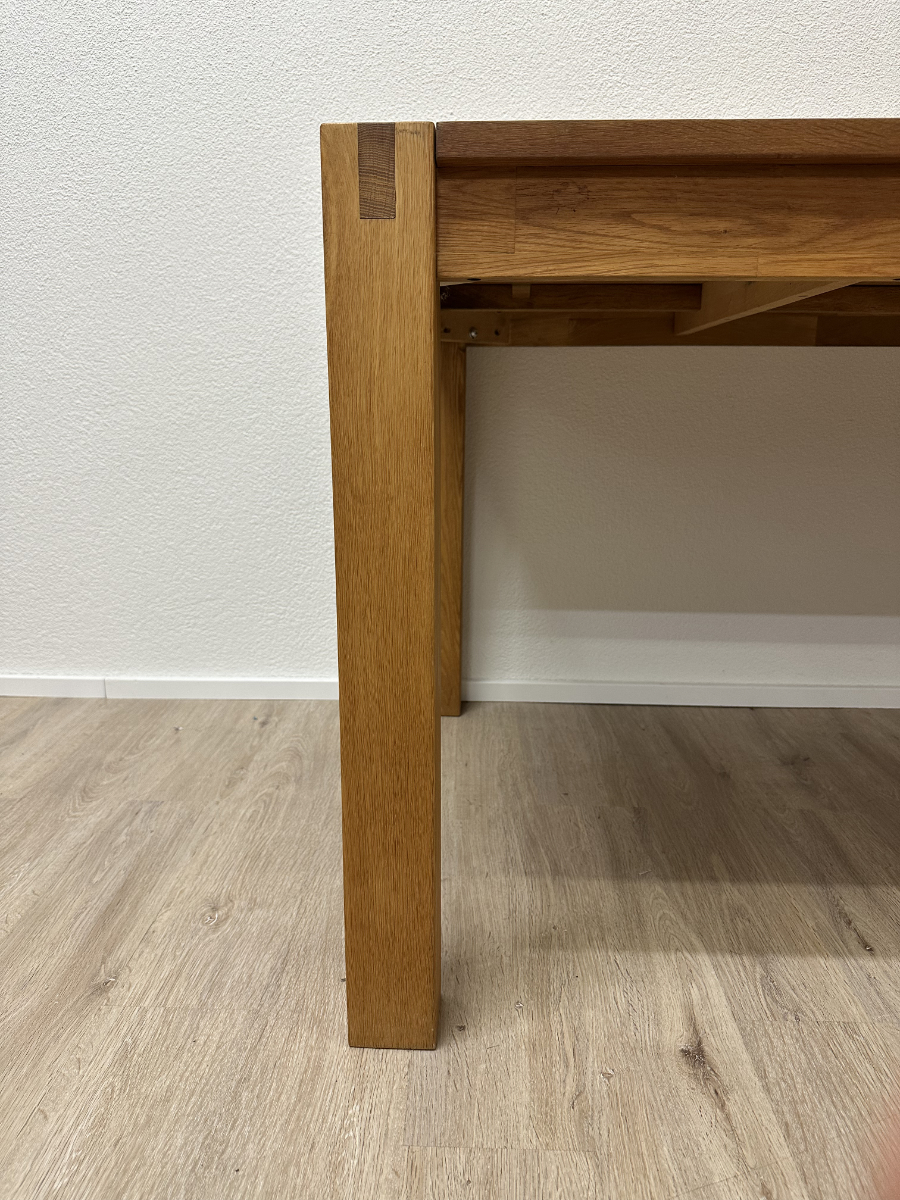 Klare Linien, warmes Eichenholz und eine stabile Konstruktion machen diesen Tisch zum unkomplizierten Mittelpunkt für Alltag und Gäste. Die Tischplatte besteht aus massivem Eichenholz mit schöner Maserung, dazu kommen kräftige, kantige Beine und ein ruhiger, zeitloser Look. Praktisch: An den Stirnseiten sind Auszugteile vorhanden, ideal wenn du den Tisch mit zusätzlichen Einlagen verlängern möchtest oder mehr Platz am Tisch brauchst.