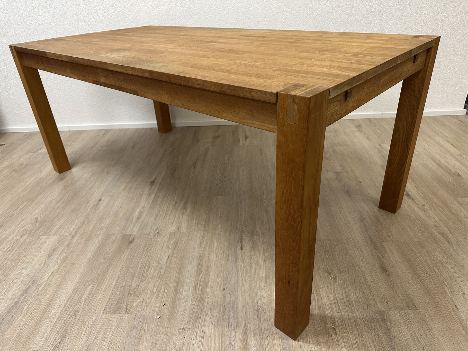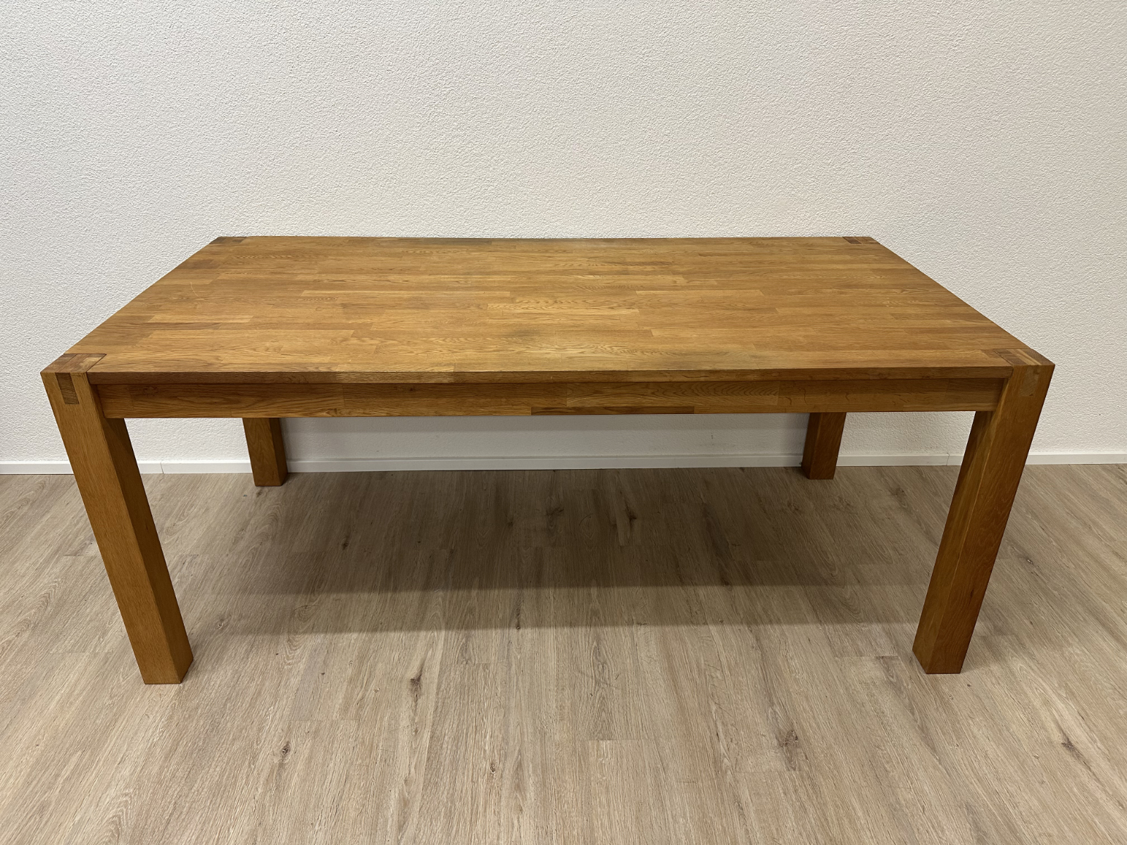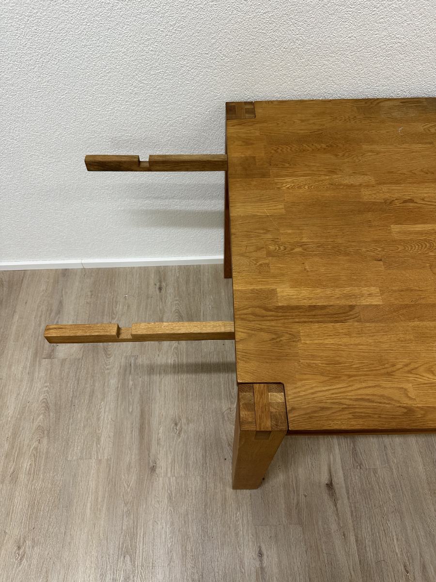 Klare Linien, warmes Eichenholz und eine stabile Konstruktion machen diesen Tisch zum unkomplizierten Mittelpunkt für Alltag und Gäste. Die Tischplatte besteht aus massivem Eichenholz mit schöner Maserung, dazu kommen kräftige, kantige Beine und ein ruhiger, zeitloser Look. Praktisch: An den Stirnseiten sind Auszugteile vorhanden, ideal wenn du den Tisch mit zusätzlichen Einlagen verlängern möchtest oder mehr Platz am Tisch brauchst.