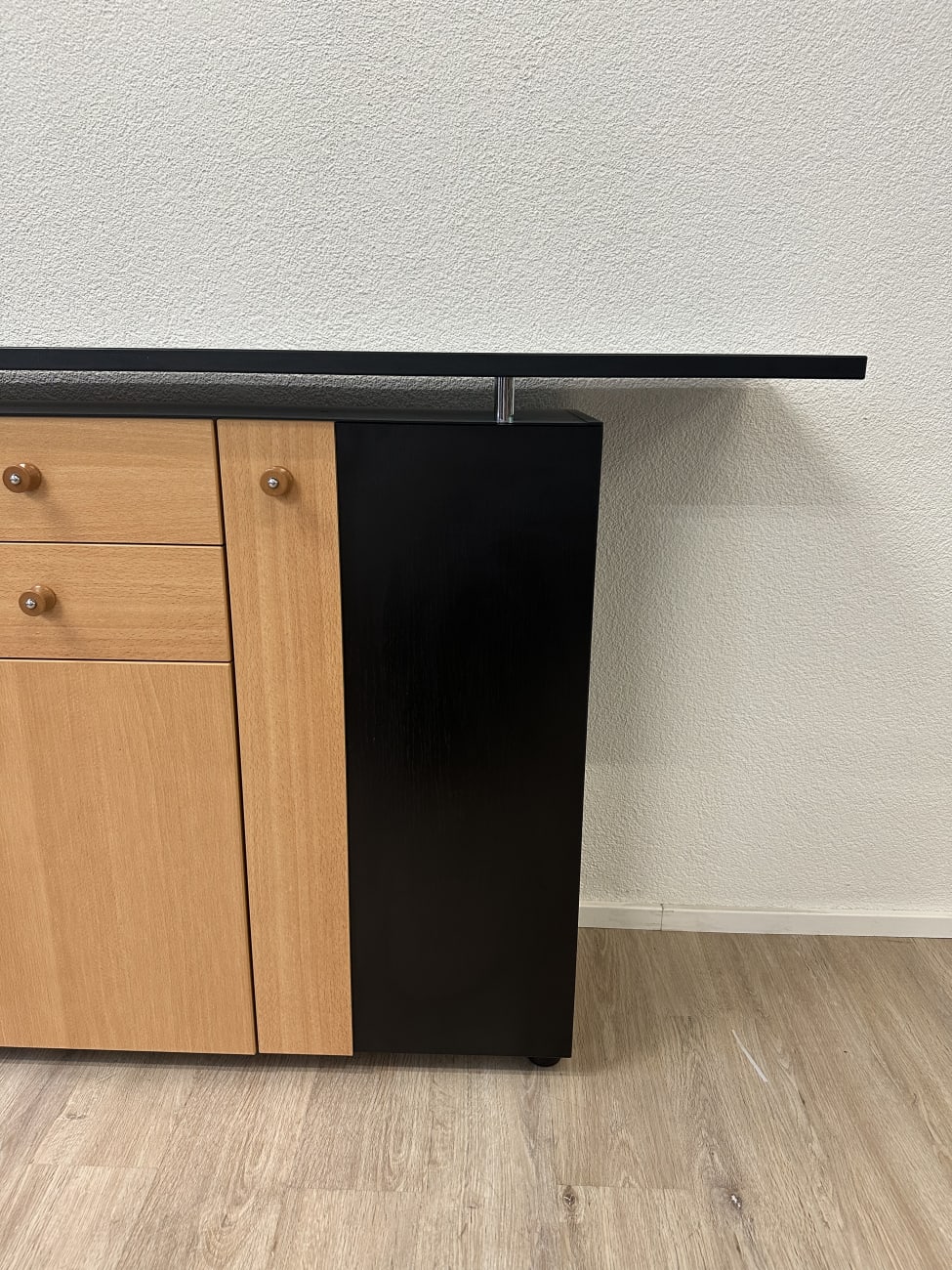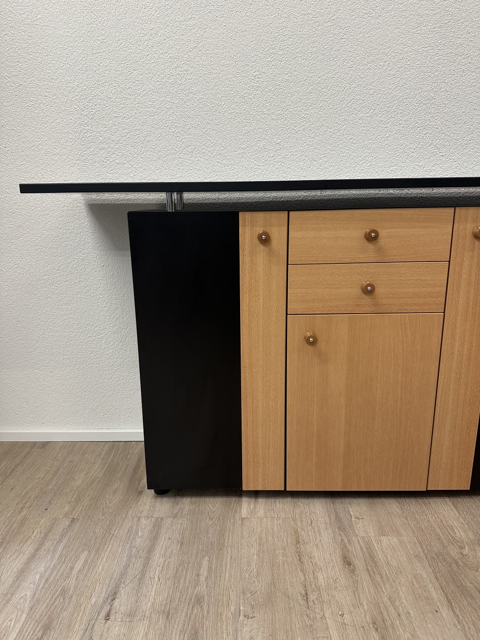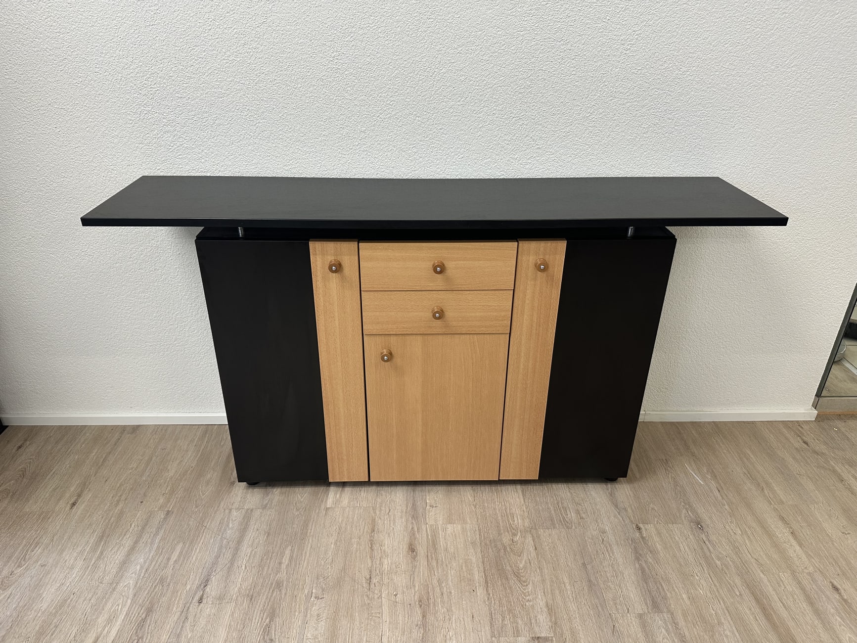 Klare Linien, zweifarbige Front und eine erhöhte Ablagefläche machen dieses Möbelstück sofort auffällig. Schwarze Seiten treffen auf warme Holzoptik in der Mitte, wodurch ein moderner Kontrast entsteht. Die obere Platte ist leicht erhöht montiert und eignet sich gut für Deko, Pflanzen oder Geräte. Innen bietet das Möbel viel Stauraum mit Fächern, Schubladen und Türen. Ideal für Wohnzimmer, Essbereich oder auch als TV- oder Bar-Möbel.