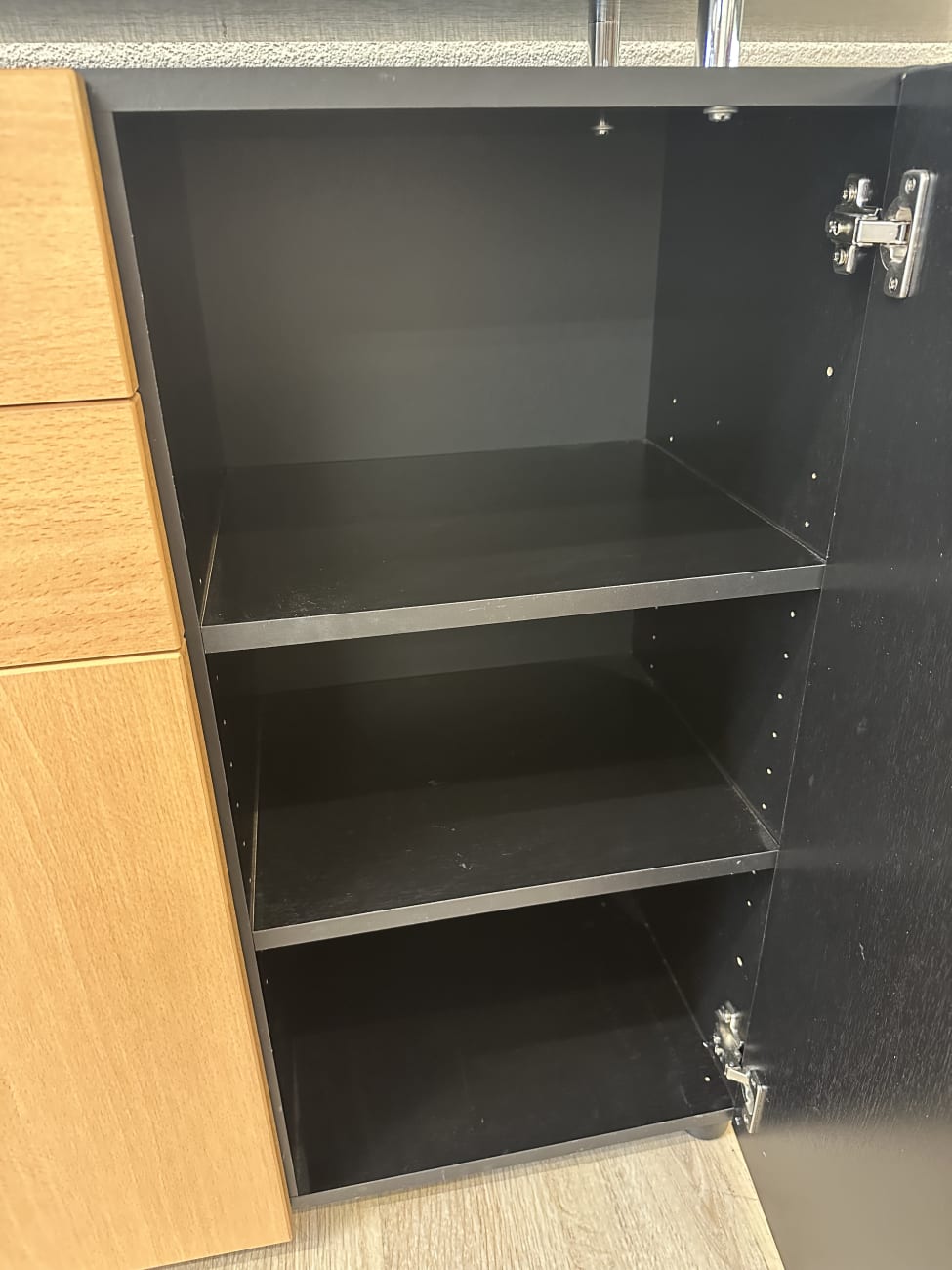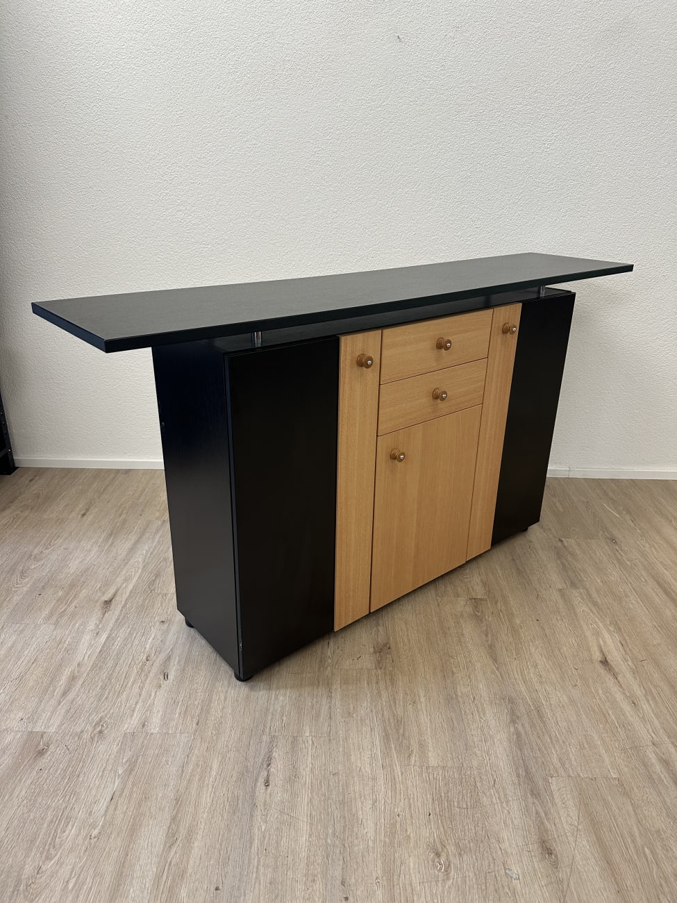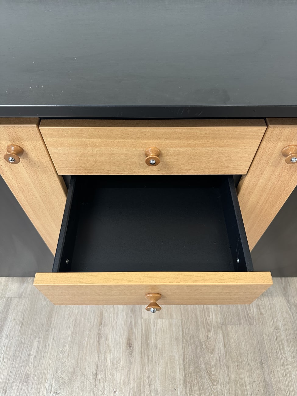 Klare Linien, zweifarbige Front und eine erhöhte Ablagefläche machen dieses Möbelstück sofort auffällig. Schwarze Seiten treffen auf warme Holzoptik in der Mitte, wodurch ein moderner Kontrast entsteht. Die obere Platte ist leicht erhöht montiert und eignet sich gut für Deko, Pflanzen oder Geräte. Innen bietet das Möbel viel Stauraum mit Fächern, Schubladen und Türen. Ideal für Wohnzimmer, Essbereich oder auch als TV- oder Bar-Möbel.