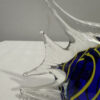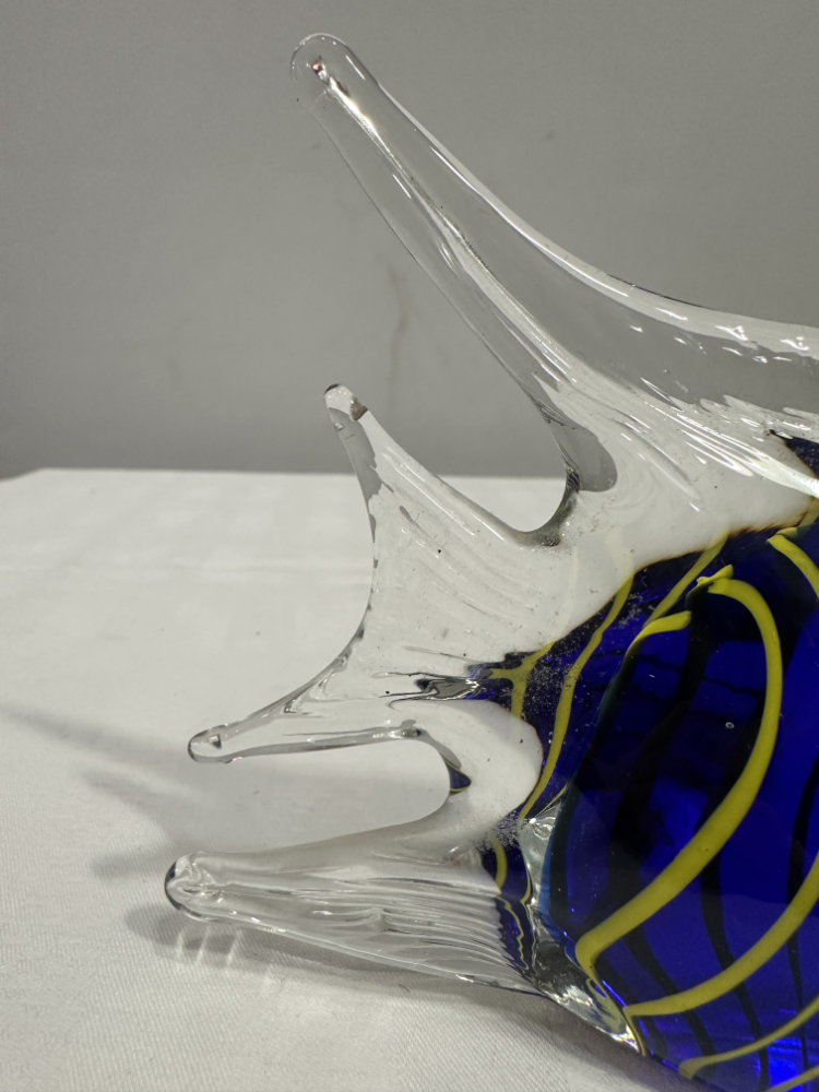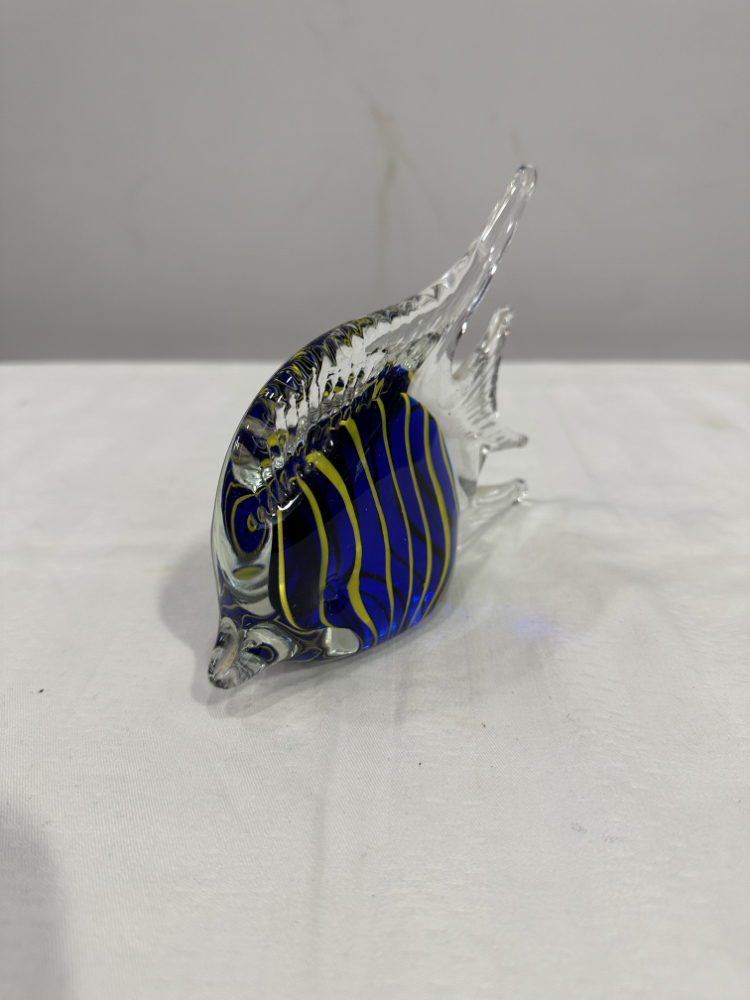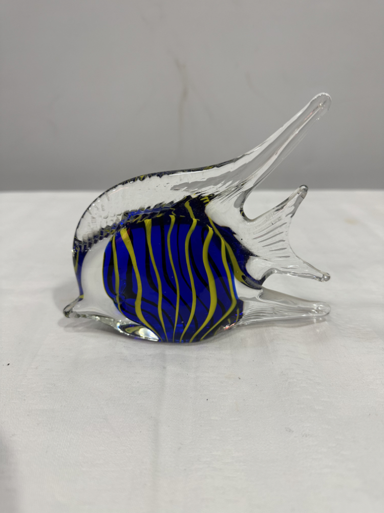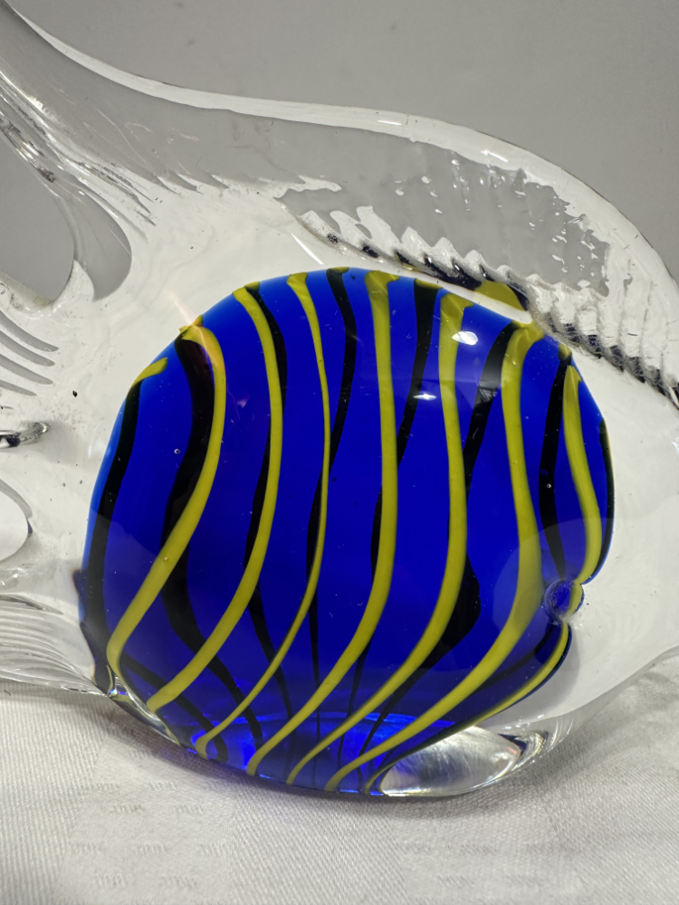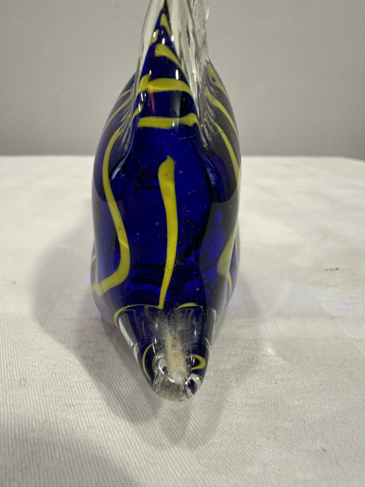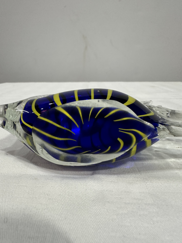 Dieser kunstvoll gefertigte Glasfisch stammt aus einer Murano Glaswerkstatt in Italien und zeigt eindrucksvoll die traditionelle venezianische Glaskunst. Die Figur wurde aus klarem Glas frei geformt, mit einem intensiv leuchtenden Kobaltblau im Inneren, das durch geschwungene gelbe Streifen lebendig kontrastiert wird.