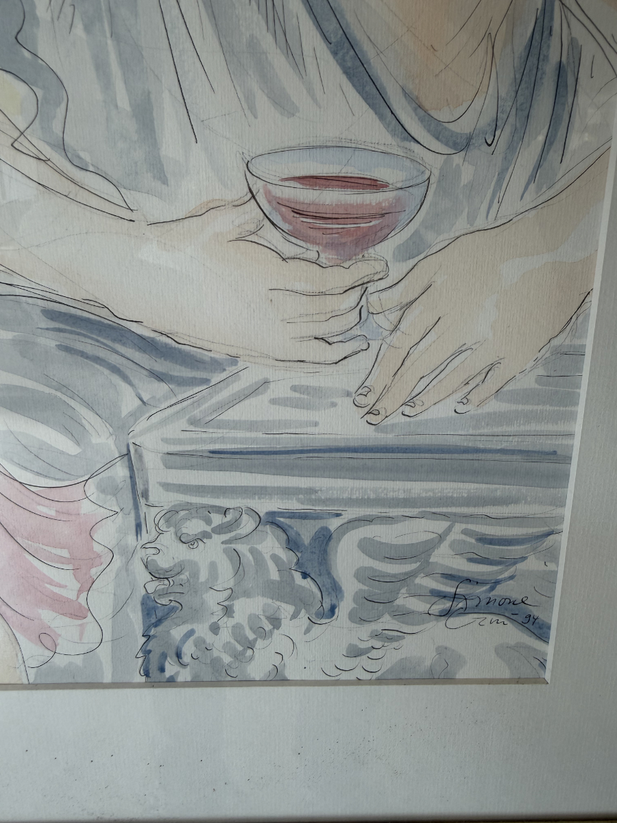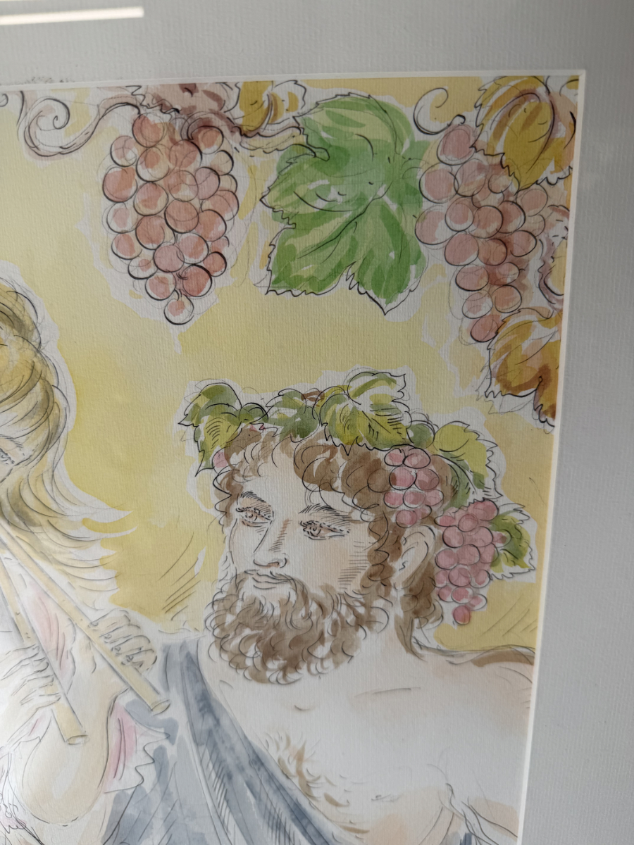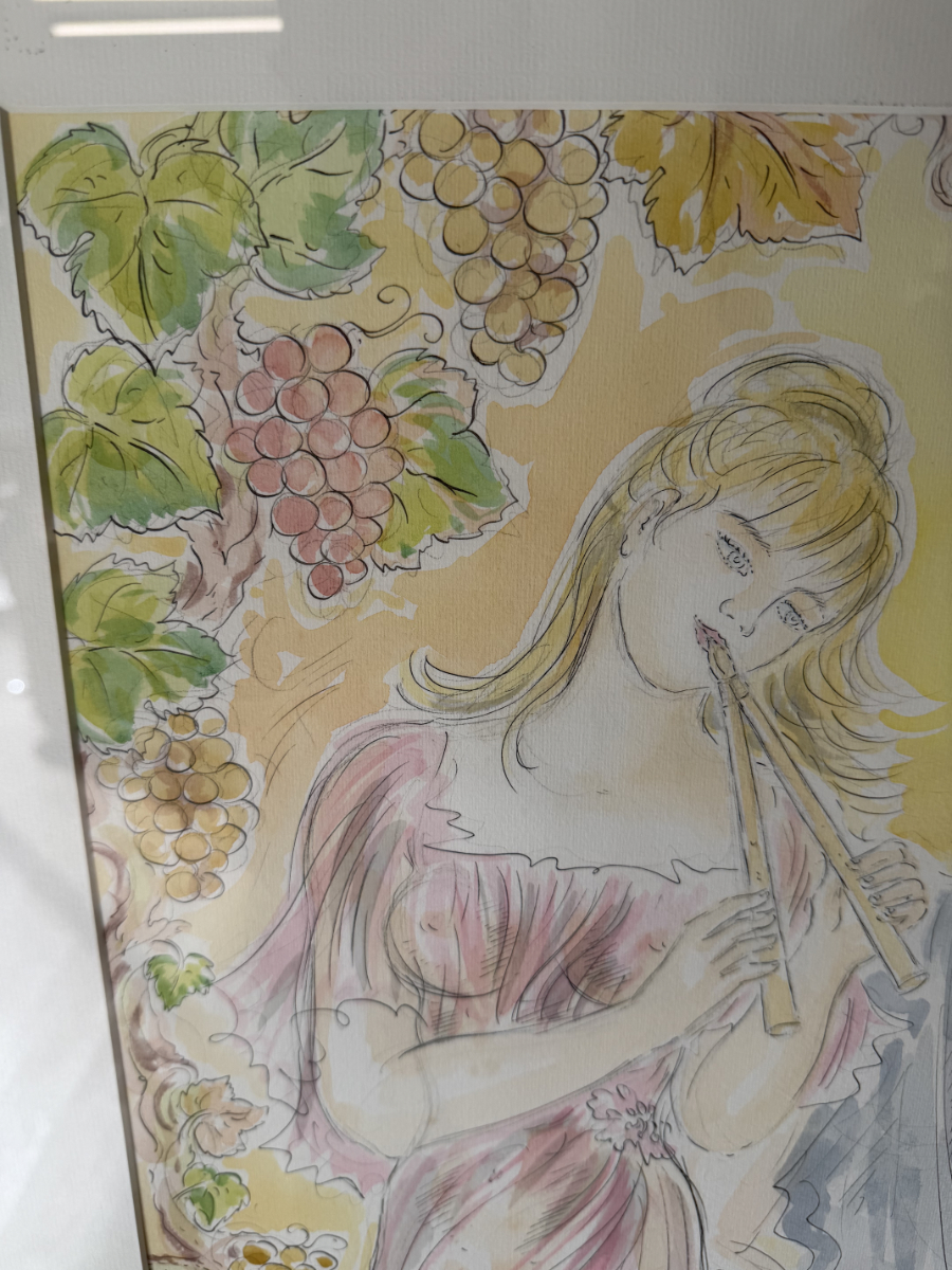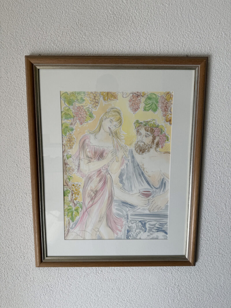 Ein signiertes Aquarell der Schweizer Künstlerin Simone Erni (geb. Fornara) aus dem Jahr 1994. Die Darstellung zeigt eine klassisch anmutende Szene: eine Frau mit Doppelflöte und ein bärtiger Mann mit Traubenkranz und Weinbecher. Weinreben im Hintergrund schaffen eine warme, mediterrane Stimmung. Das Bild kombiniert feine Tuschelinien mit transparenten Aquarellfarben in Rosa, Grün, Ocker und Hellblau.