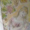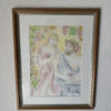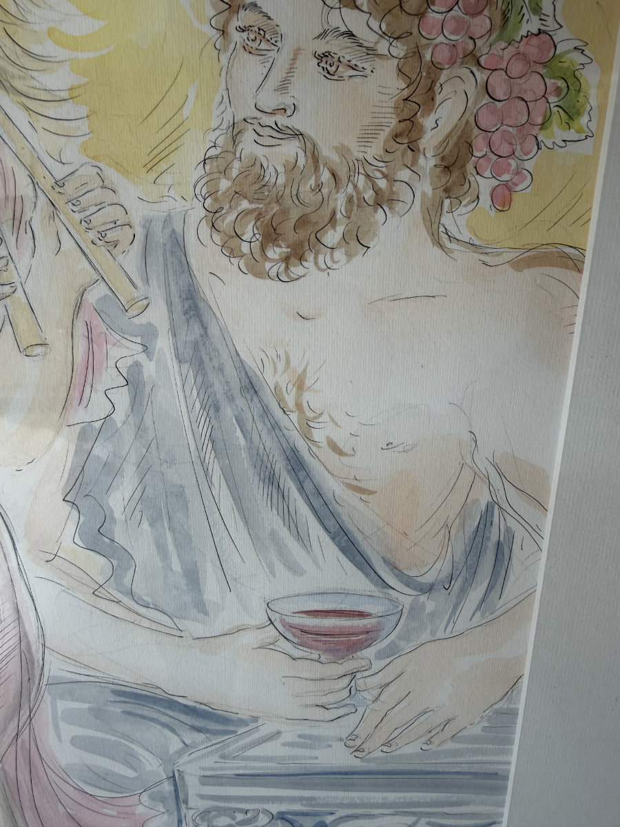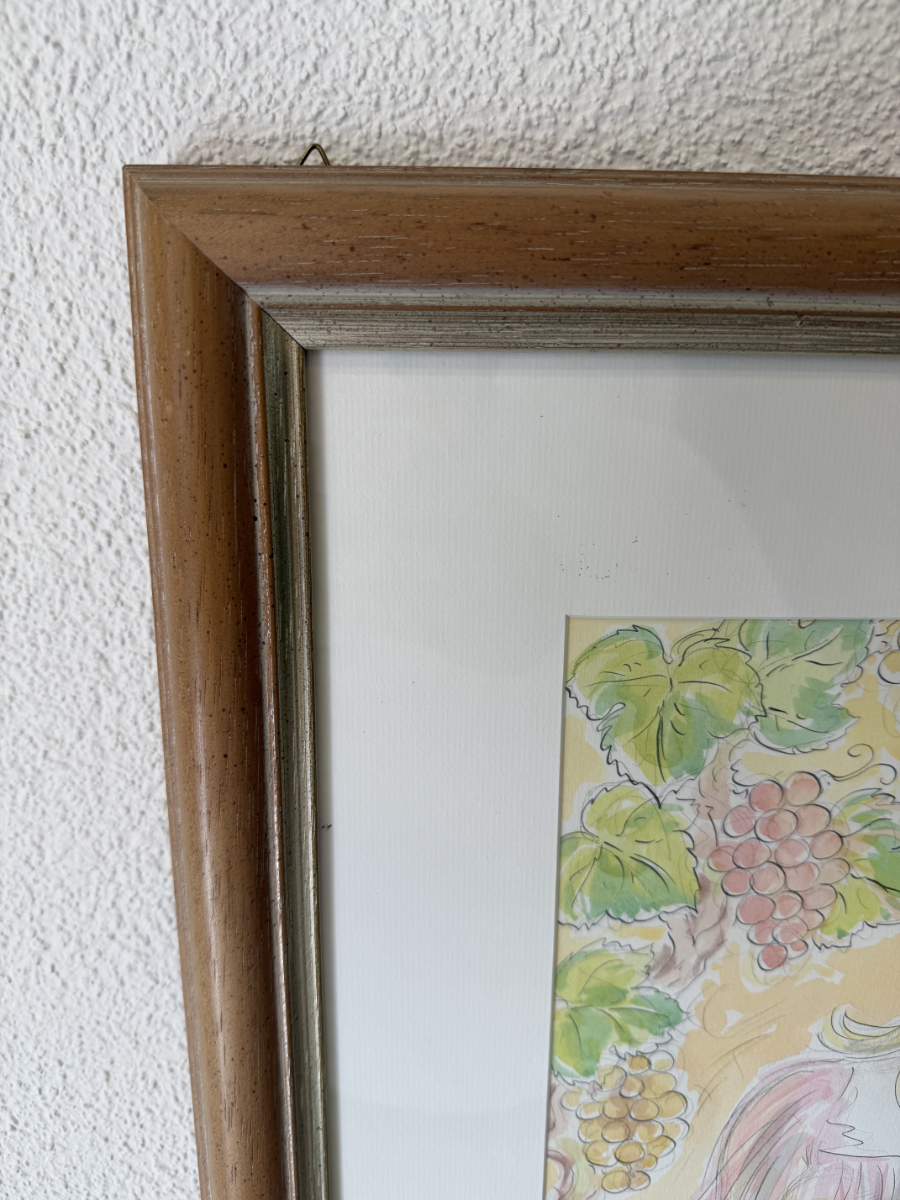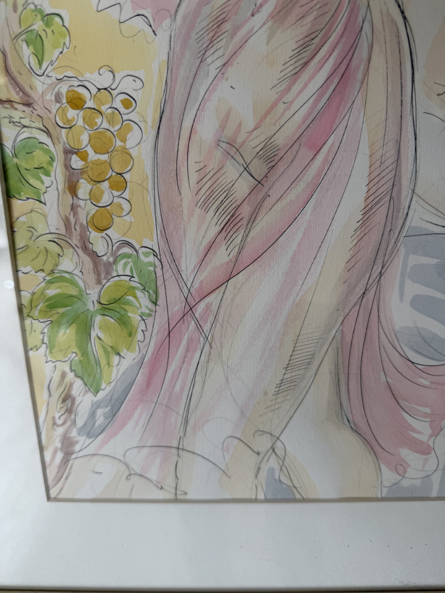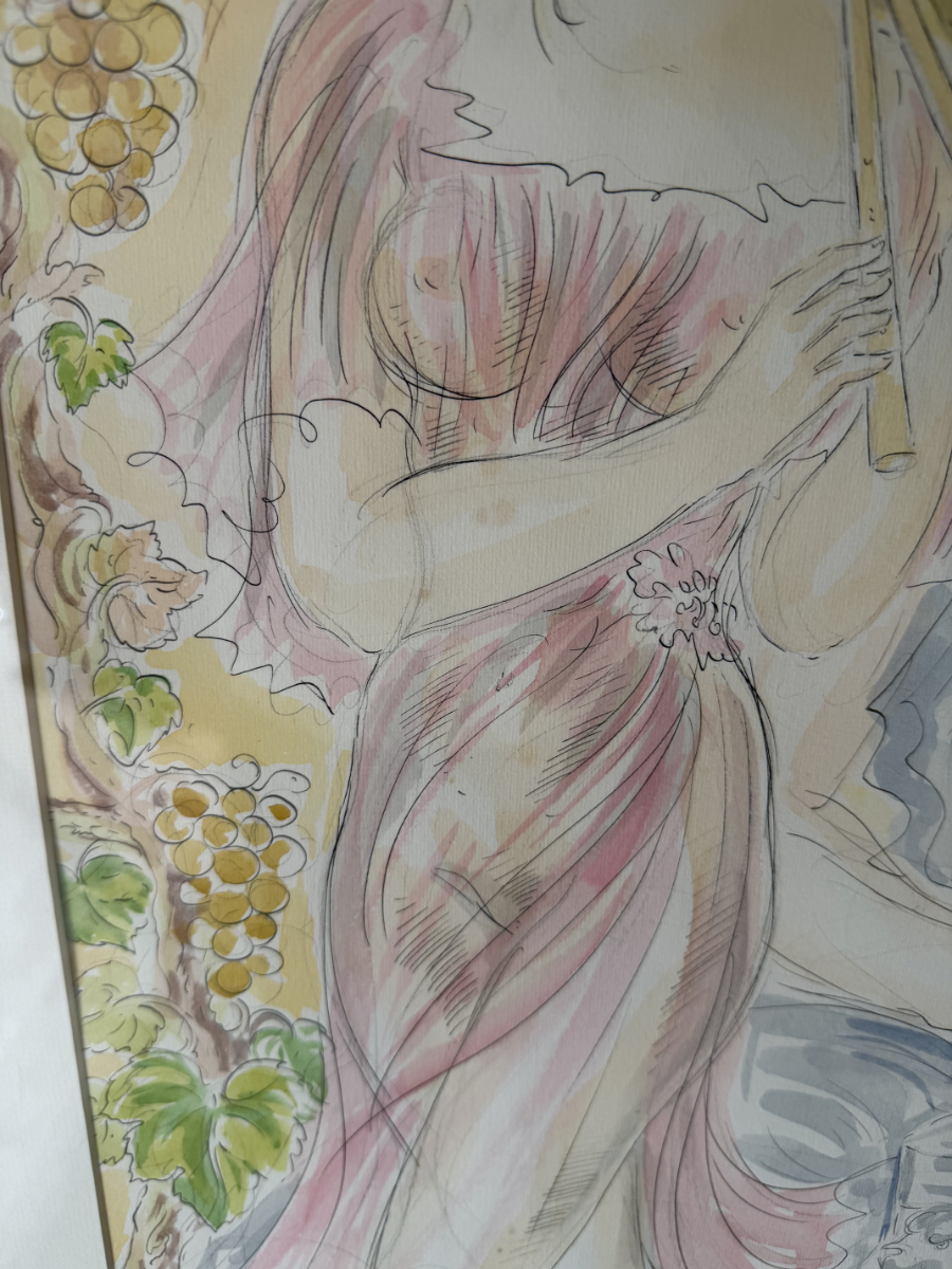 Ein signiertes Aquarell der Schweizer Künstlerin Simone Erni (geb. Fornara) aus dem Jahr 1994. Die Darstellung zeigt eine klassisch anmutende Szene: eine Frau mit Doppelflöte und ein bärtiger Mann mit Traubenkranz und Weinbecher. Weinreben im Hintergrund schaffen eine warme, mediterrane Stimmung. Das Bild kombiniert feine Tuschelinien mit transparenten Aquarellfarben in Rosa, Grün, Ocker und Hellblau.