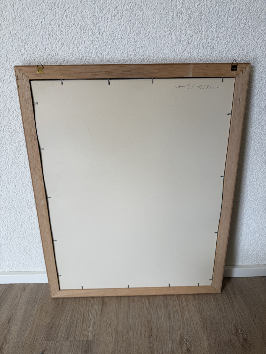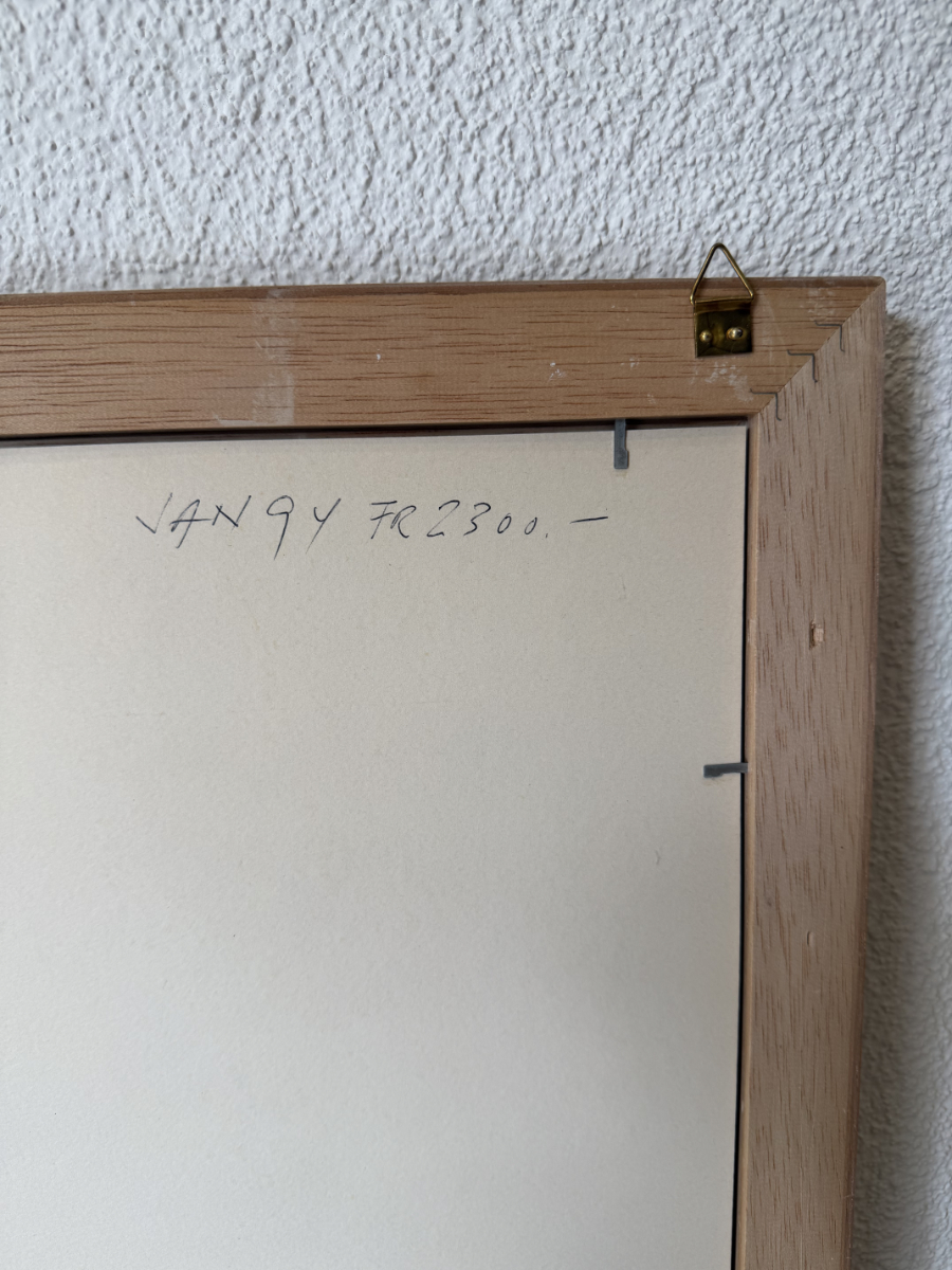 Das Blatt ist in einem dezenten Holzrahmen mit Passpartout und Glas präsentiert. Auf der Rückseite ist eine handschriftliche Notiz „Jan 94 Fr 2300.–“ erkennbar, vermutlich ein früherer Preisansatz.