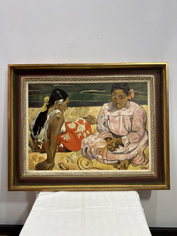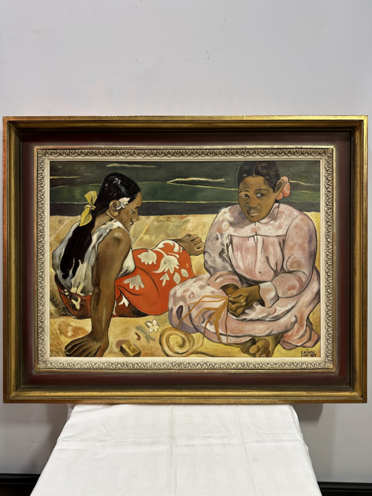 Dieses farbintensive Ölbild stammt von Erwin Künzli (1925–2023) und zeigt eine meisterhafte Nachbildung des bekannten Motivs „Tahitianische Frauen am Strand“ (Femmes de Tahiti) von Paul Gauguin aus dem Jahr 1891. Zwei Frauen in traditioneller Kleidung sitzen in ruhiger, tropischer Umgebung am Sandstrand – eine Szene voller Ruhe, Symbolik und Harmonie.