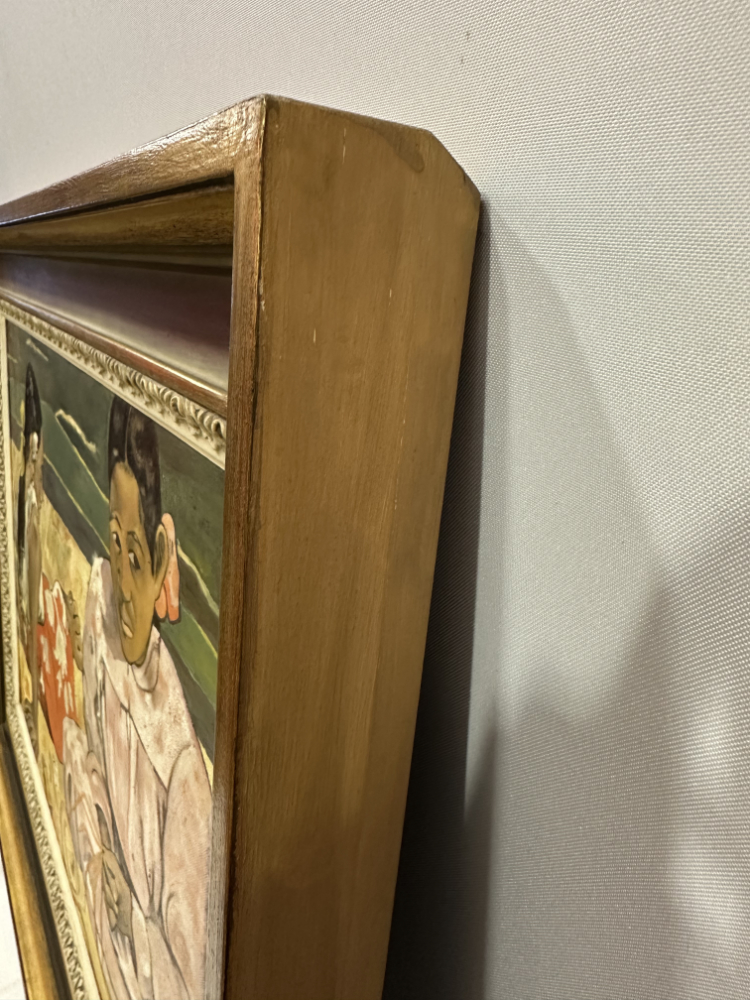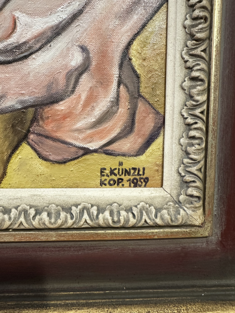 Künzli hat das Werk in Öl auf Leinwand ausgeführt und die warme Farbigkeit Gauguins eindrucksvoll eingefangen. Das Zusammenspiel aus erdigen Hauttönen, dem kräftigen Rot des Pareos und dem sanften Rosa der Kleidung schafft eine ausgewogene, lebendige Komposition. Die Signatur E. Künzli Kop. 1959 unten rechts verweist auf die Entstehung als kunstvolle Kopie aus den späten 1950er-Jahren.