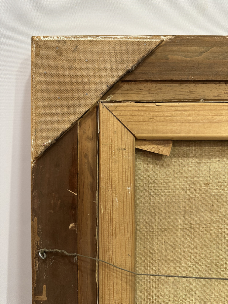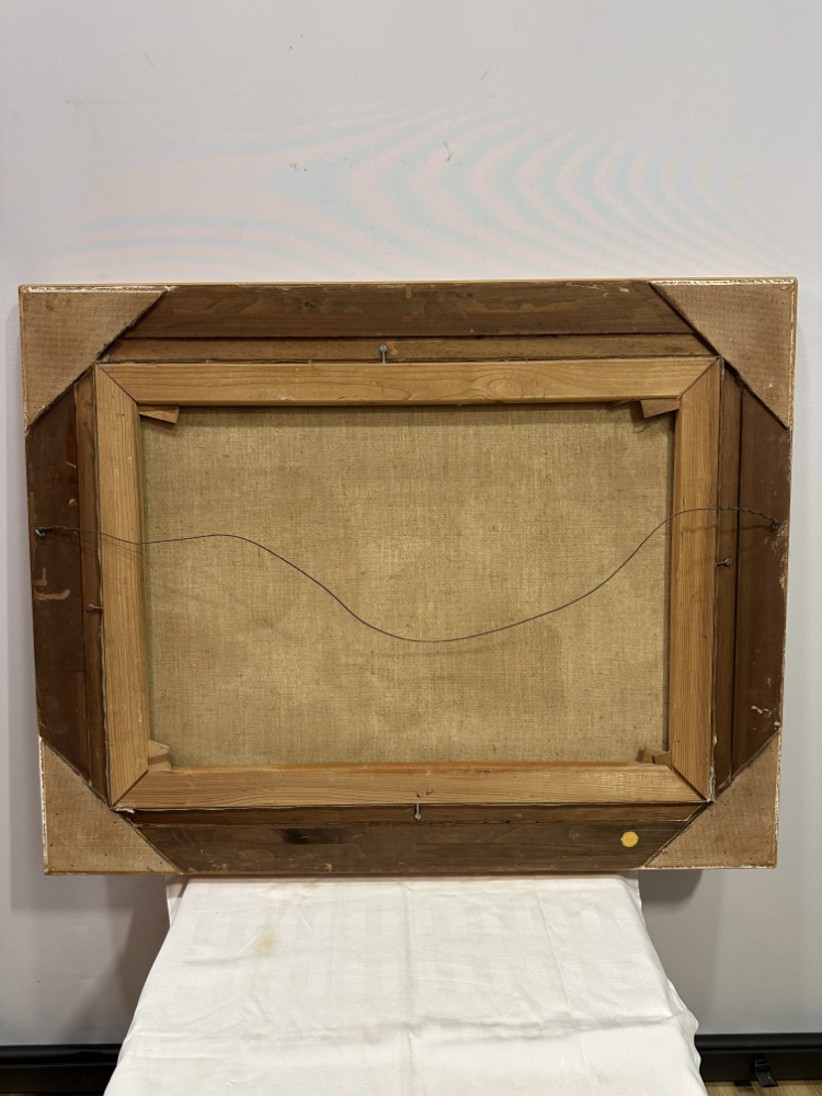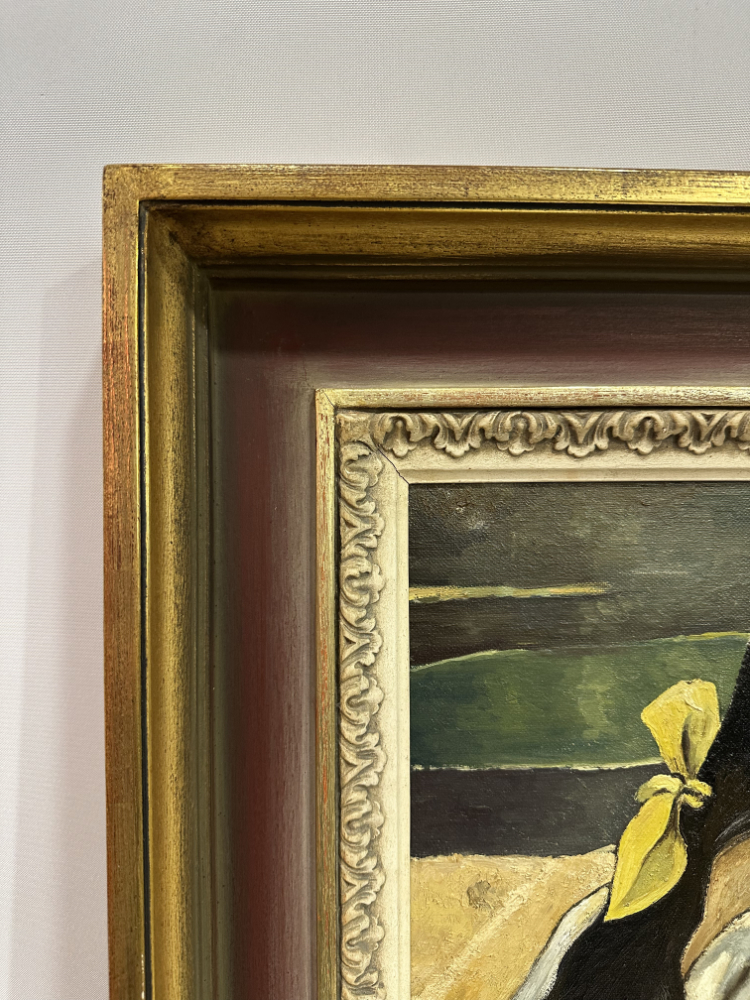 Das Gemälde ist in einem hochwertigen, vergoldeten Holzrahmen mit strukturierter Innenleiste gefasst, der dem Werk Tiefe und Ausdruck verleiht.