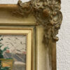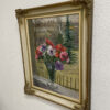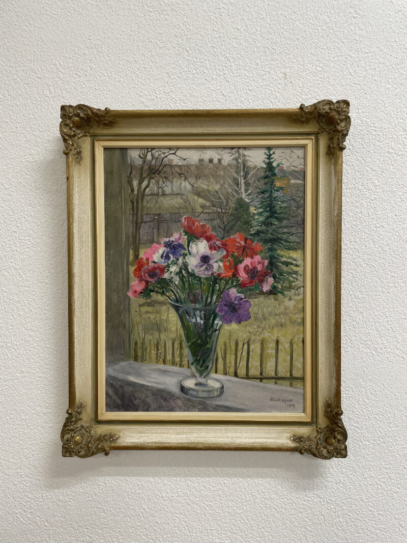 Ein farbstarkes Blumenstillleben mit feinem Blick nach draussen: In der Glasvase auf der Fensterbank stehen rote, rosa und violette Blüten dicht zusammen, dahinter eine ruhige Landschaft mit Zaun, Bäumen und Häusern. Der Pinselauftrag ist sichtbar und lebendig, die Farben wirken warm und ausgewogen. Unten rechts ist das Werk signiert und datiert Olga Koch 1939. Gemalt wurde in Öl auf Karton. Der reich verzierte Holzrahmen in Goldoptik mit ornamentalen Ecken fasst das Bild harmonisch ein und verleiht ihm eine wertige Präsenz an der Wand.