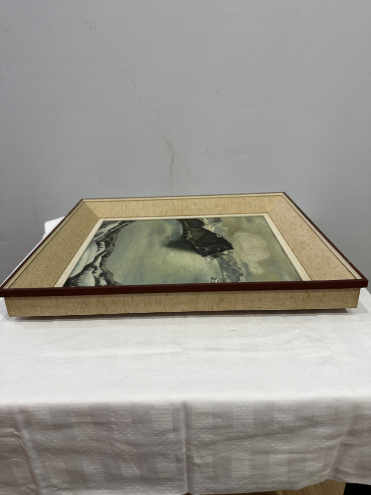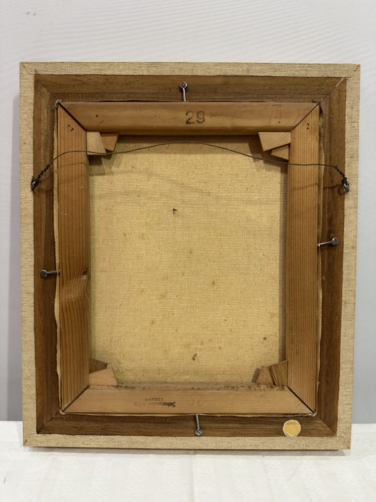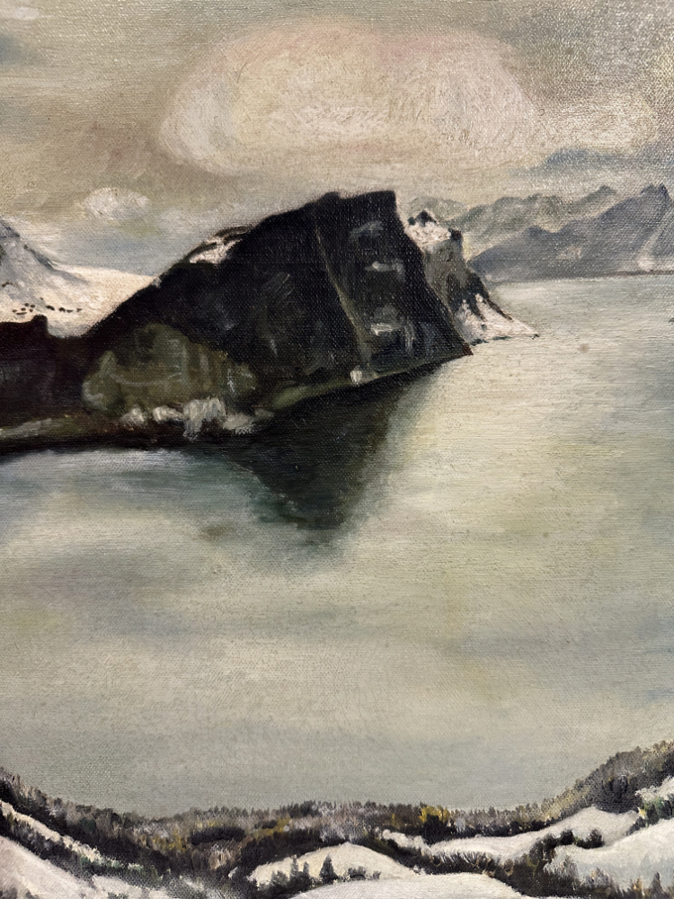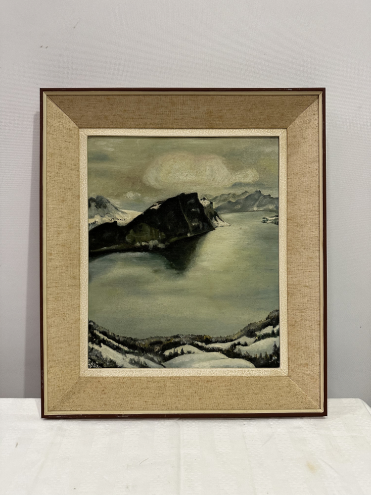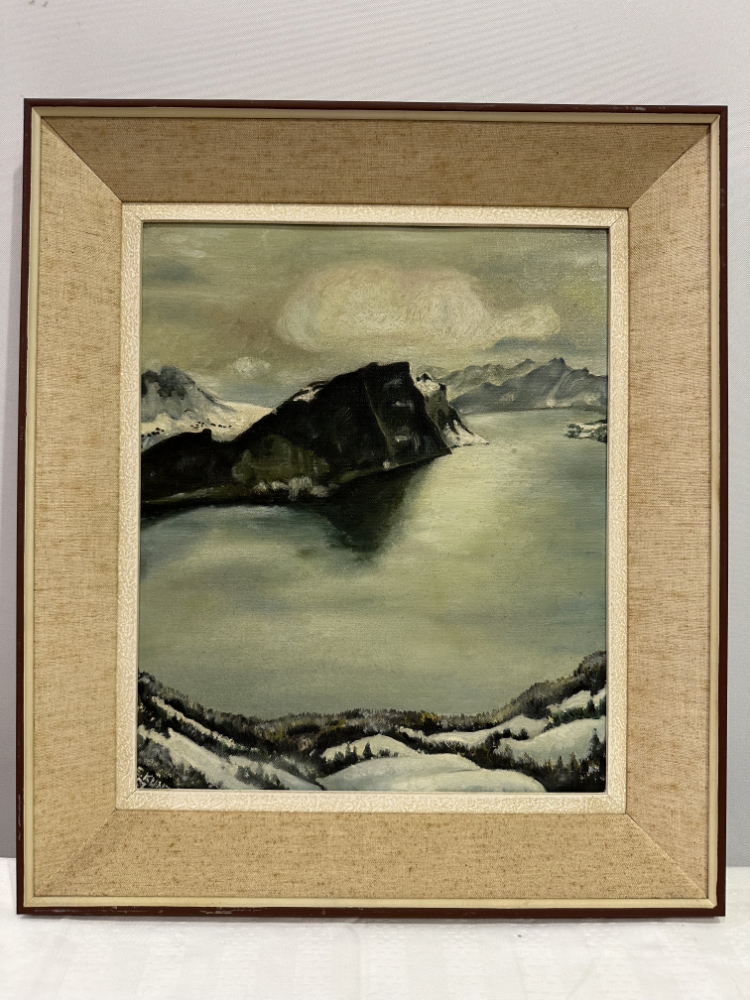 Diese stimmungsvolle Ölmalerei zeigt eine verschneite Alpenlandschaft mit ruhiger Wasserfläche und sanft verhüllten Gipfeln im Hintergrund – vermutlich den Vierwaldstättersee mit umliegenden Bergketten. Das Werk wurde in den 1950er-Jahren von Erwin Künzli nach einem Motiv von Otto Landolt (1889–1951) ausgeführt und verbindet klassische Schweizer Landschaftsmalerei mit einer zurückhaltenden Farbgebung in Grau-, Grün- und Weissnuancen. Der warme Ton des Leinenrahmens unterstreicht die winterliche Ruhe der Szene.